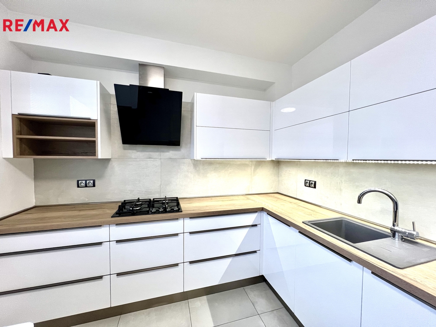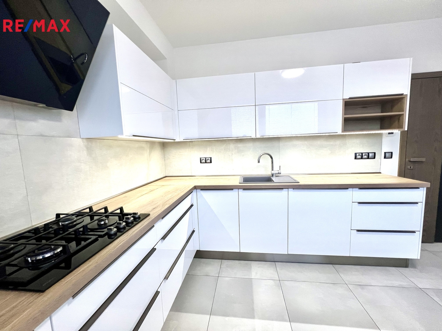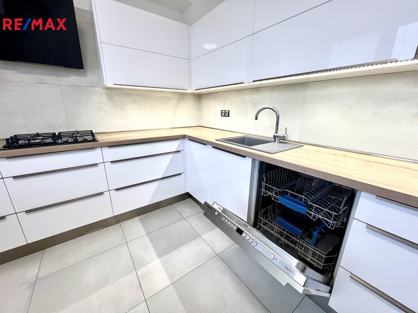 - kuchyně v provedení bílý lesk s kvalitními výsuvy, s vestavěnými spotřebiči a digestoří,