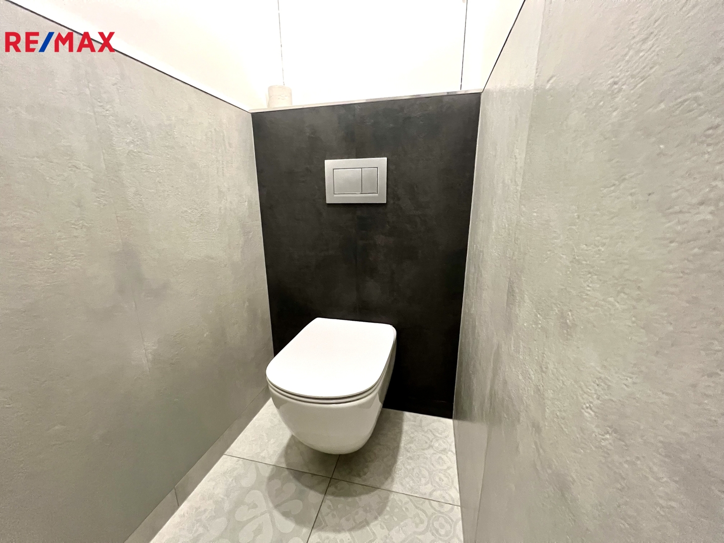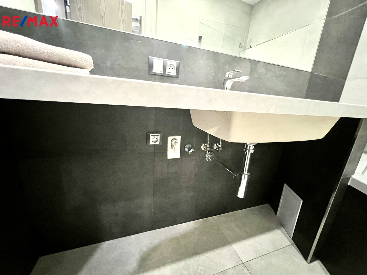 - koupelna s velkoformátovým obložením, vana se zástěnou, umyvadlo s mramorovou deskou, velké nemlžící se zrcadlo, otopný žebřík,