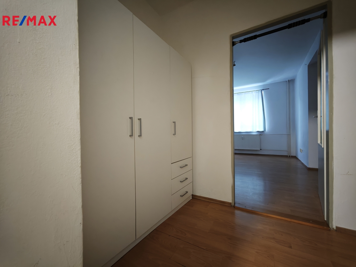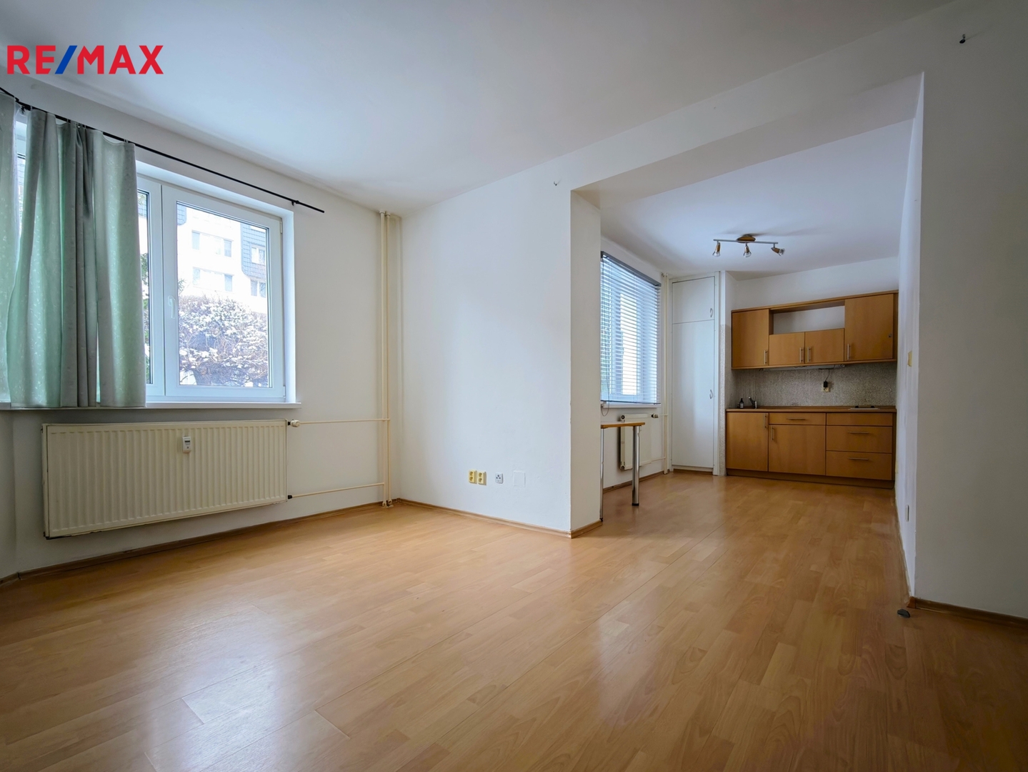 Pokoj s kuchyňským koutem, předsíň, prostorná koupelna s vanou + WC.