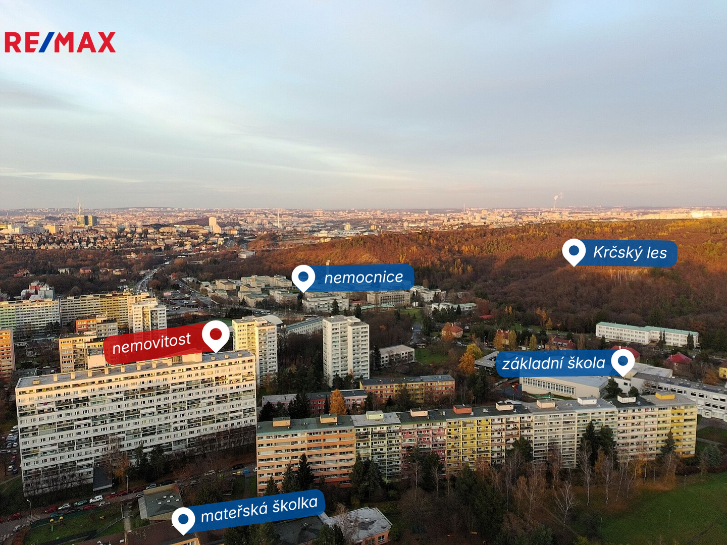 Lokalita Krče v sobě spojuje výbornou dopravní dostupnost s bezprostřední blízkostí přírody. Přímo naproti domu se nachází mateřská škola, v docházkové vzdálenosti pak základní škola a kompletní síť obchodů (Lidl, Albert, Jysk, Pepco). Dopravní spojení zajišťuje autobusová zastávka vzdálená necelých 300 metrů, odkud se během několika minut dostanete na metro C – Kačerov. Významným benefitem pro budoucí zhodnocení nemovitosti je plánovaná výstavba nové linky metra D, jejíž stanice bude umístěna v docházkové vzdálenosti od domu.