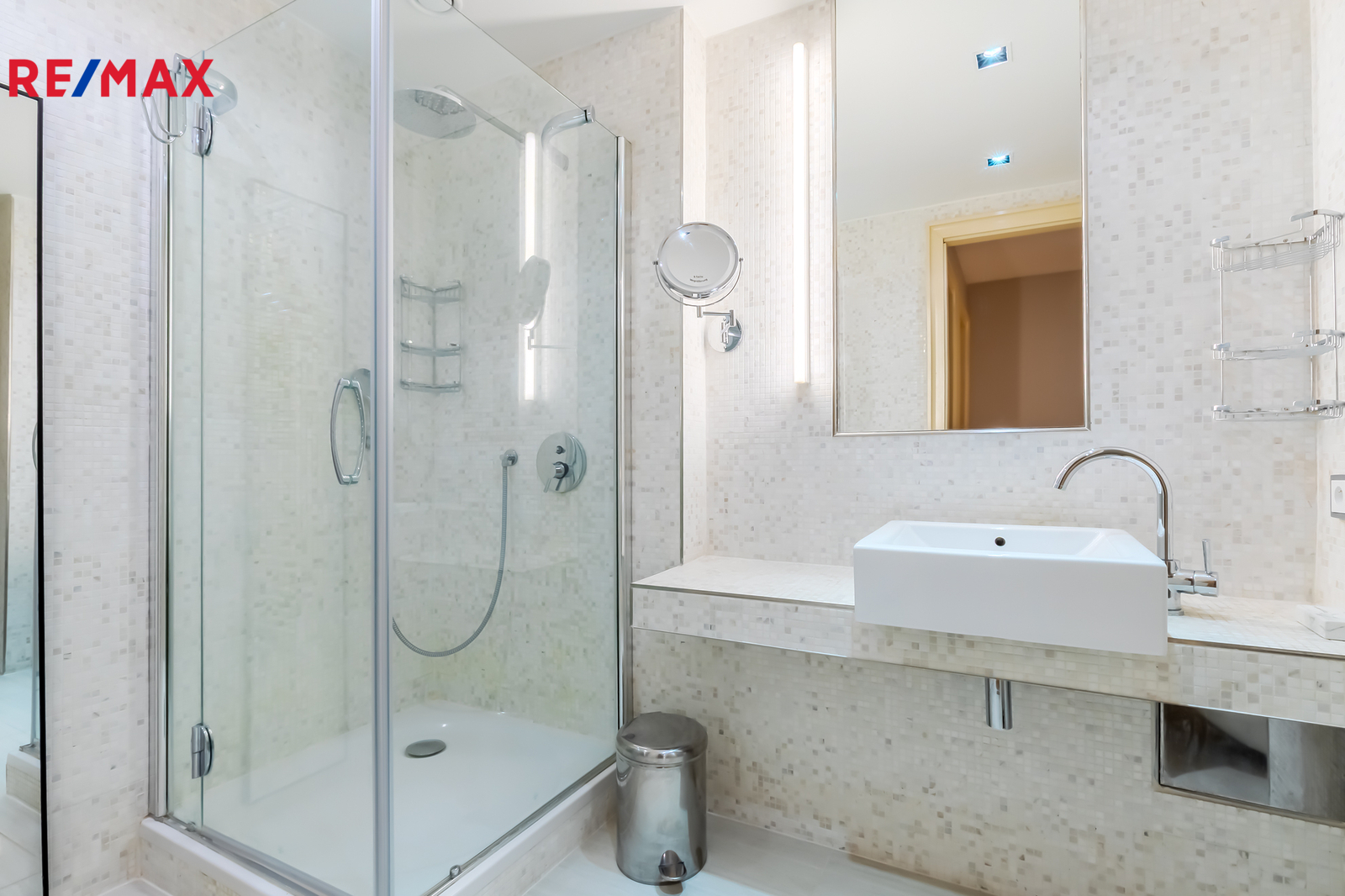 moderní kuchyňská linka se spotřebiči (indukce, trouba, mikrovlnná trouba, myčka, lednice s mrazákem), sušička, pračka. V bytě jsou dvě pohovky, konferenční stolek a další nábytek, který je součástí bytu, ale po dohodě může být odstraněn dle preferencí nájemníka.