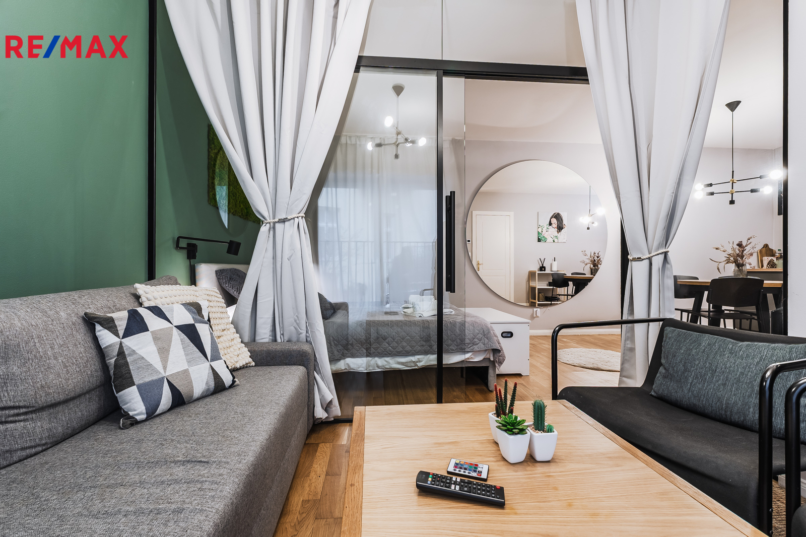 -Designová prosklená příčka, která elegantně odděluje spací část a zvětšuje komfort prostoru