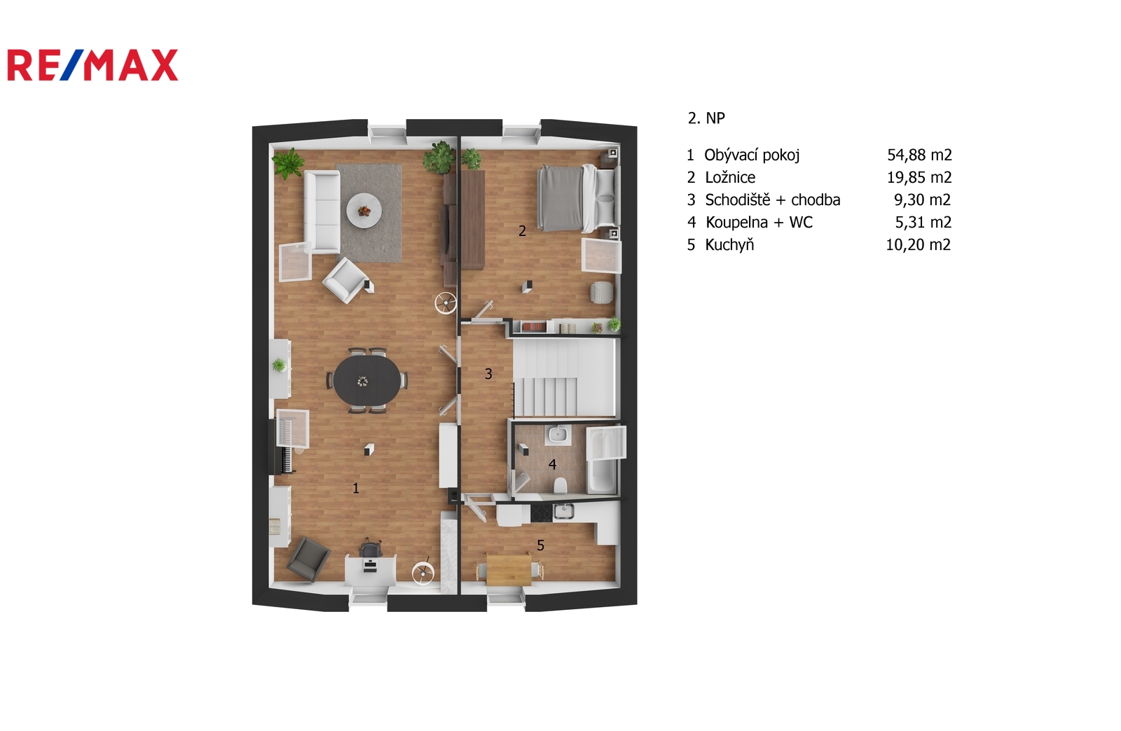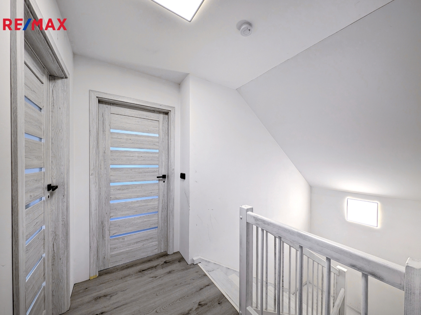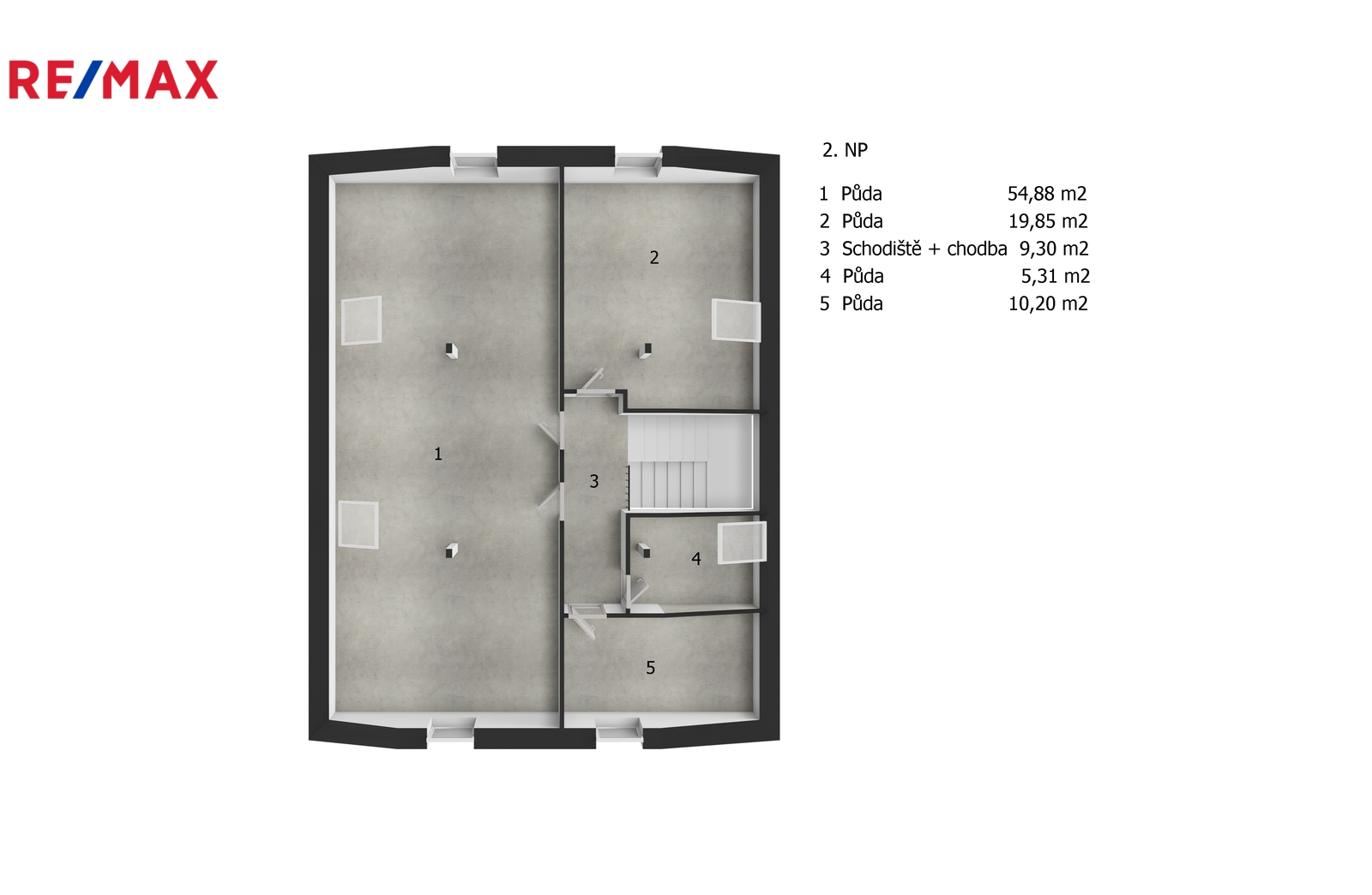 Horní patro je aktuálně kolaudovaná jako půda a je ve fázi rekonstrukce na obytný prostor. V 2NP se nachází zateplení a jsou zde umístěna okna včetně těch střešních. Lze zde vybudovat až tři obytné místnosti a samostatnou koupelnu podle vlastních představ. Druhé patro nabízí možnost až 90 m².