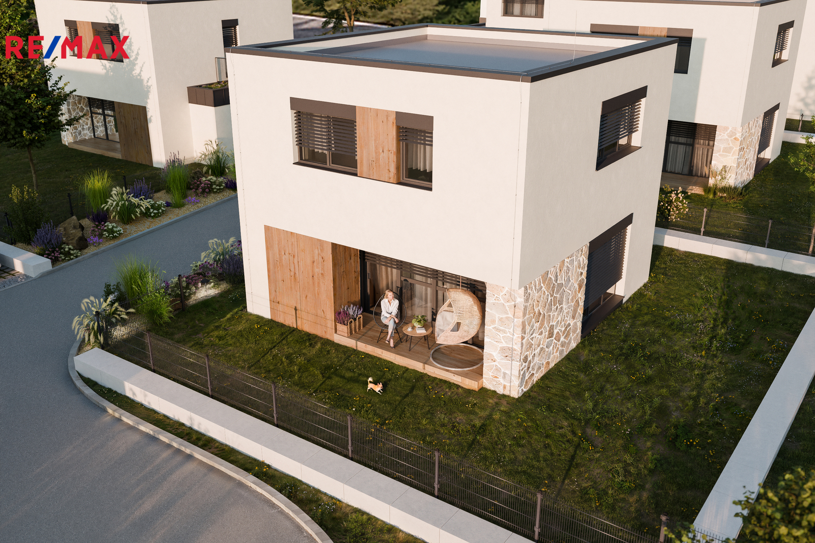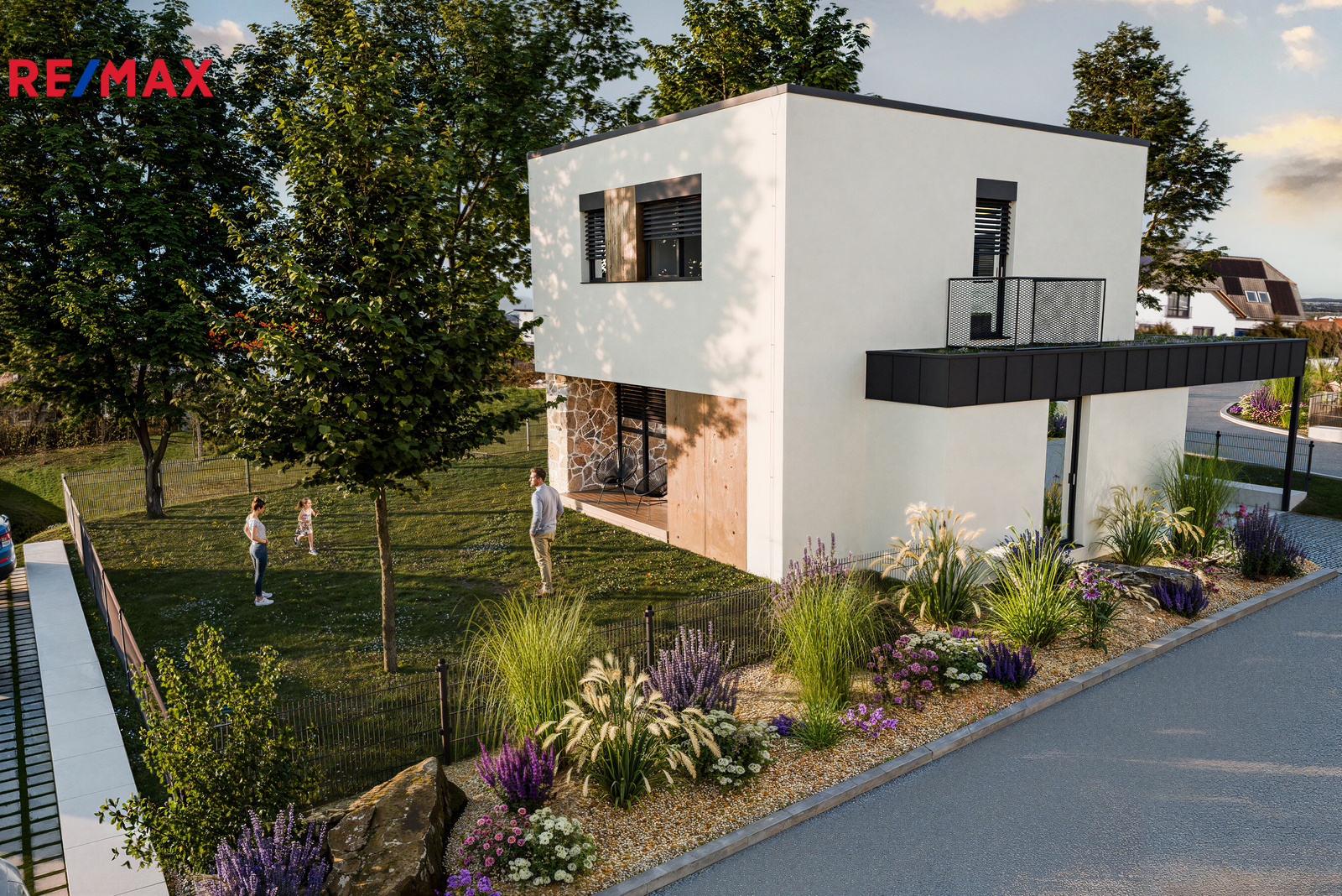 Exteriér domu je v ceně a vytváří příjemnou atmosféru od prvního dojmu. Součástí je upravená předzahrádka s okrasnou zelení, solitérním stromem, kameny a osvětlením se soumrakovým čidlem. Dominantní kamenné obložení se vstupní brankou odděluje přední část pozemku od zahrady. Kryté parkovací stání je vybaveno třífázovou zásuvkou a celý pozemek je oplocen svařovaným antracitovým plotem, který poskytuje soukromí i bezpečí.