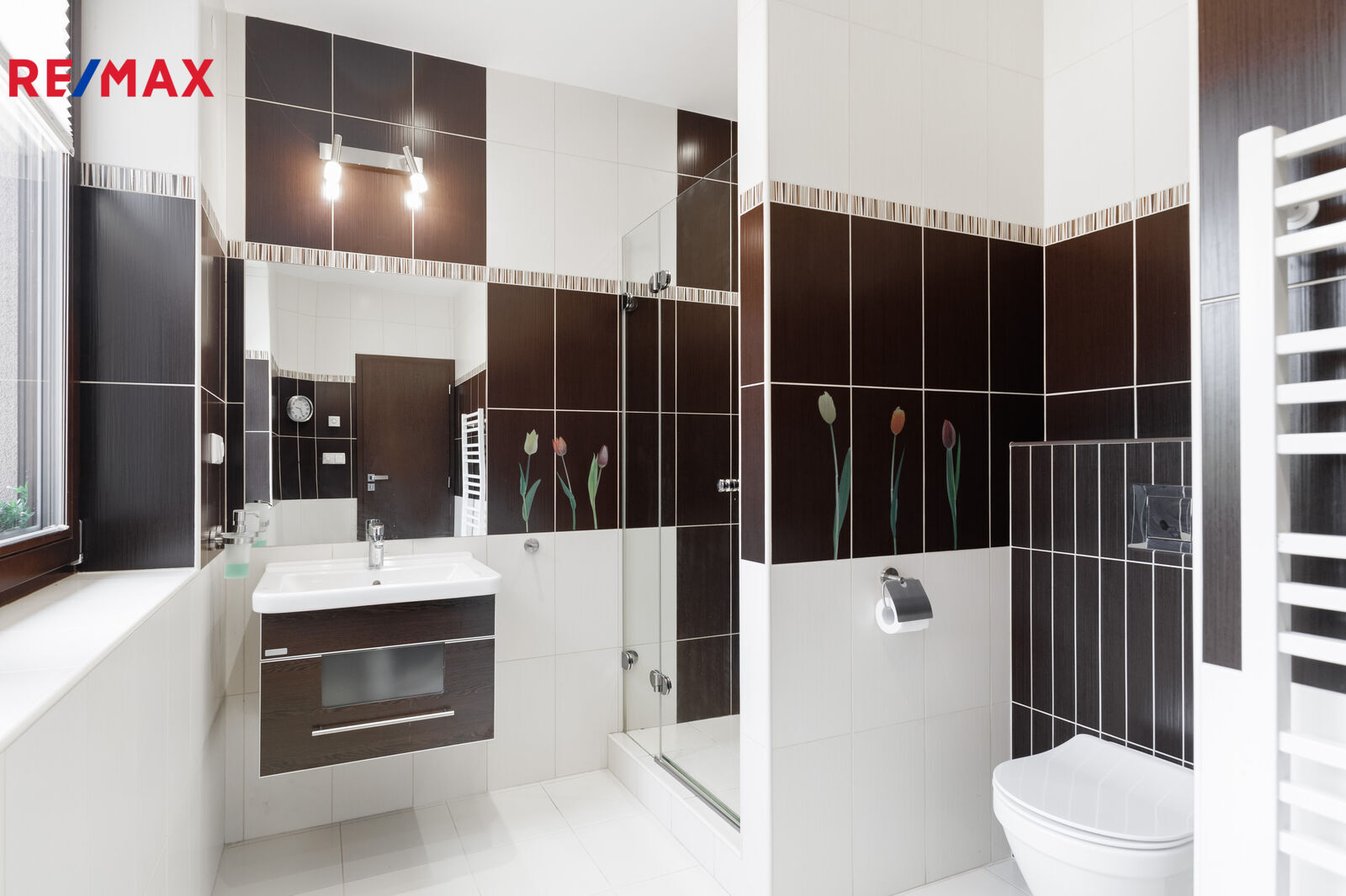 Při stoupání do prvního patra se nám nabídne prostorná chodba se vstupy do 3 ložnic, z nichž jedna z nich lze rozdělit na dva samostatné pokoje. Součástí každé ložnice je šatna s úložným prostorem. V prvním patře najdeme další koupelnu, tentokrát s vanou i se sprchovým koutem, dále pak samostatné WC.