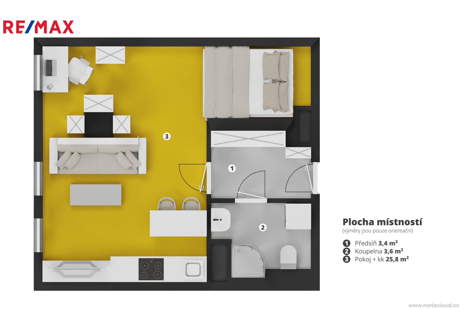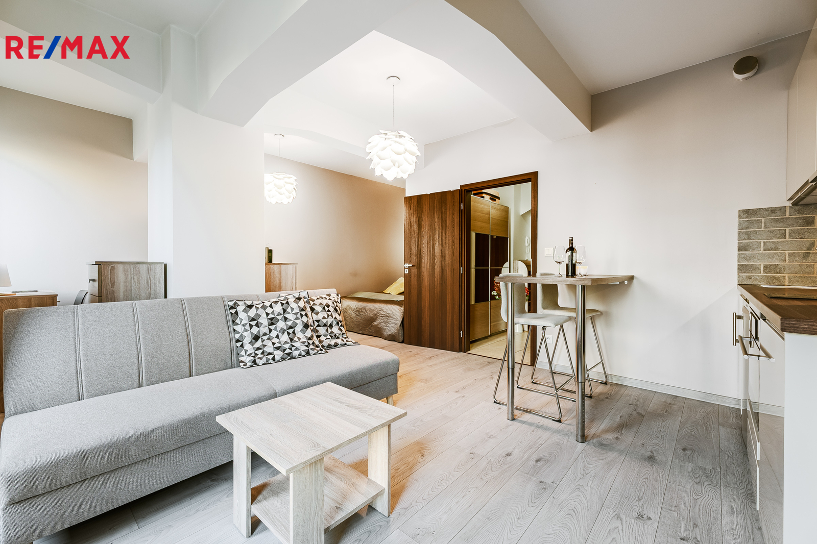 Byt se nachází ve 3. nadzemním podlaží a nabízí dobře řešený otevřený prostor s dostatkem denního světla díky velkým francouzským oknům. Okna směřují do zeleného vnitrobloku. Žádný rušný provoz, jen příjemné denní světlo a soukromí. Byt tvoří hlavní obytný prostor s oddělenou spací částí, předsíní a koupelnou. Součástí obývacího pokoje je moderní kuchyňská linka se spotřebiči, dining bar s elegantními židlemi, zónou pro TV a rozkládací pohovkou. Chytrá nika poskytuje soukromí pro spaní a je vybavena praktickými policemi. Koupelna je obložena moderními obklady a obsahuje sprchový kout. Je zde rovněž místo pro pračku. V předsíni jsou velké zrcadlové skříně s dostatečným úložným prostorem.