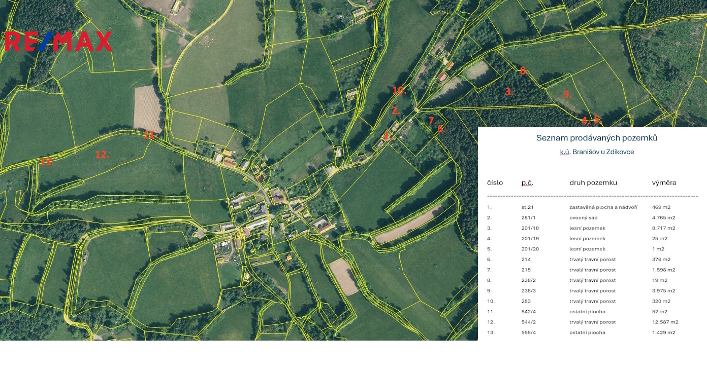 Předmětem prodeje je celkem 34.300 m2 pozemků na nichž se nachází vlastní objekt k bydlení ve funkčním celku se stodolou a navazující zahradou (celkem 5.200 m2), další pozemky - louky (20.300 m2) a lesy (8.800 m2).