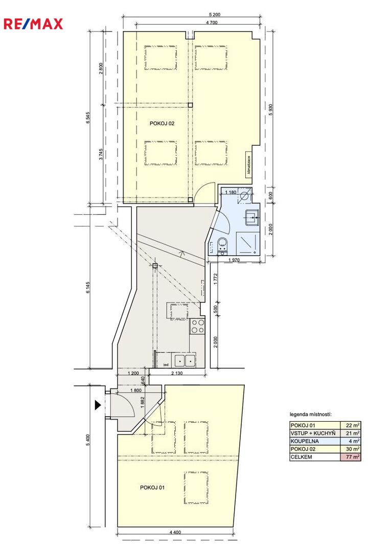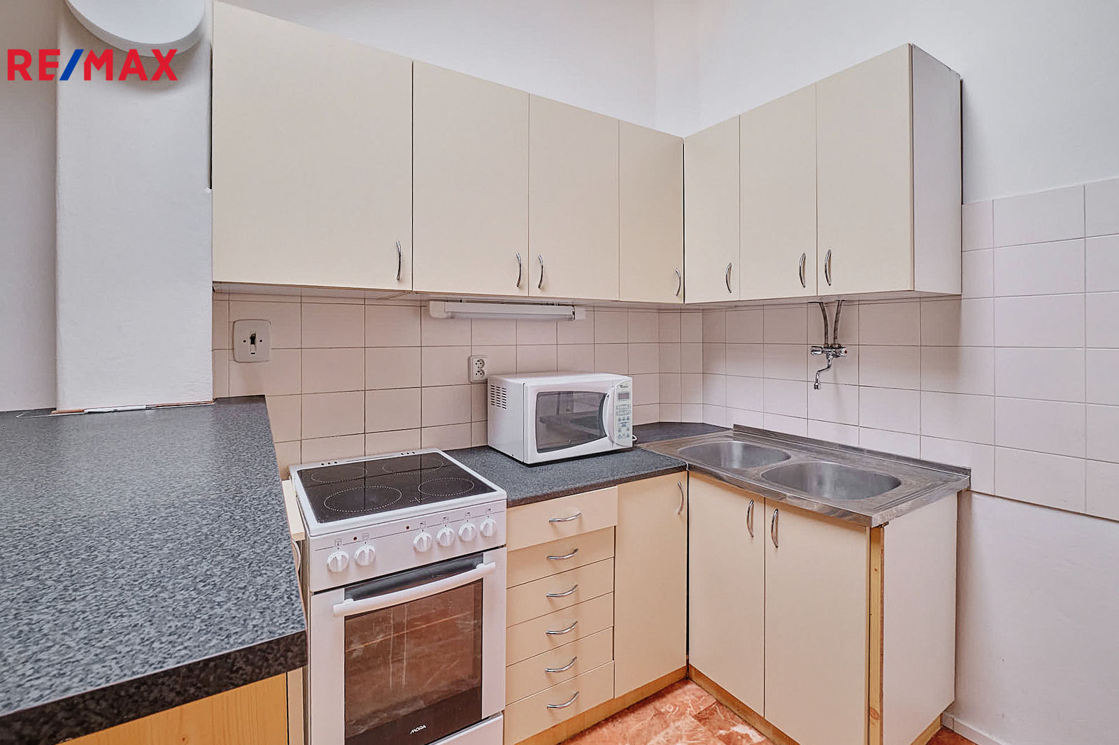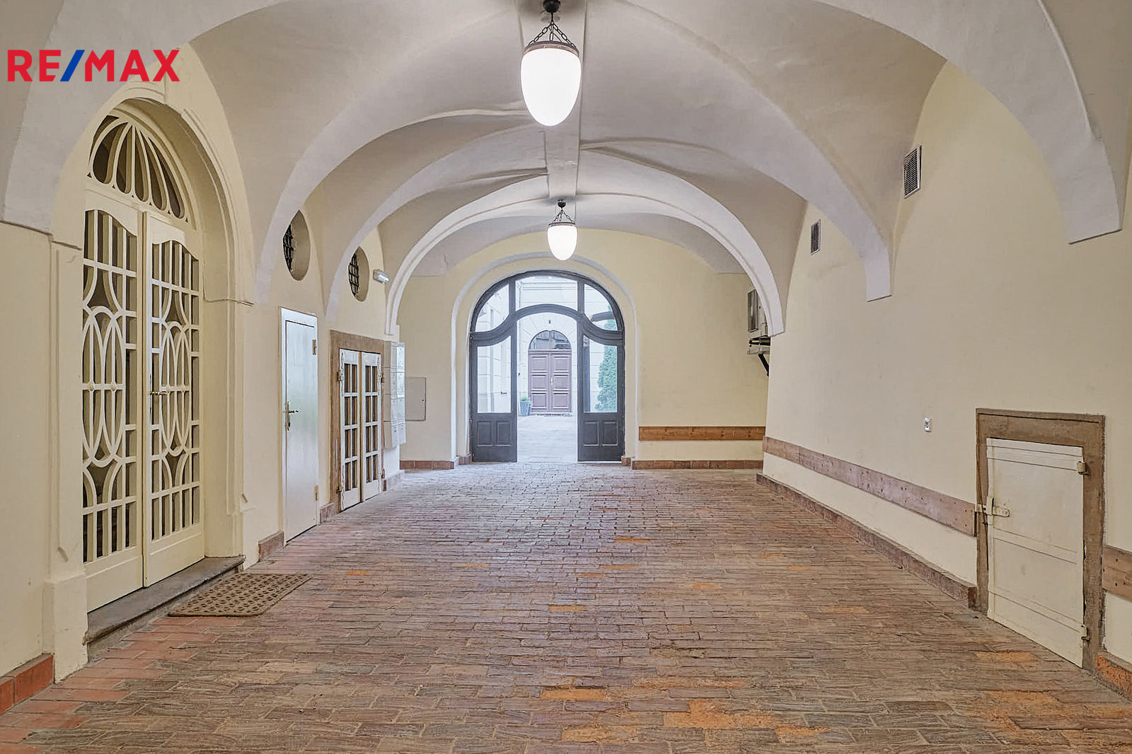 Jednotka se skládá ze vstupní předsíně, ze které dále vstoupíte do jednoho z pokojů a kuchyně s kuchyňskou linkou a barem. Na tu dále navazuje koupelna se sprchovým koutem a toaletou a další z pokojů. Oba pokoje jsou neprůchozí, mají střešní okna, jeden z nich je navíc klimatizován novou klimatizační jednotkou stejně tak jako prostor kuchyně. Nájemci je k dispozici klidné atrium v přízemí domu s posezením.