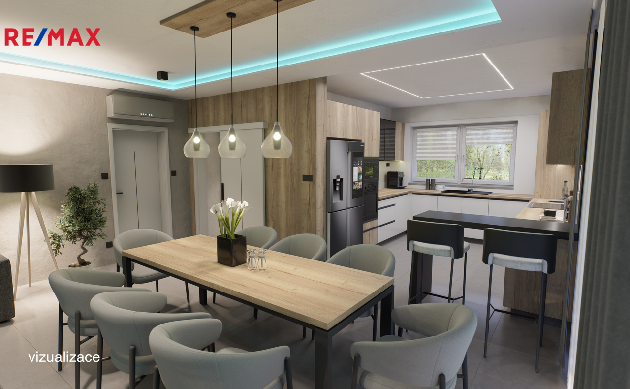 • přímý vstup z obývacího pokoje s kuchyní a jídelnou na zastřešenou terasu