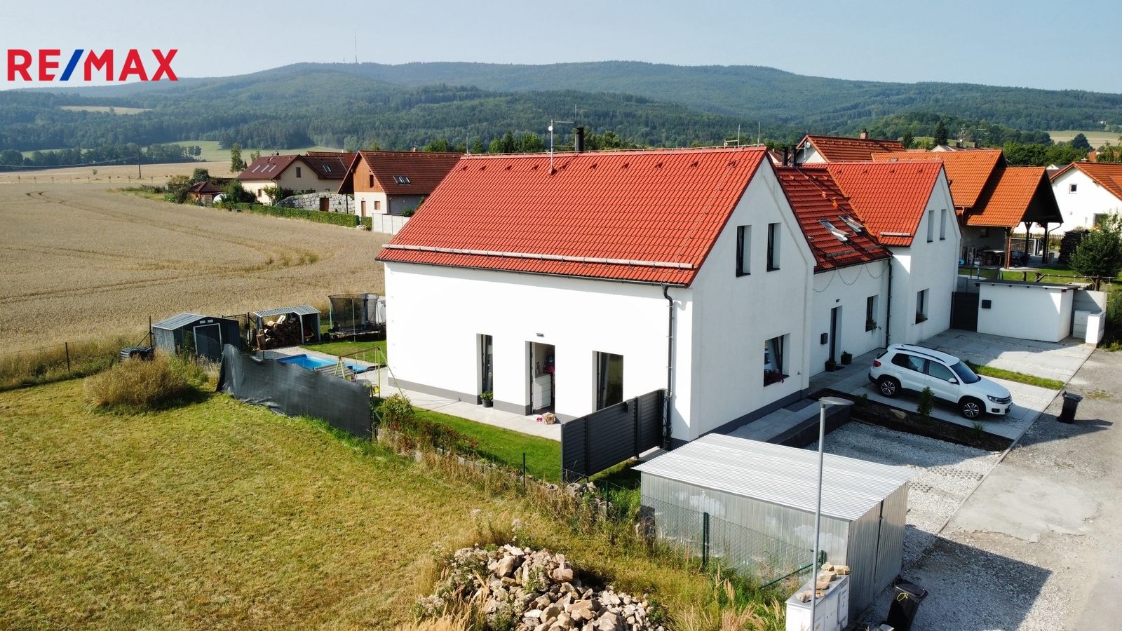Nabízíme k prodeji prostornou bytovou jednotku o dispozici 5+kk, která je součástí novostavby rodinného domu (rok výstavby 2020). Byt se nachází ve dvou podlažích a disponuje vlastní zahradou, terasou, venkovním bazénem a parkovacím stáním.