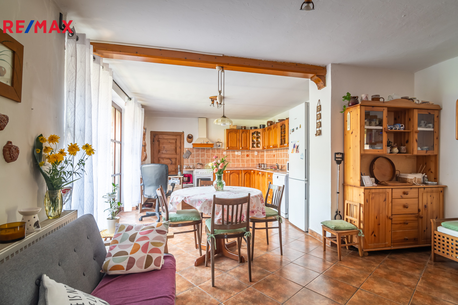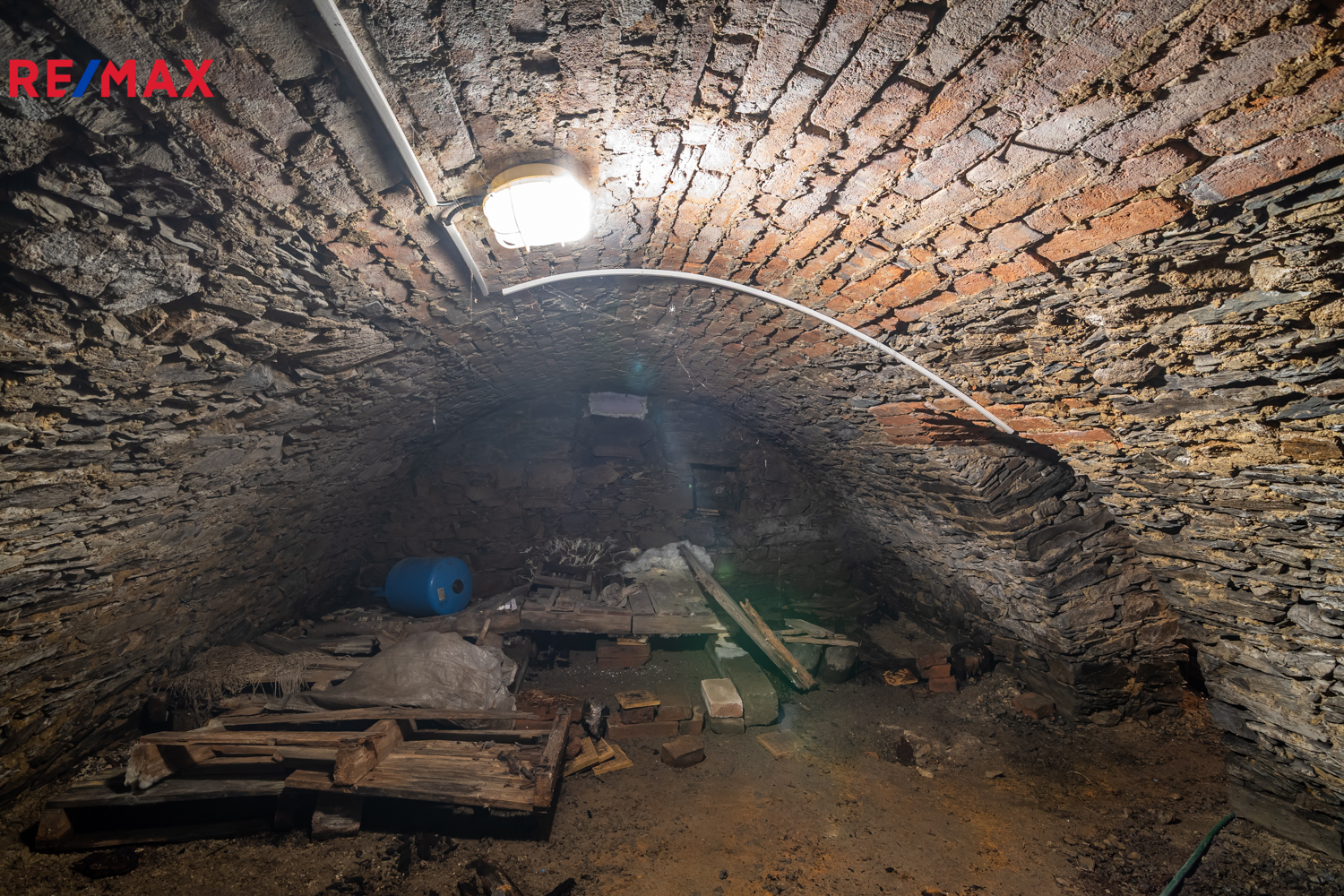Dům disponuje historickým kamenným sklepem s klenbou, který dodává nemovitosti autentický charakter. V přízemí se nachází vstupní hala, ze které je přístup do obývacího pokoje s krbovými kamny, koupelny s vanou a WC, a prostorné kuchyně s jídelnou. Z kuchyně vede vstup na terasu a dále do ložnice na jedné straně a do spižírny s průchozí technickou místností na straně druhé. Ze vstupní haly vede schodiště do podkroví, které je z poloviny obytné s velkou ložnicí a prostorem pro pracovnu či hernu. Druhá polovina podkroví je zateplená a připravená k dokončení včetně rozvedených sítí, což nabízí možnost dalšího rozšíření obytné plochy dle vlastních potřeb.