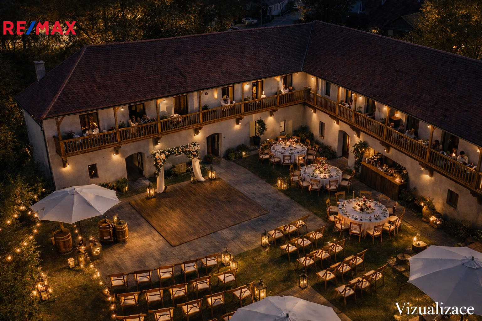 Uzavřený dvůr poskytuje maximální soukromí, klid a bezpečí – ideální pro kombinaci bydlení a podnikání.