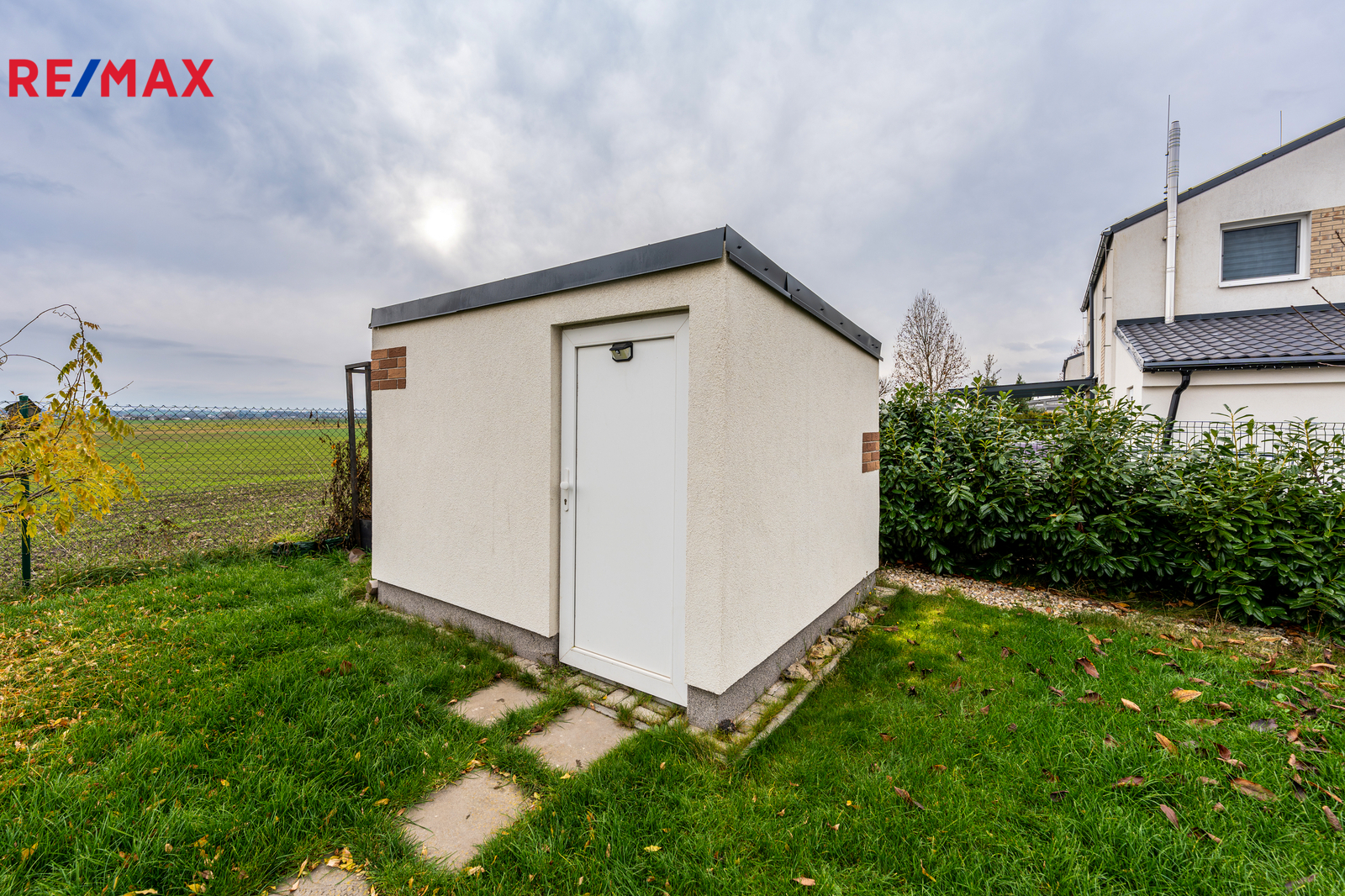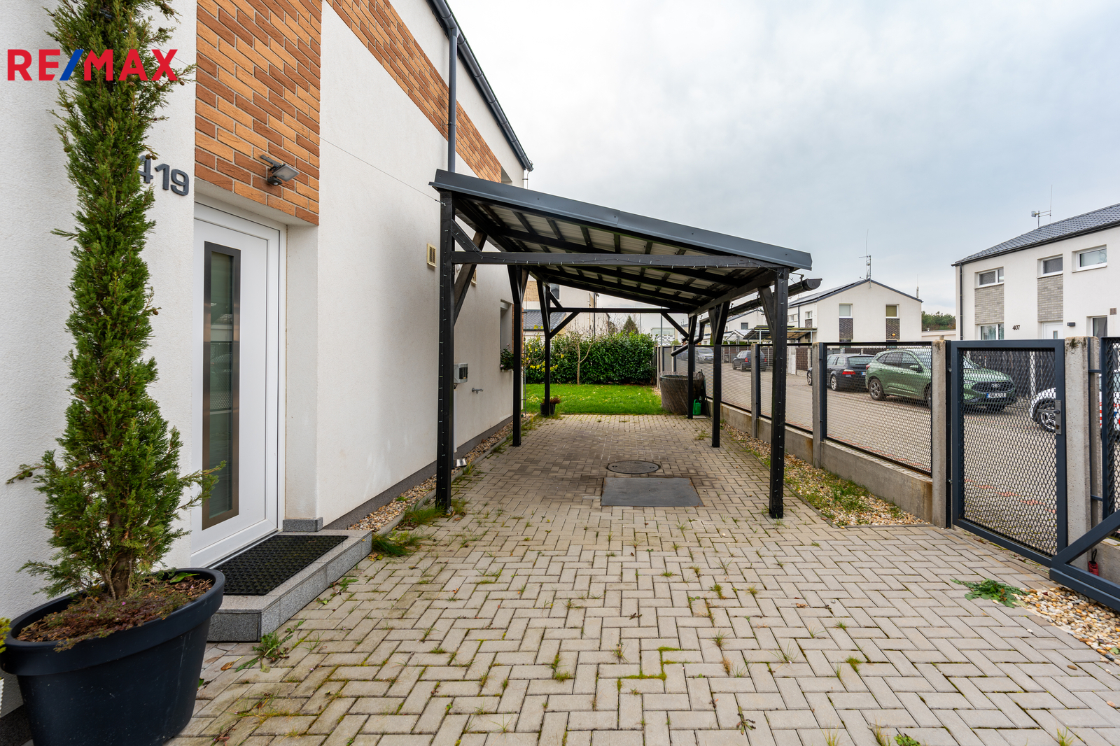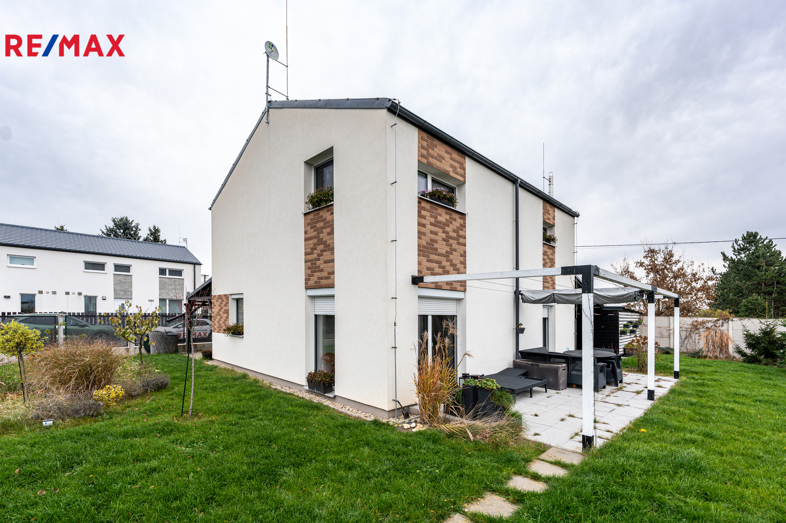 Dům je napojen na obecní vodu, elektřinu a tlakovou kanalizaci. Internet je řešen bezdrátově, plyn v lokalitě není. Parkování je komfortní — na vlastním pozemku lze zaparkovat 4 až 5 vozidel, další místa jsou k dispozici před domem. Orientace domu na východ, jih a západ zajišťuje dostatek světla po celý den. Součástí zahrady je také praktický zahradní domek, terasa, pergola a přístřešek na auta vč. dalšího úložného prostoru.