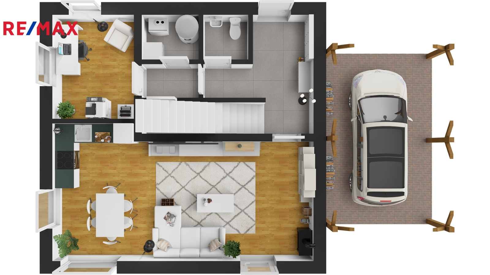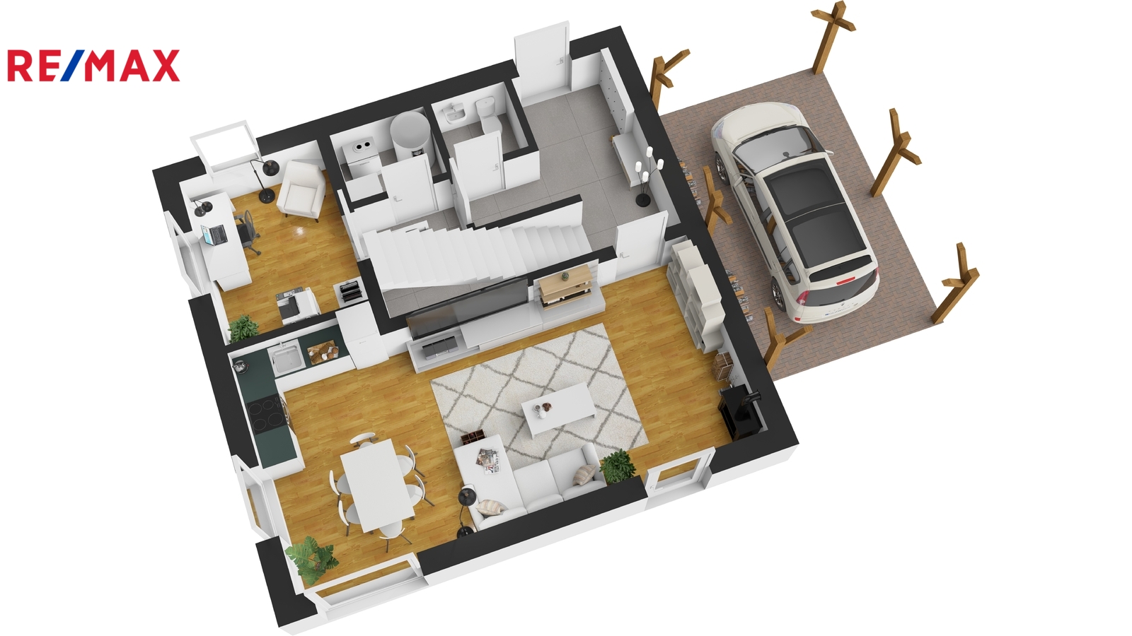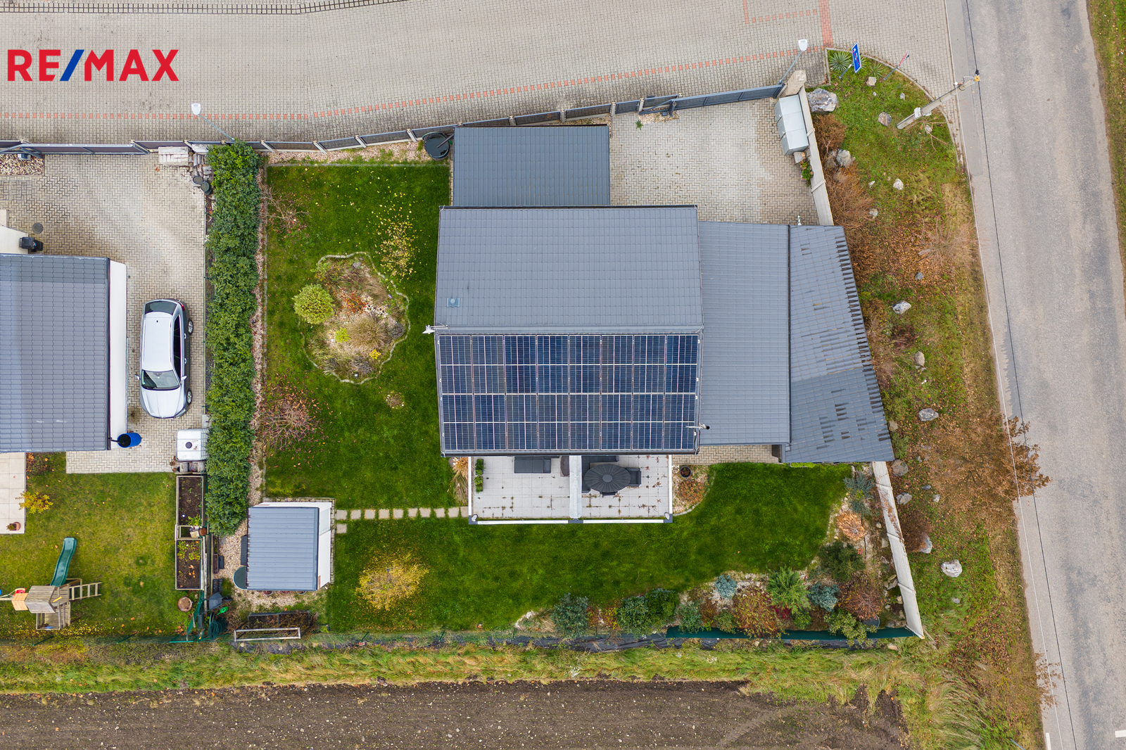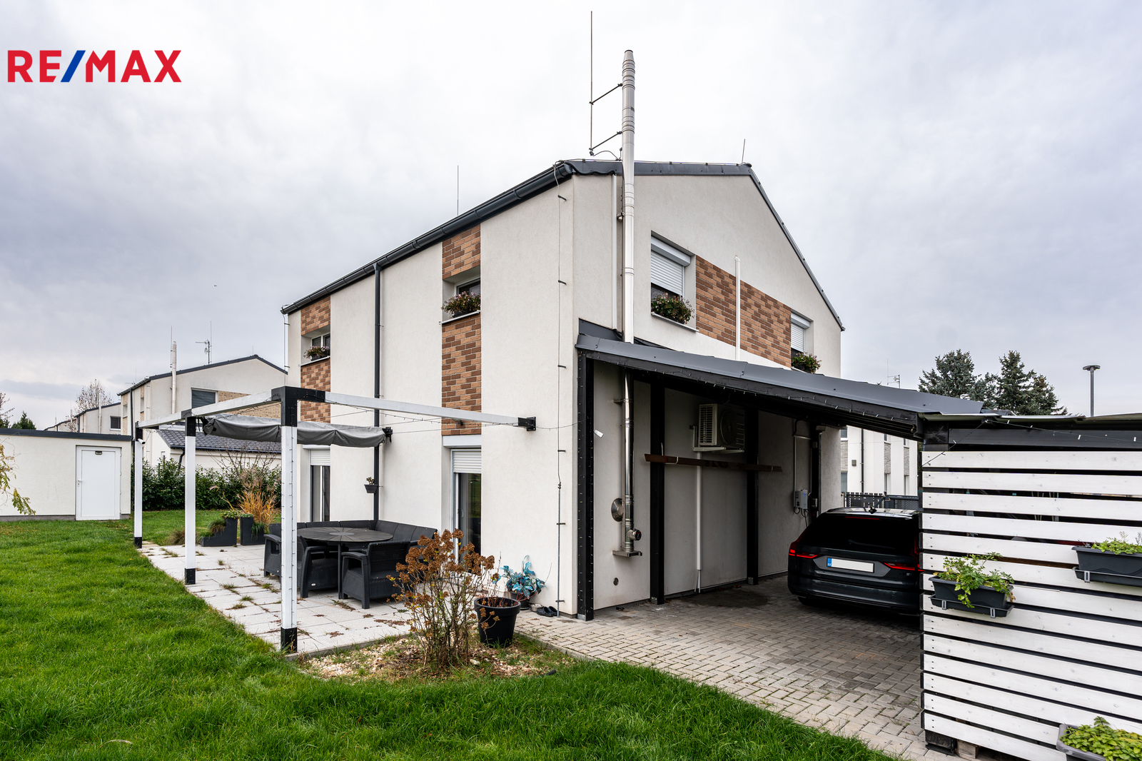 Dům je napojen na obecní vodu, elektřinu a tlakovou kanalizaci. Internet je řešen bezdrátově, plyn v lokalitě není. Parkování je komfortní — na vlastním pozemku lze zaparkovat 4 až 5 vozidel, další místa jsou k dispozici před domem. Orientace domu na východ, jih a západ zajišťuje dostatek světla po celý den. Součástí zahrady je také praktický zahradní domek, terasa, pergola a přístřešek na auta vč. dalšího úložného prostoru.