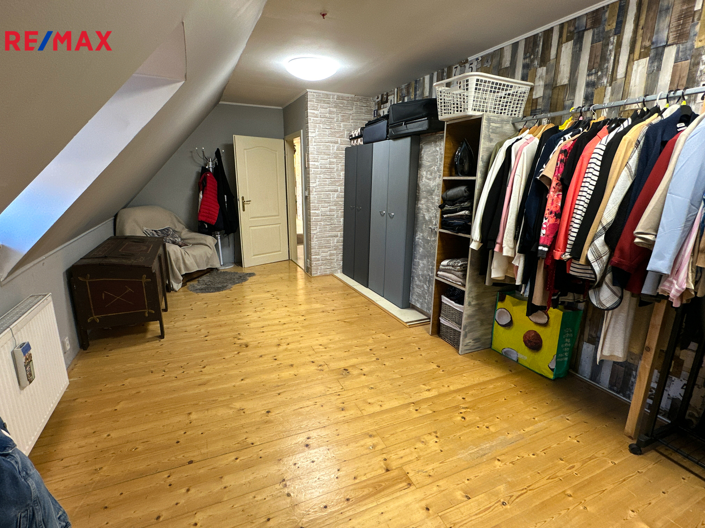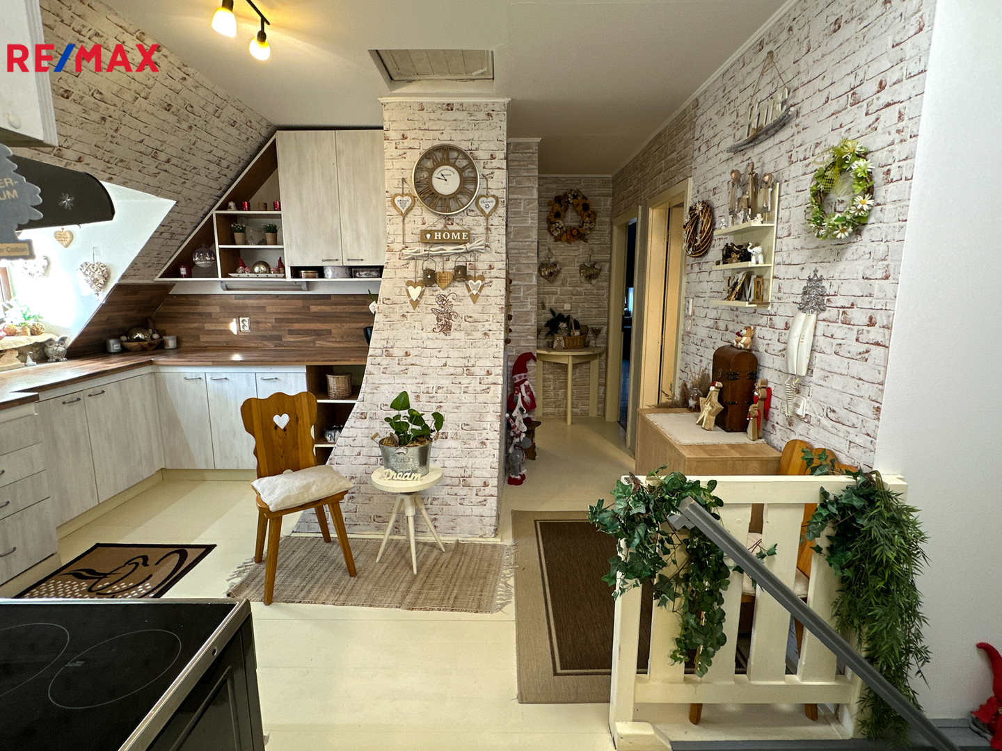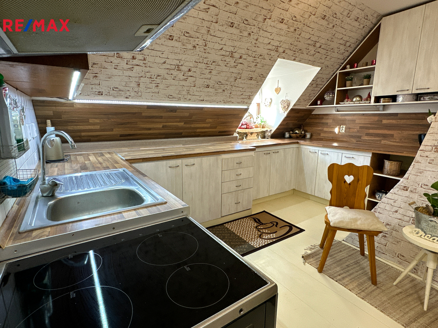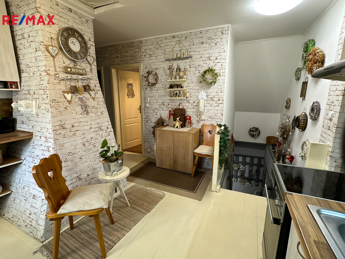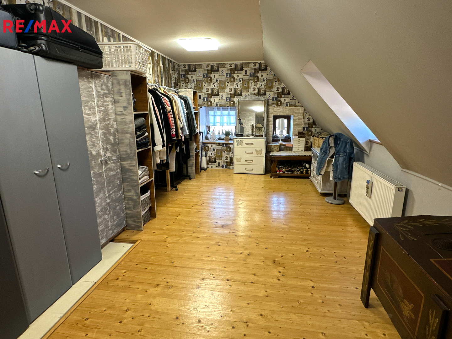 V horním patře se nachází kuchyně, chodba, čtyři obytné místnosti a dvě koupelny.