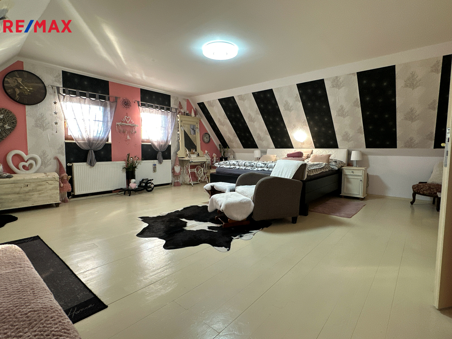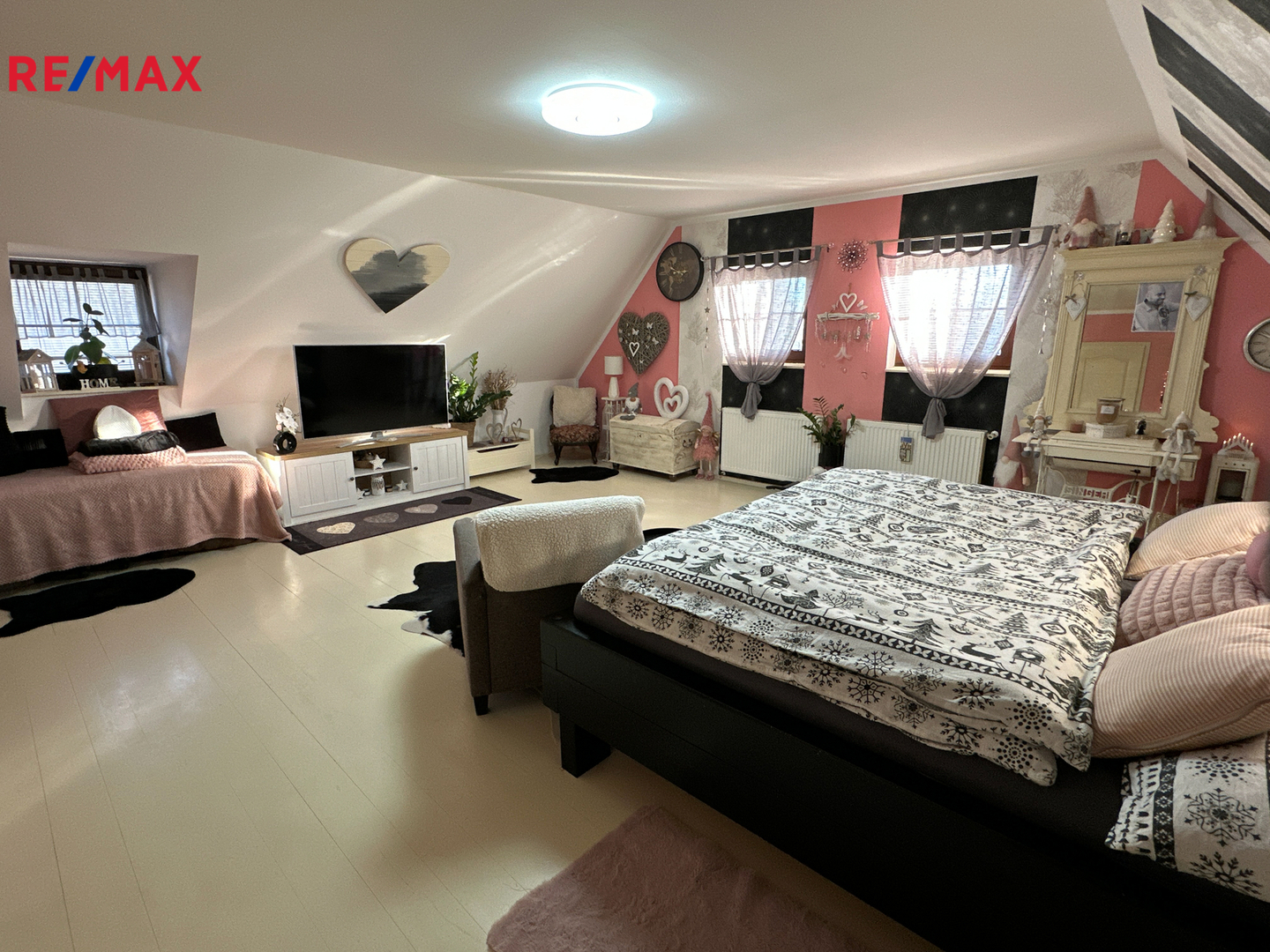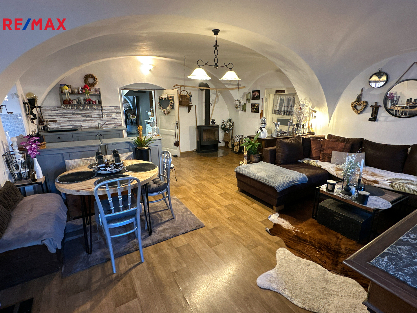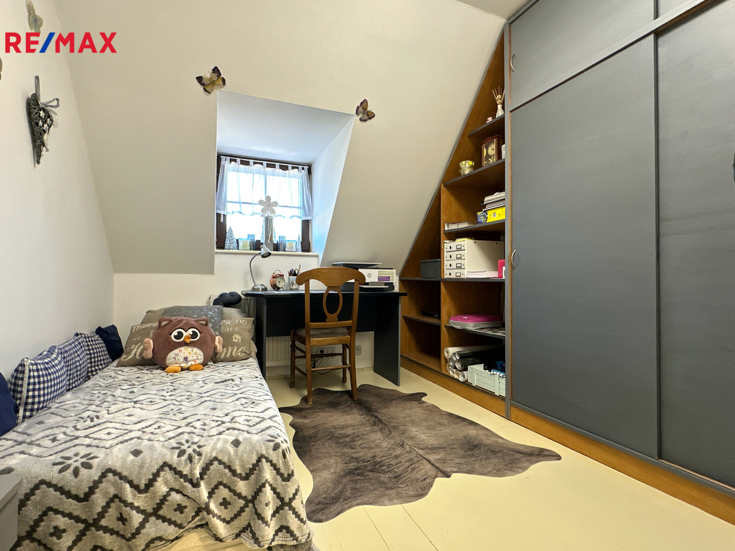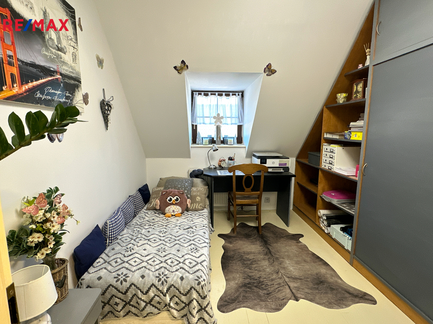 V horním patře se nachází kuchyně, chodba, čtyři obytné místnosti a dvě koupelny.