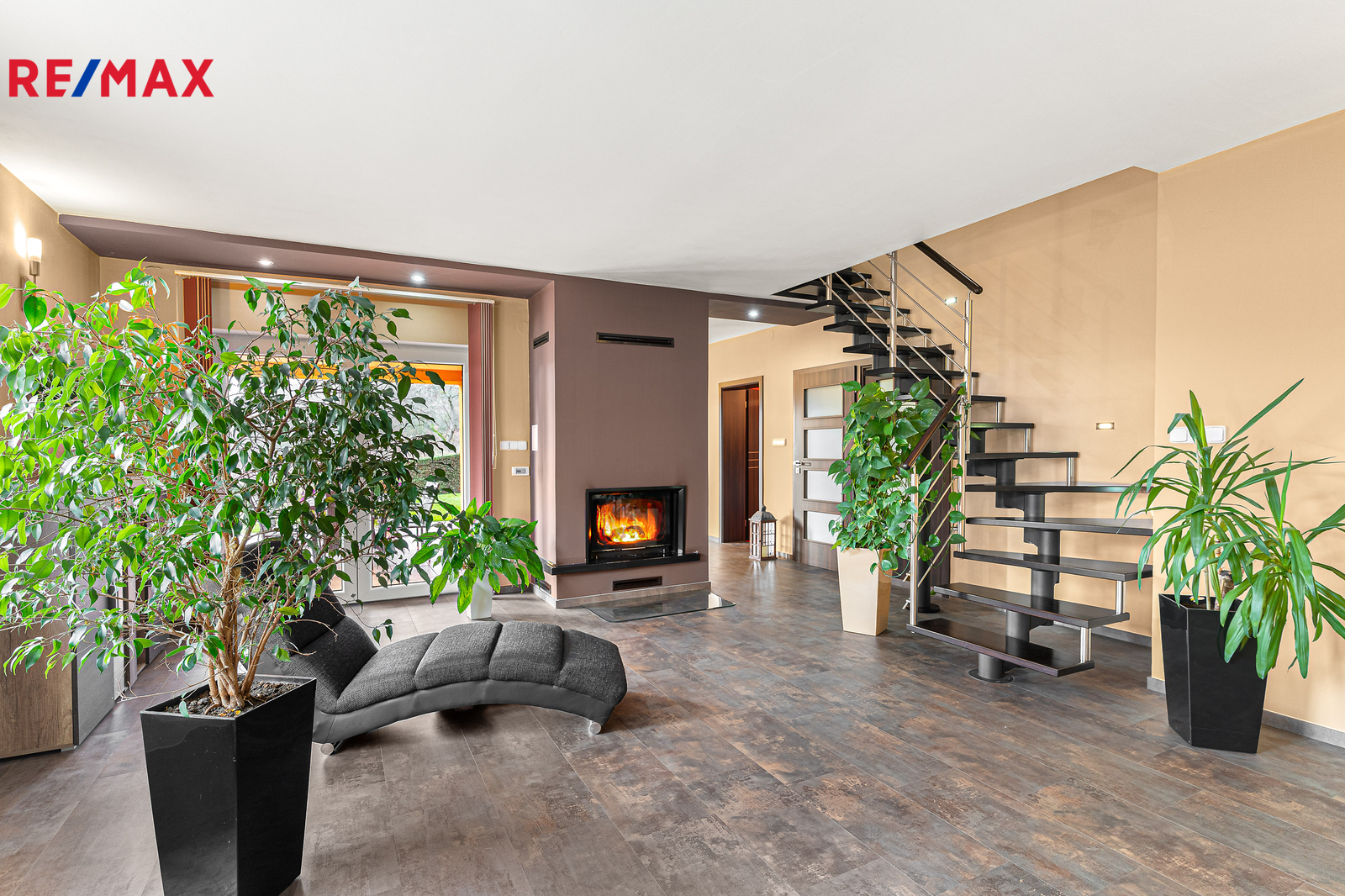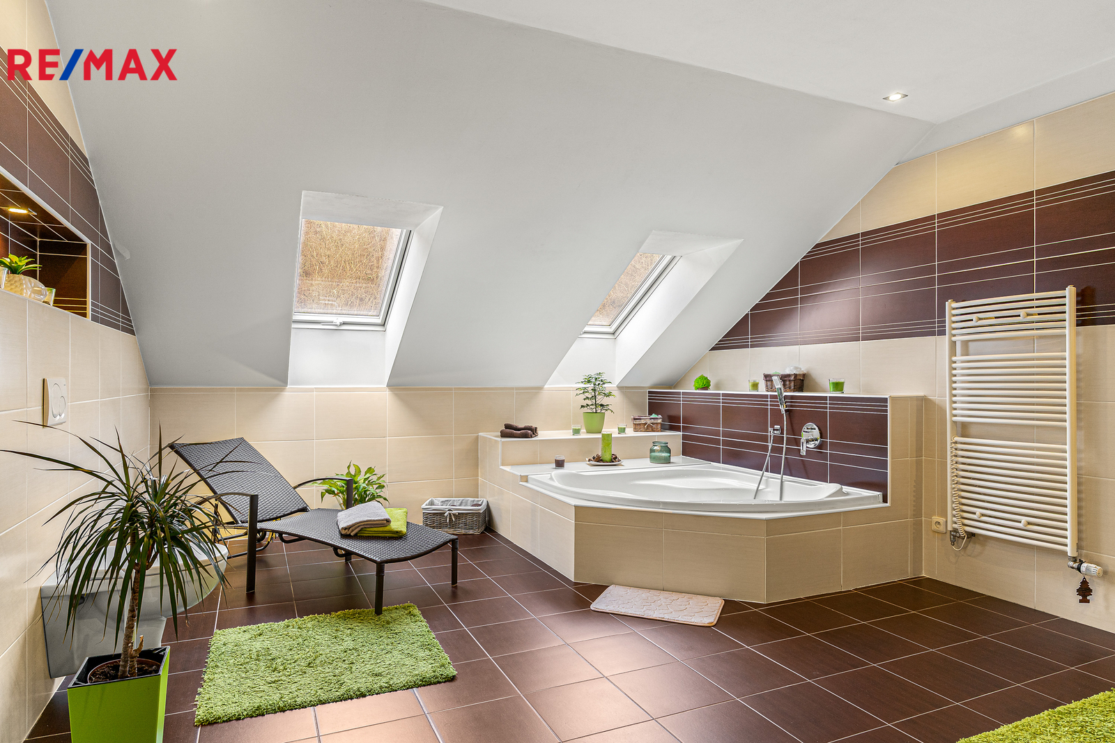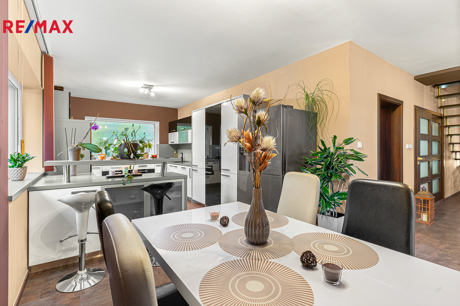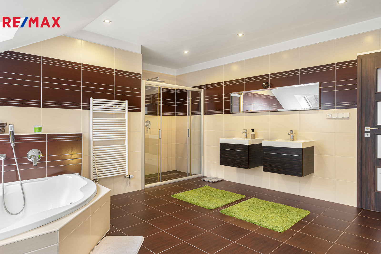 Prostor a dispozice. Dům nabízí celkem 285 m2 v dispozici 5+1 se vstupní chodbou, technickou místností a již zmíněnou garáží. Umístit do ní můžete menší fitness, ateliér, řemeslnou dílnu nebo svoji kancelář. Dům nabízí dvě koupelny – menší v přízemí se sprchovým koutem a toaletou a druhou větší s dostatkem místa pro umístění třeba infrasauny. Kuchyňská linka je vyrobena na míru a prostor kuchyně je prodloužen zastřešenou částí venkovní terasy.