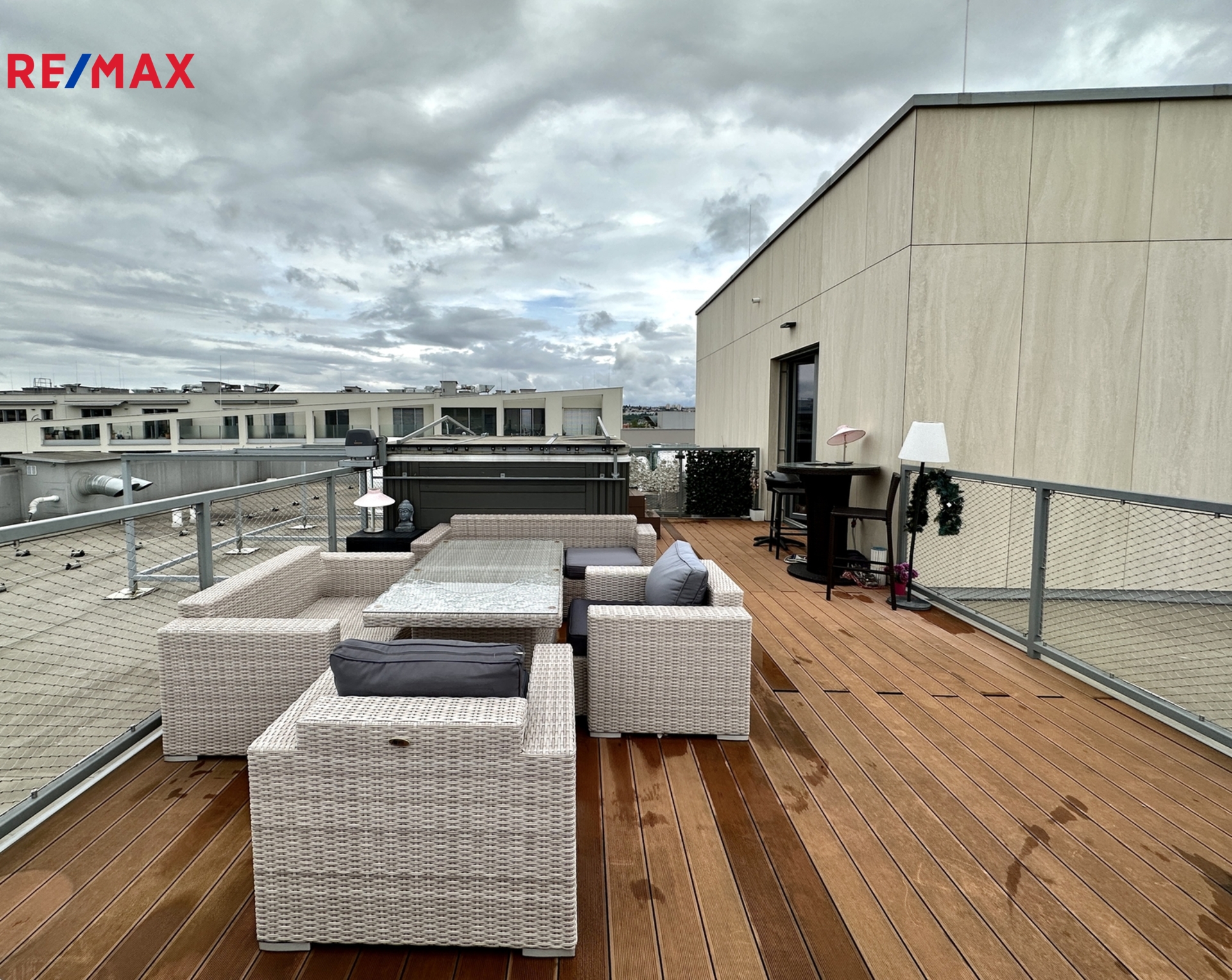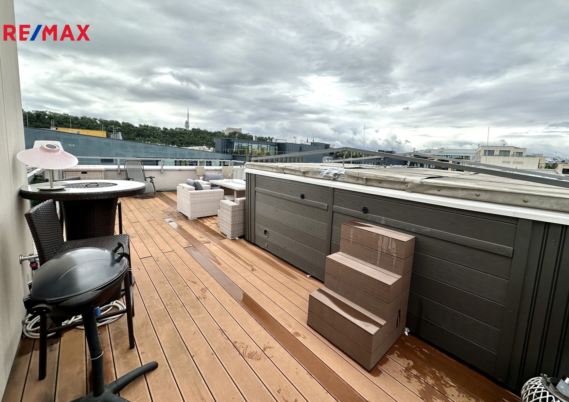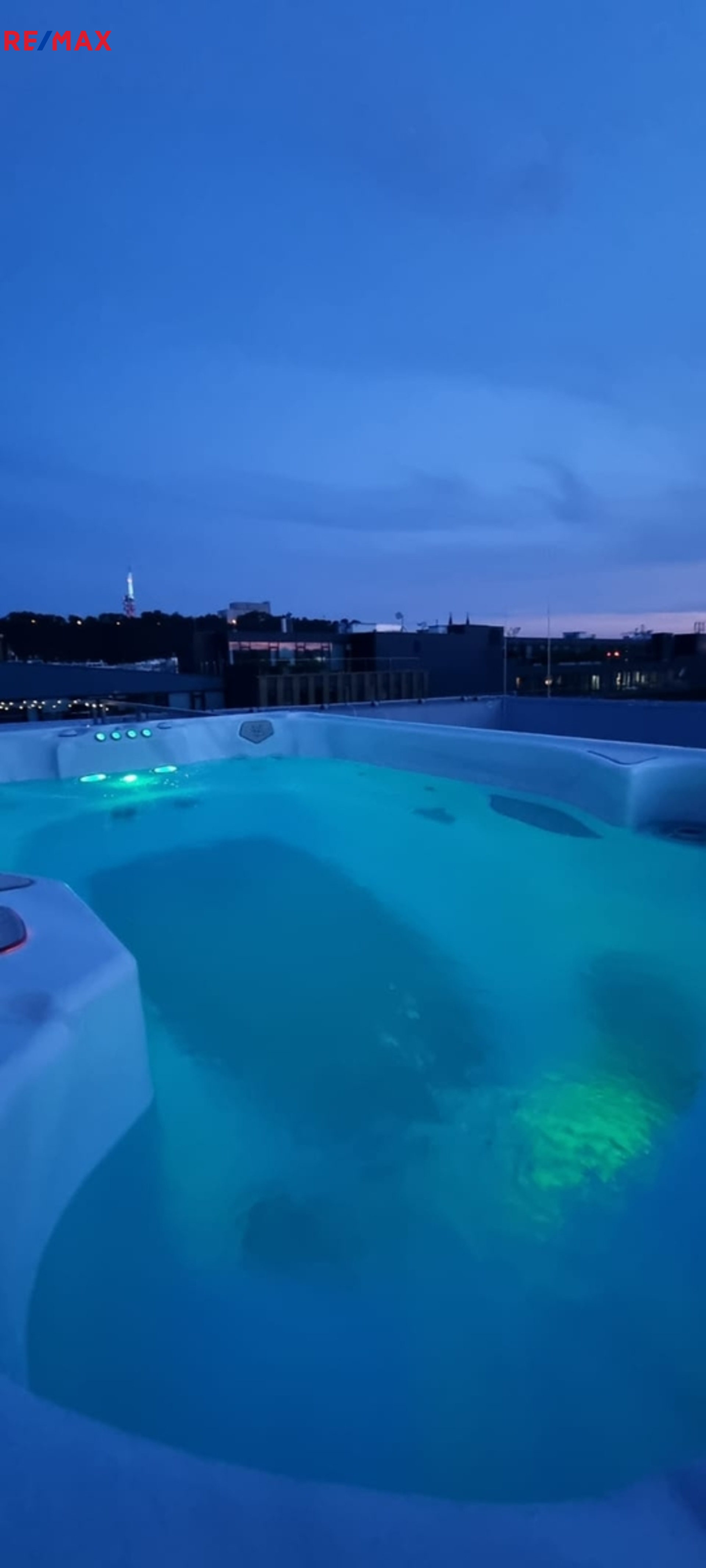 Terasa s výhledem do okolí je vybavena posezením a swimspa s protiproudem i vířivkou k celoročnímu použití. Byt je vybaven kuchyňskou linkou se spotřebiči a několika vestavěnými skříněmi.