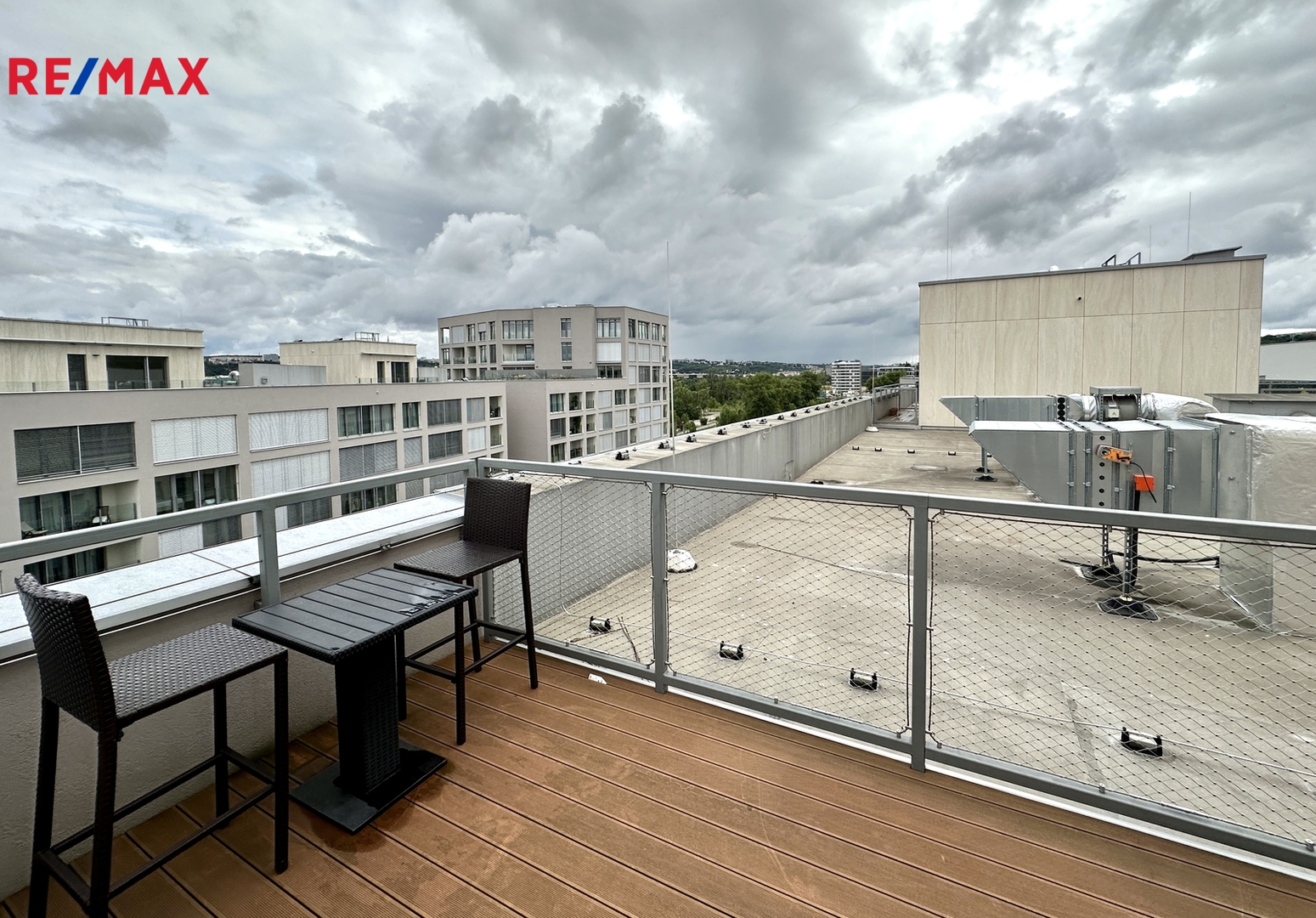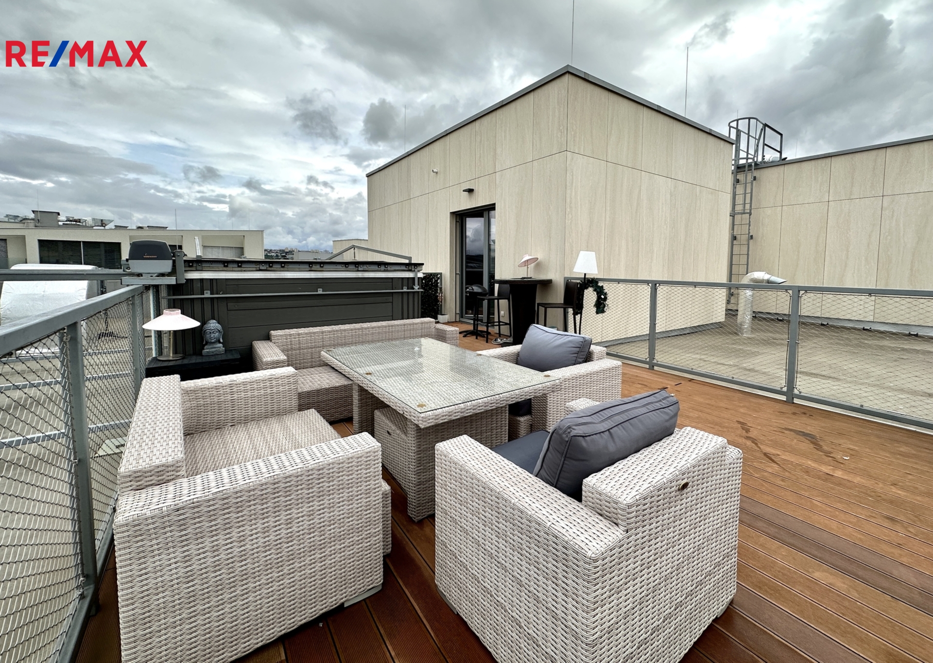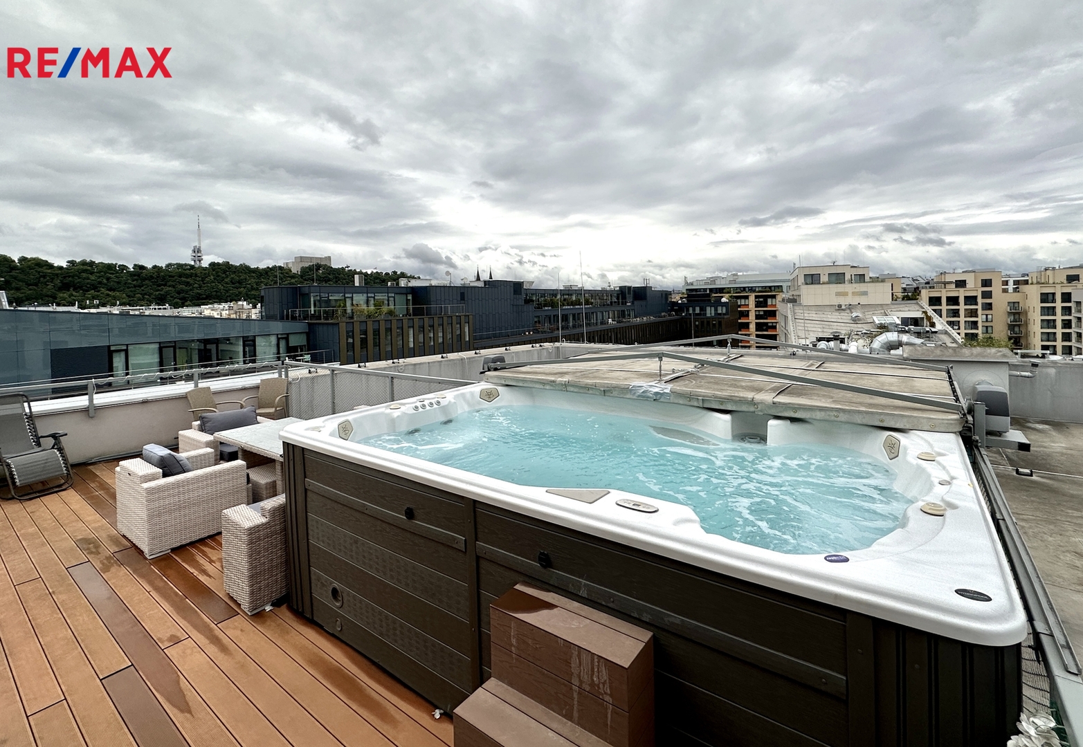 Terasa s výhledem do okolí je vybavena posezením a swimspa s protiproudem i vířivkou k celoročnímu použití. Byt je vybaven kuchyňskou linkou se spotřebiči a několika vestavěnými skříněmi.