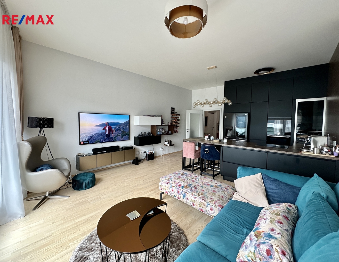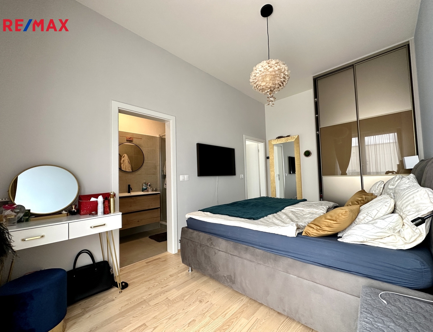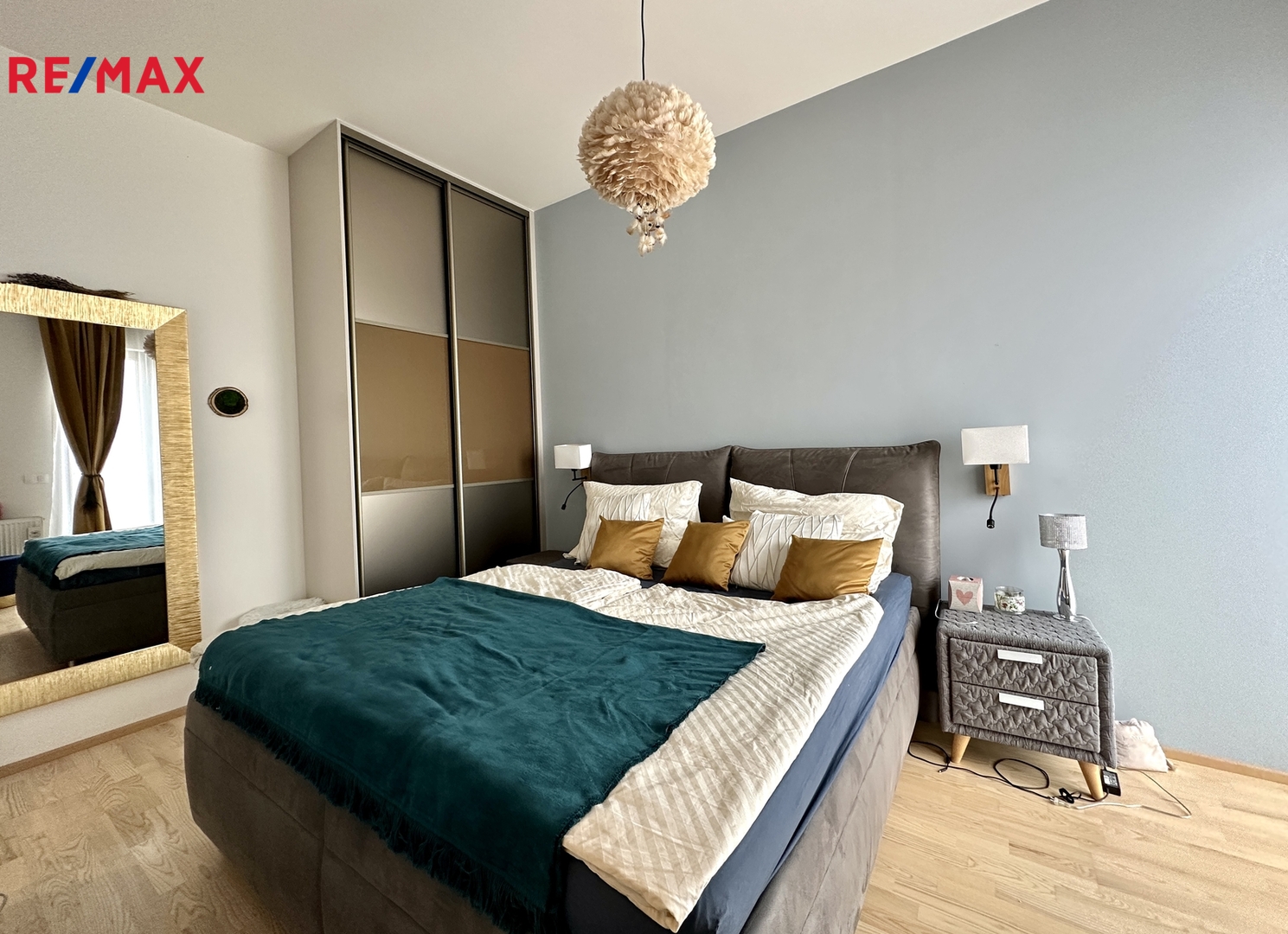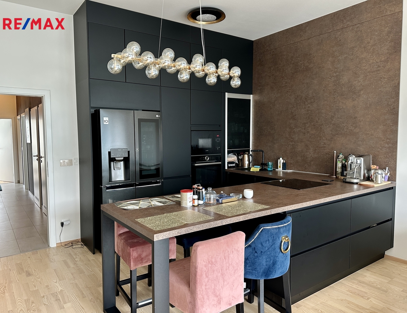Prostorný mezonetový byt je rozložen do dvou podlaží. Má obývací pokoj s kuchyňským koutem, tři ložnice, dvě koupelny, dvě samostatná WC, halu a šatnu.