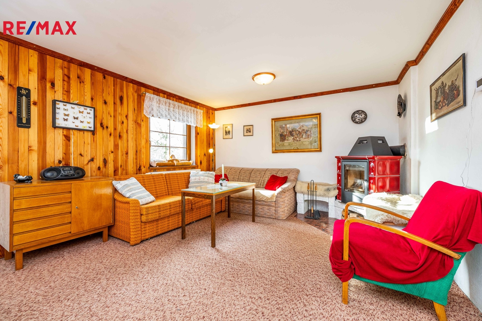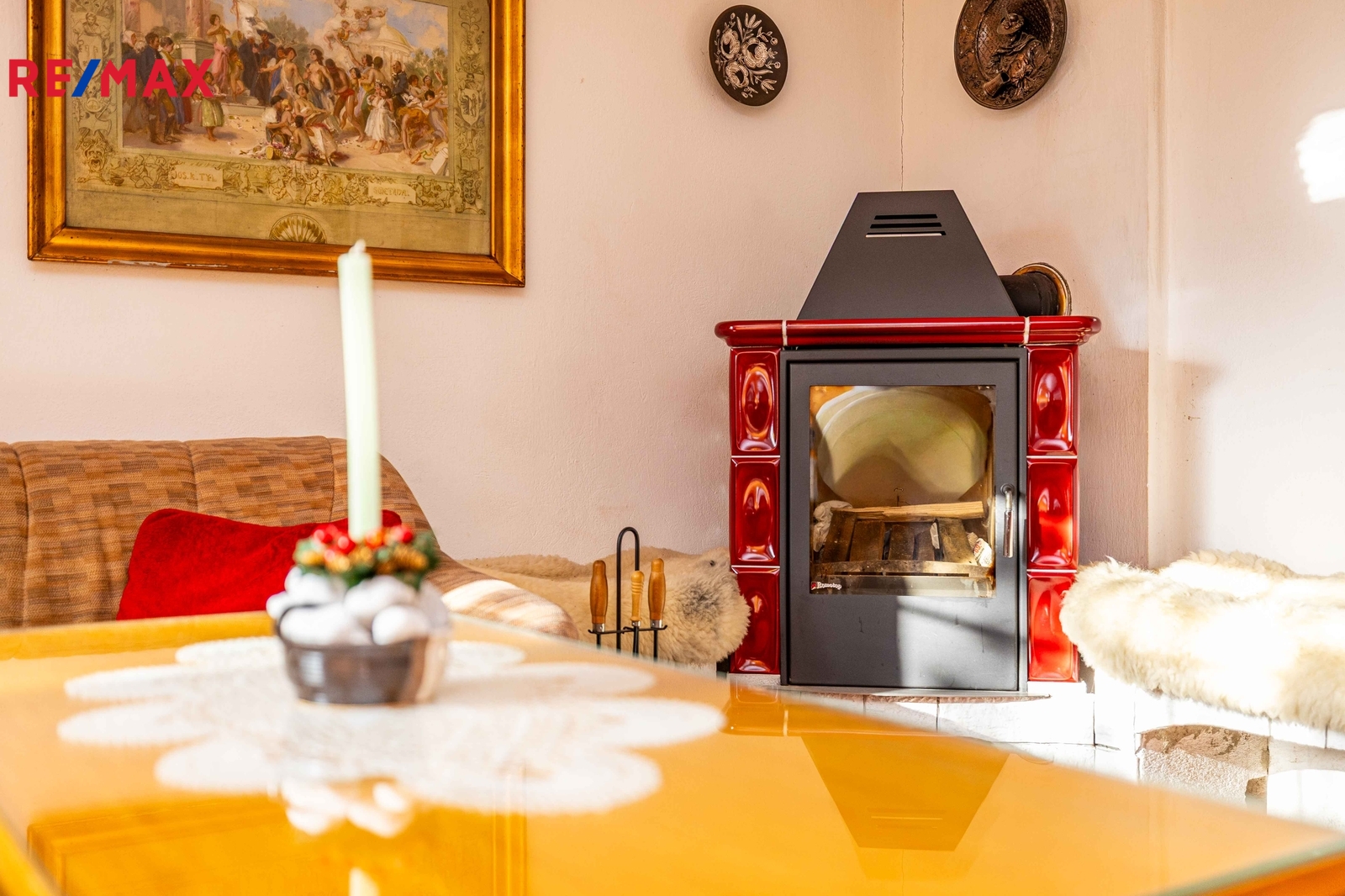 V obývací místnosti se nachází krb na dřevo, který dodává domu příjemnou atmosféru i další možnost vytápění.