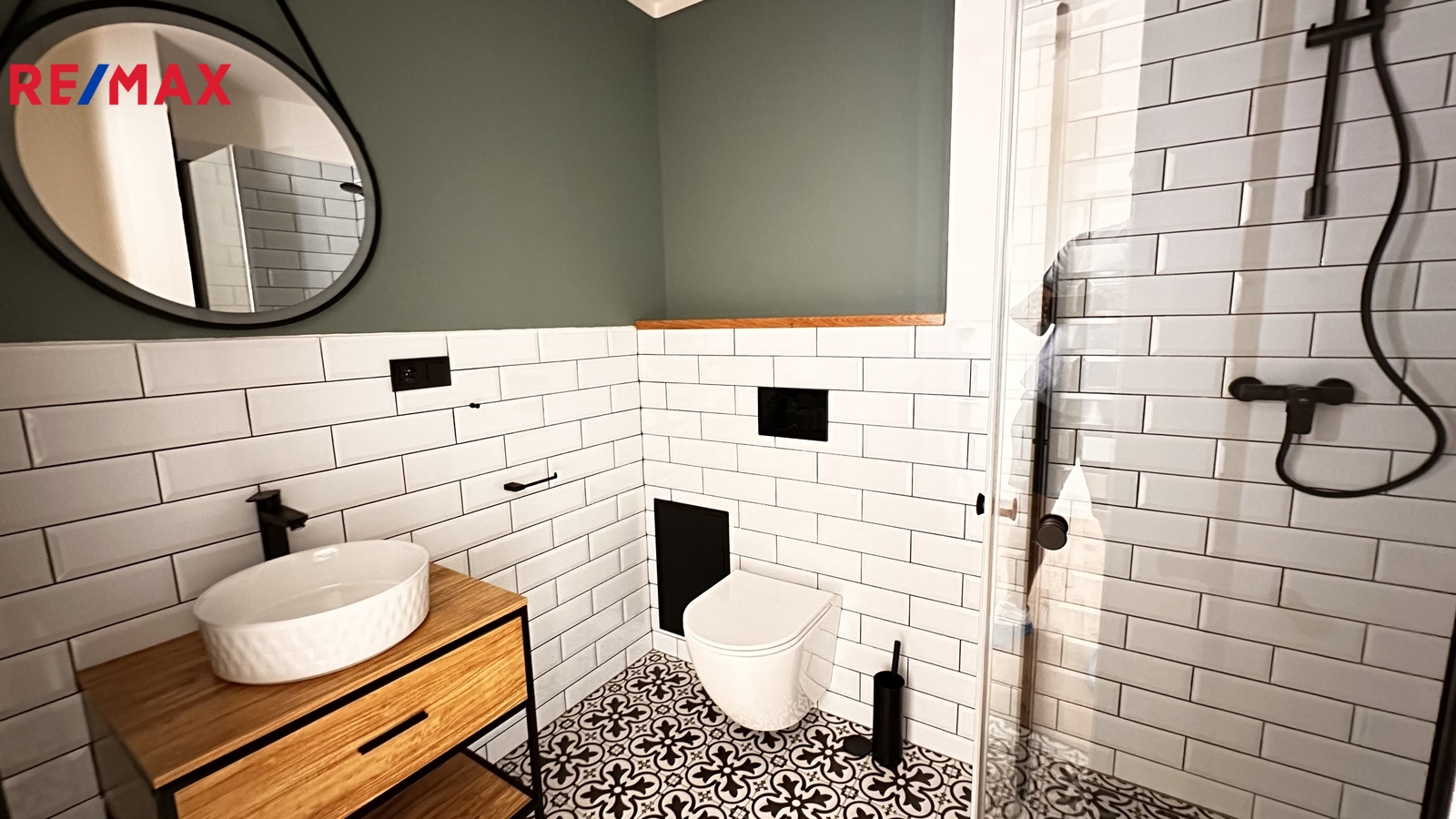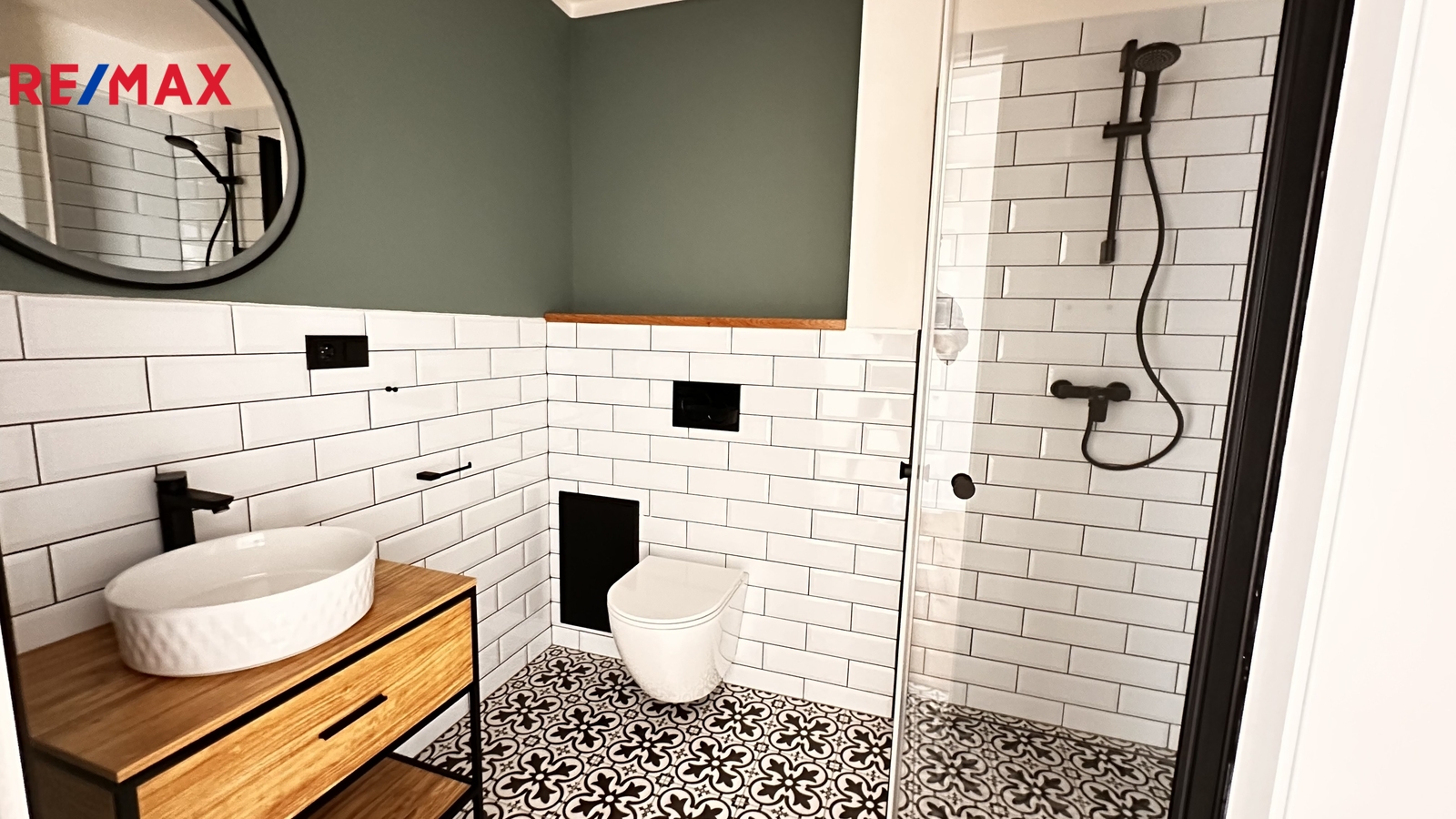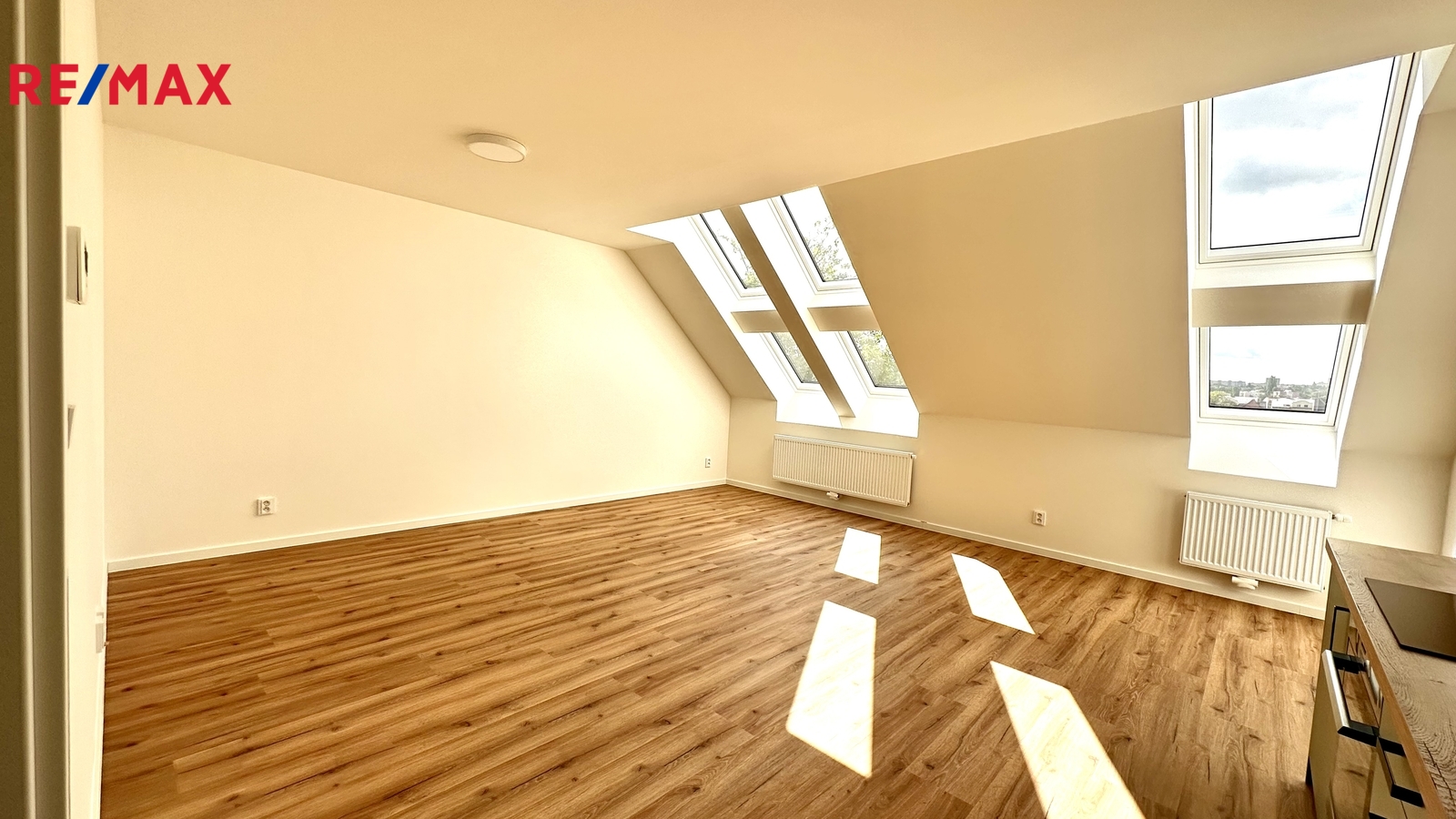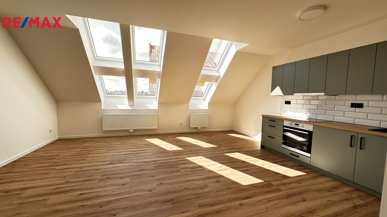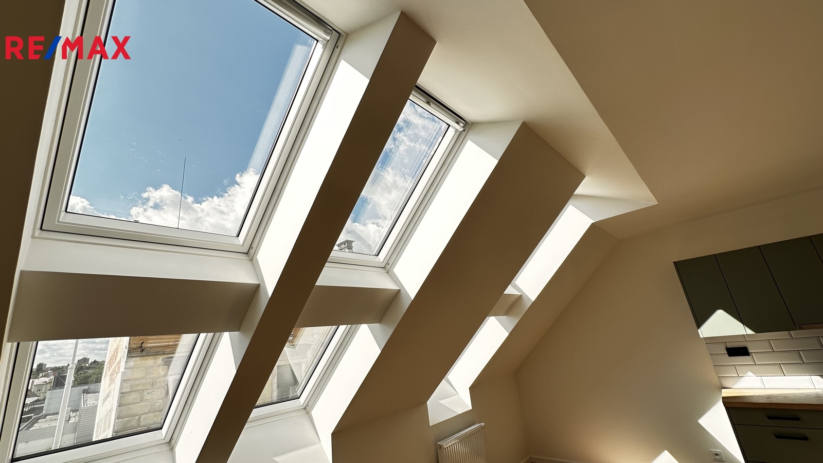 Interiér bytu je navržen s důrazem na funkčnost a estetiku. Dominantou je moderní kuchyňská linka zhotovená na míru, vybavená kvalitními spotřebiči a dostatkem úložného prostoru. Příjemnou atmosféru podtrhují designové vinylové podlahy, které jsou nejen elegantní, ale i velmi odolné a snadné na údržbu. S interiérovými dveřmi se zárubněmi od Sapeli vše dohromady skvěle a vkusně funguje. Koupelna a další zařizovací předměty odpovídají vyššímu standardu – oceníte vkusné obklady, moderní sanitu a nadčasový vzhled, který bude dlouhodobě působit čistě a útulně. Velkým bonusem, který celému prostoru dodává vzdušnost, jedinečný charakter a genia loci, jsou střešní okna – díky kterým je byt nádherně prosvětlený po celý den a působí ještě prostornějším dojmem.