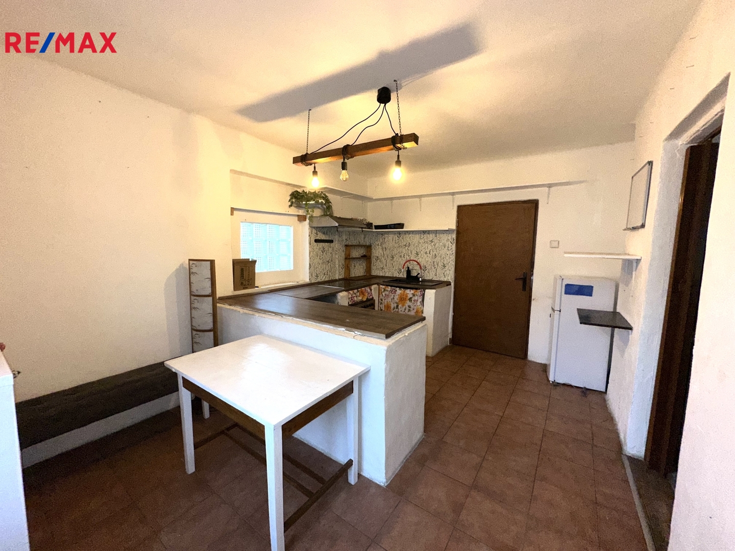 Dispozice domu je vstupní chodba, koupelna s toaletou, prostorná kuchyň, obývací pokoj s krbem a ložnice — tedy praktické a pohodlné zázemí od první chvíle. Celková podlahová plocha obytné části je cca 40 m², ale skutečnou přidanou hodnotou je podkroví o dalších cca 40 m². Podkroví je zcela čisté a vysoké, s výraznými trámy, které umožňují vytvořit plnohodnotné obytné místnosti dle vlastních představ. Pozemek o celkové ploše 624 m2 zahrnuje za domem zahradu, kde si můžete užívat chvíle mimo ruch okolí.
