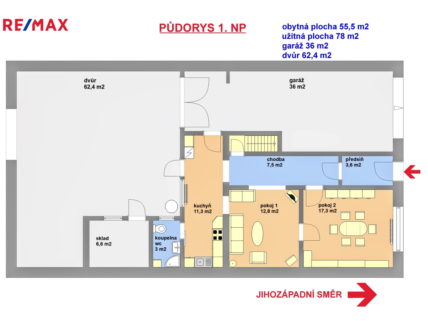 • 1. NP: byt 2+1, 55,5 m², v obývacím pokoji krbová kamna pro příjemnou atmosféru; sklad 6,6 m², sklep 16,1 m², průjezdná garáž 36 m², dvůr 62,4 m² s krbem