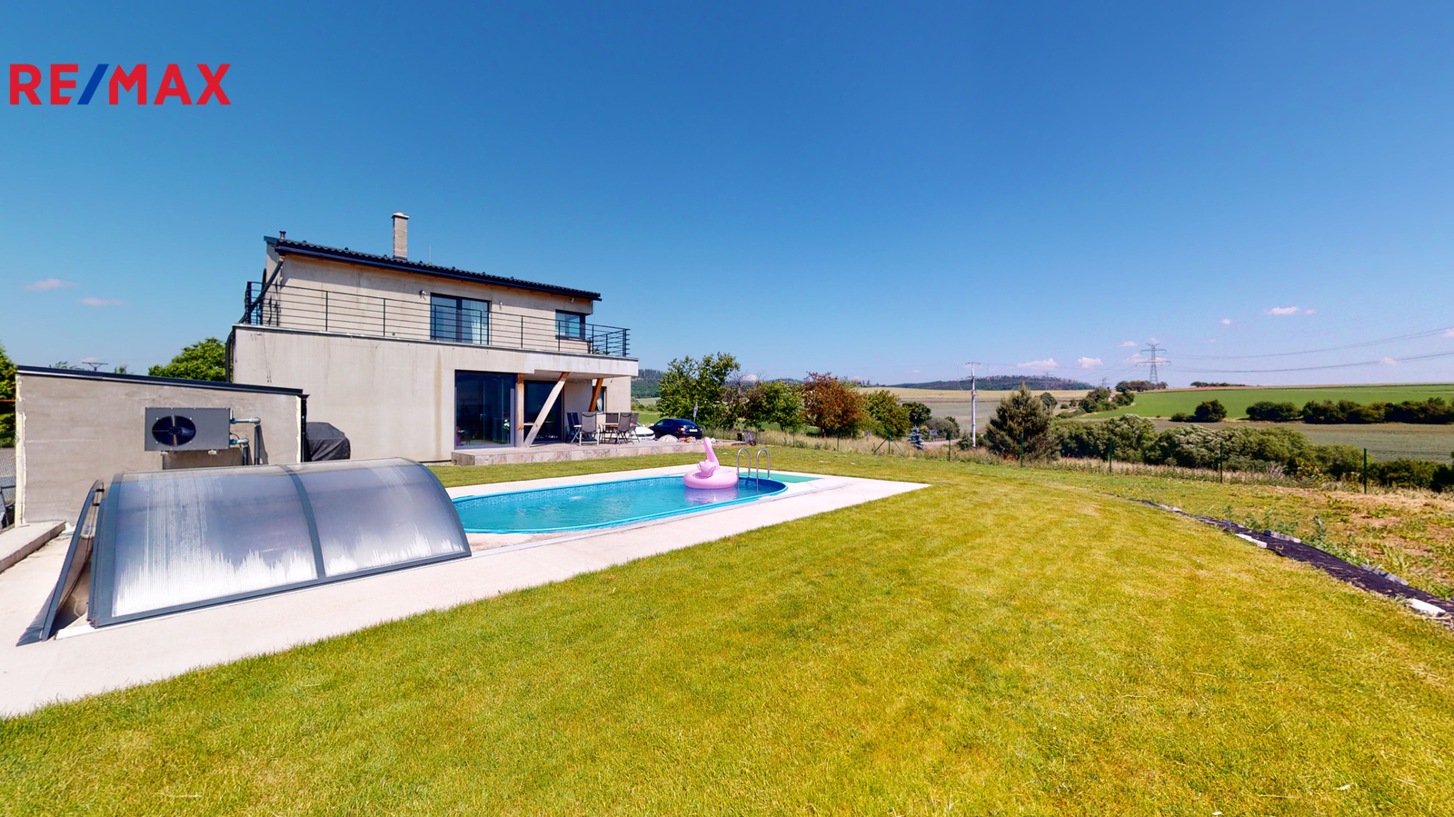 Vedle domu se nachází parkovací stání pro 2 auta ( se základovou deskou na dvojgaráž ) o výměře 56 m2. Před domem a v části zahrady za domem je instalován samo-zavlažovací systém. Na zahradě se nachází zastřešený bazén ( 6x3 m, hloubka 1,5 m), vytápěný tepelným čerpadlem a zahradní domek.