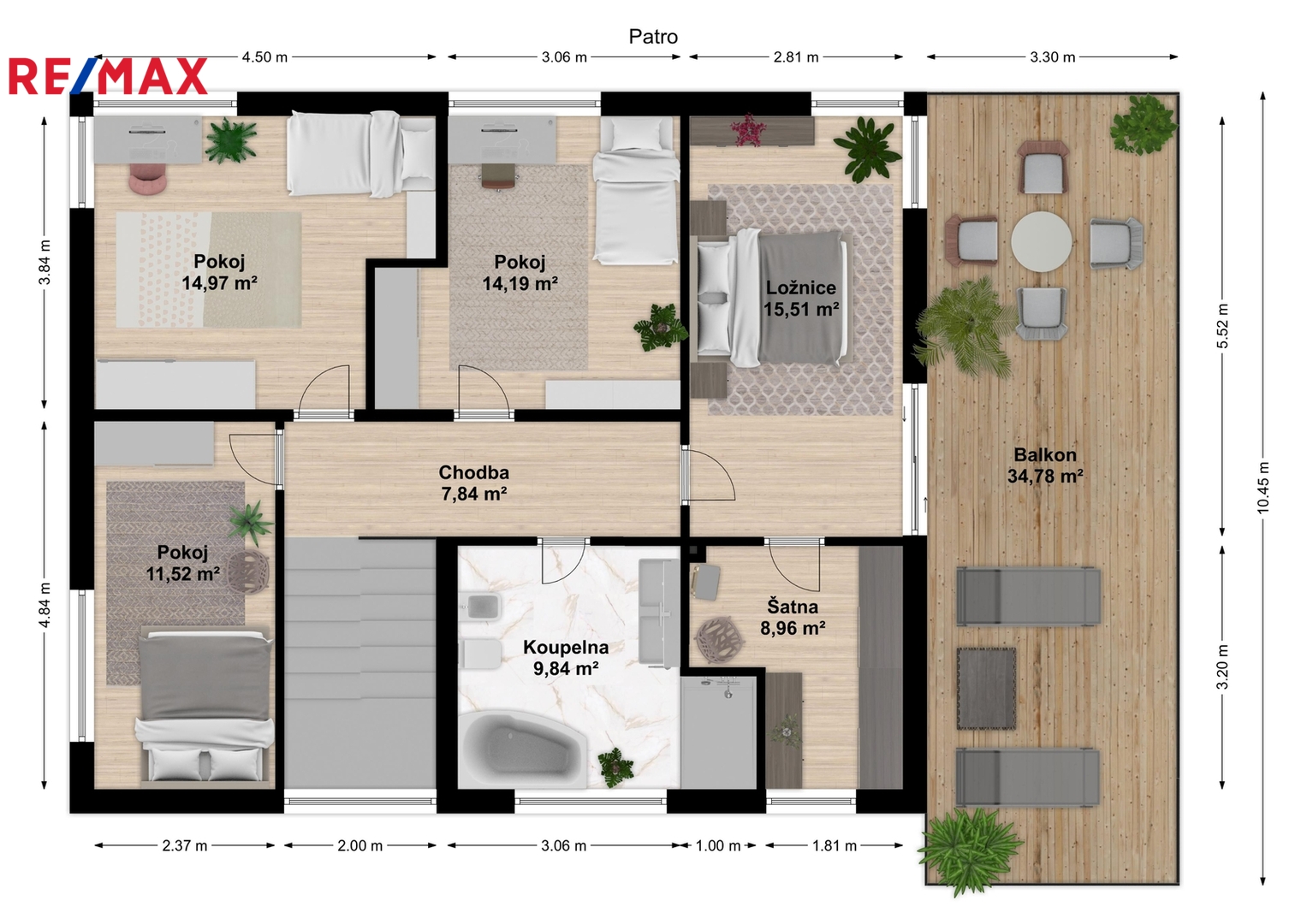 2NP: chodba 8 m2, šatna 11,5 m2, pokoj 15 m2, pokoj 14 m2, ložnice 15,5 m2 se vstupem na balkón o výměře 35 m2 a do šatny 9 m2, koupelna + WC 10 m2 ( tuto místnost je třeba dokončit).