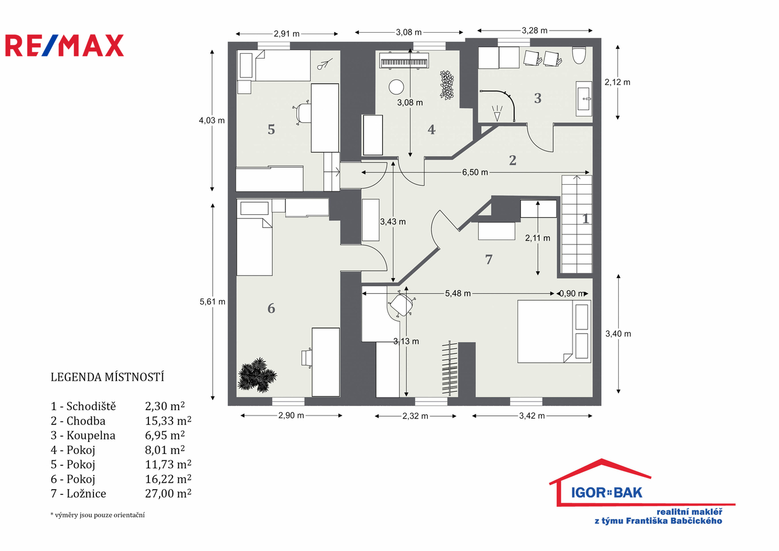 Ve druhém nadzemním podlaží se nacházejí čtyři pokoje o výměrách 27,00 m², 16,22 m², 11,73 m² a 8,01 m². Patro dále nabízí koupelnu (6,95 m²) s přípravou na vanu, prostornou chodbu (15,33 m²) a schodiště (2,30 m²). Celé horní podlaží působí vzdušně a poskytuje dostatek prostoru pro vícečlennou domácnost, dětské pokoje, pracovny či hosty.