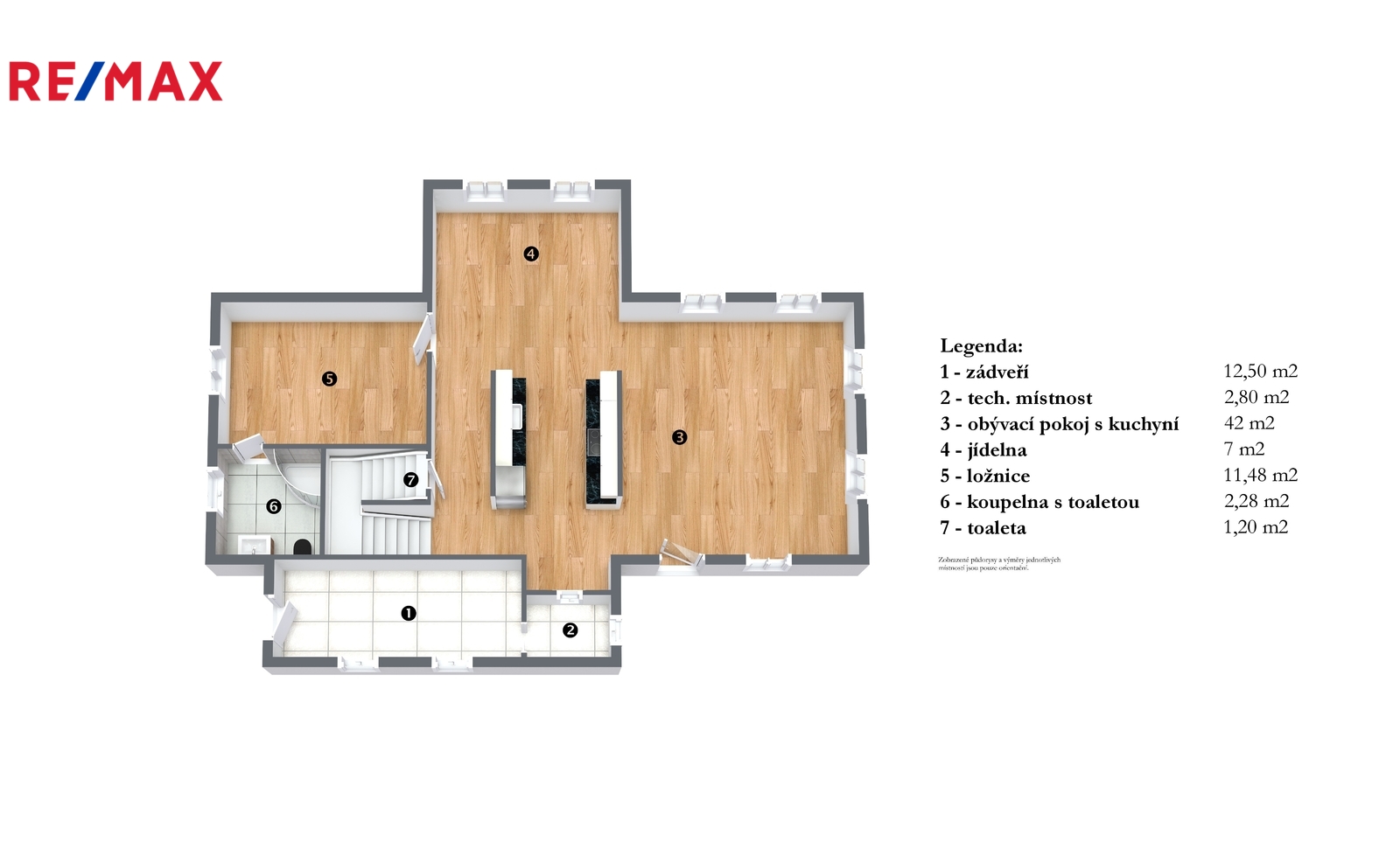Přízemí: vstupní chodba s úložnými prostory, otevřený obývací pokoj s kuchyní a jídelnou, kde dominují kachlová kamna. Z obývací části vedou prosklené dveře přímo na zahradu. Dále zde najdete ložnici s vlastní koupelnou a WC a také samostatné WC.