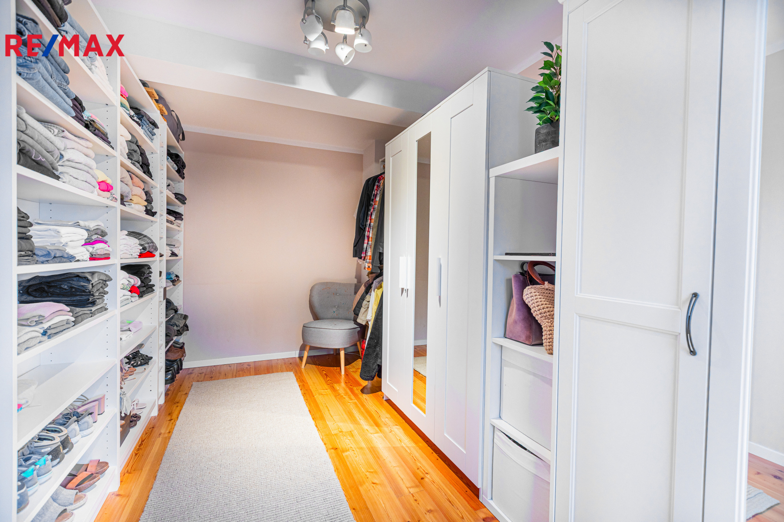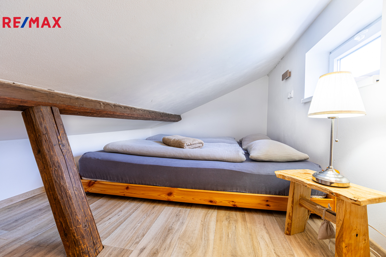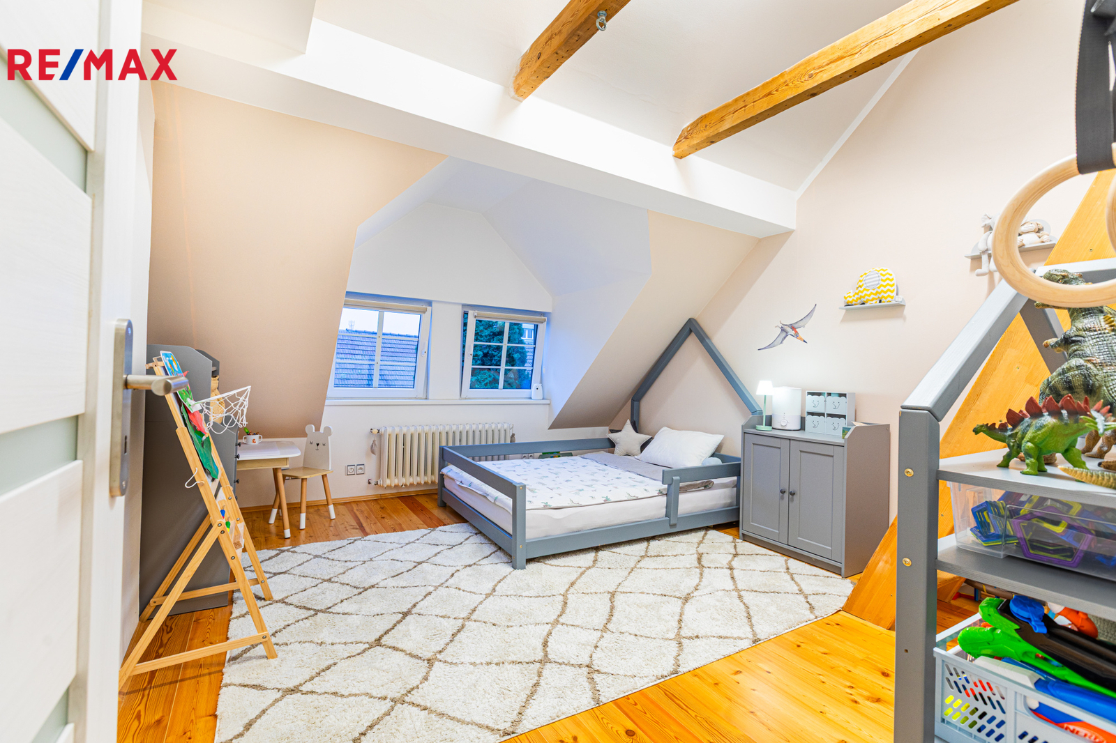 V patře domu se nachází další sklad, koupelna o velikosti 7,7 m², šatna (9 m²), podkrovní dětský pokoj (15 m²) s vysokým stropem a schodiště do mezipatra, které lze využít jako hernu, sklad nebo další místo na spaní. Posledním pokojem je ložnice rodičů (9 m²).