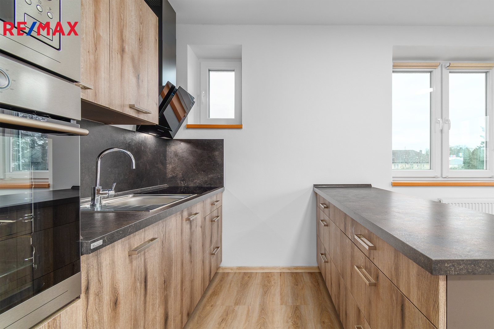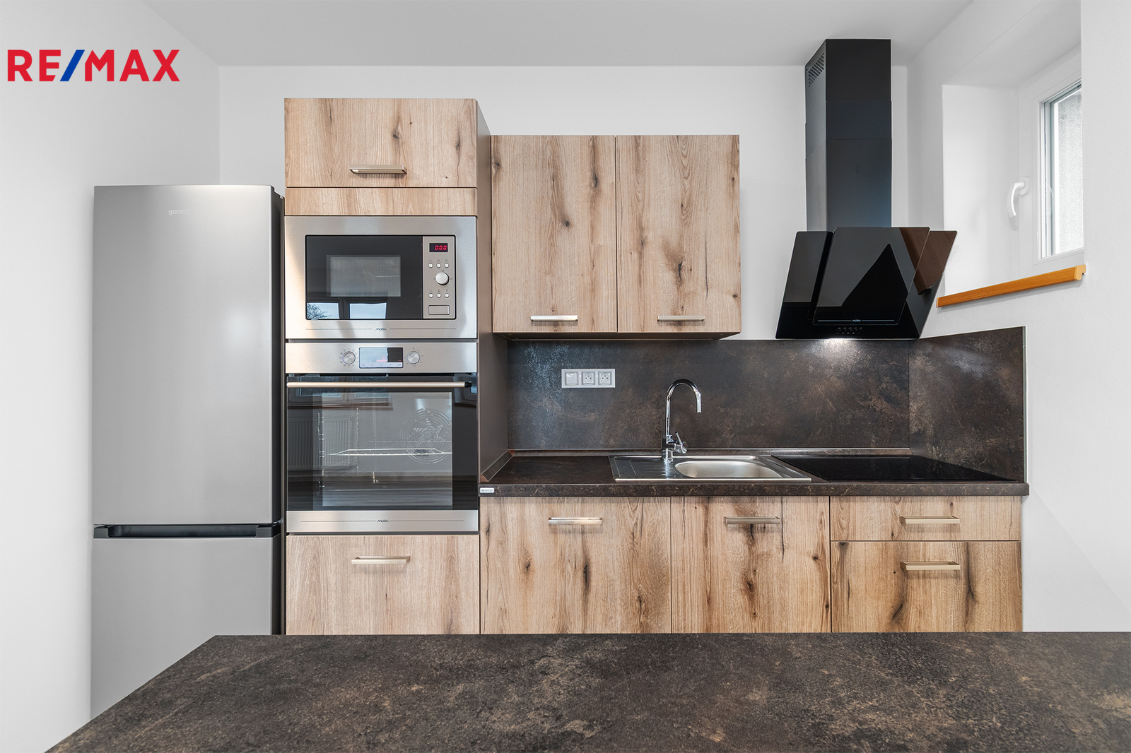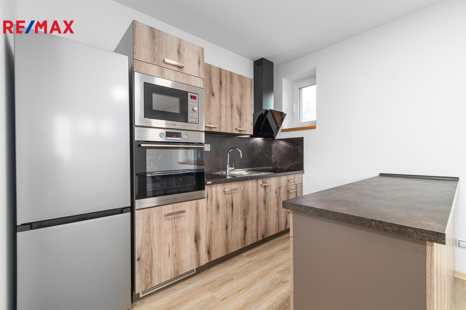 Byt je nabízen nezařízení, součástí pronájmu je kompletně vybavená kuchyňská linka s vestavnými spotřebiči - indukční varnou deskou, elektrickou troubou, digestoří a lednicí s mrazákem.