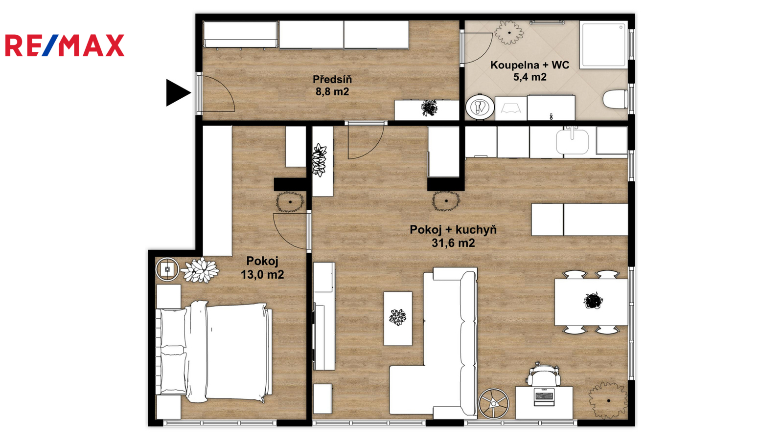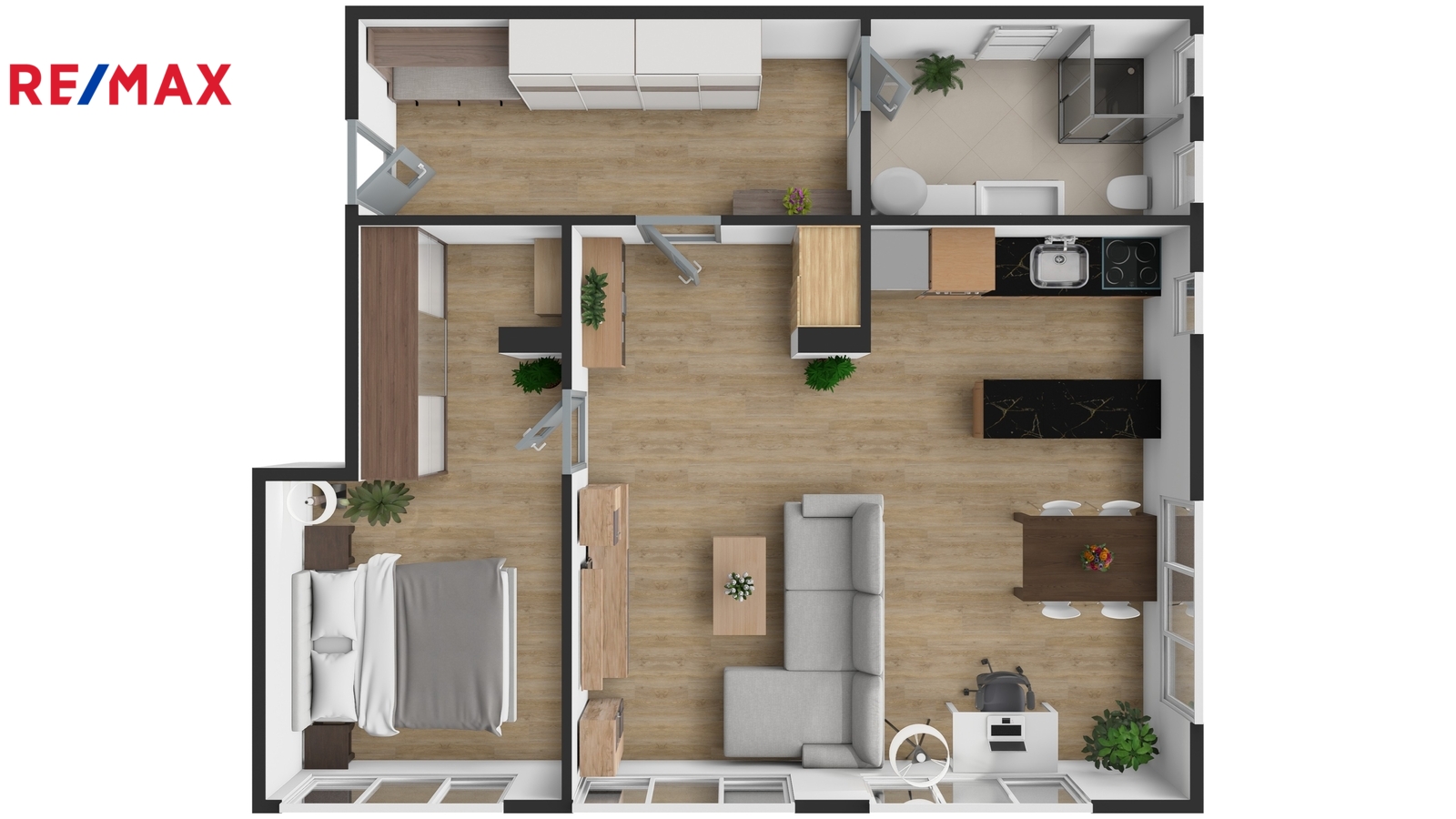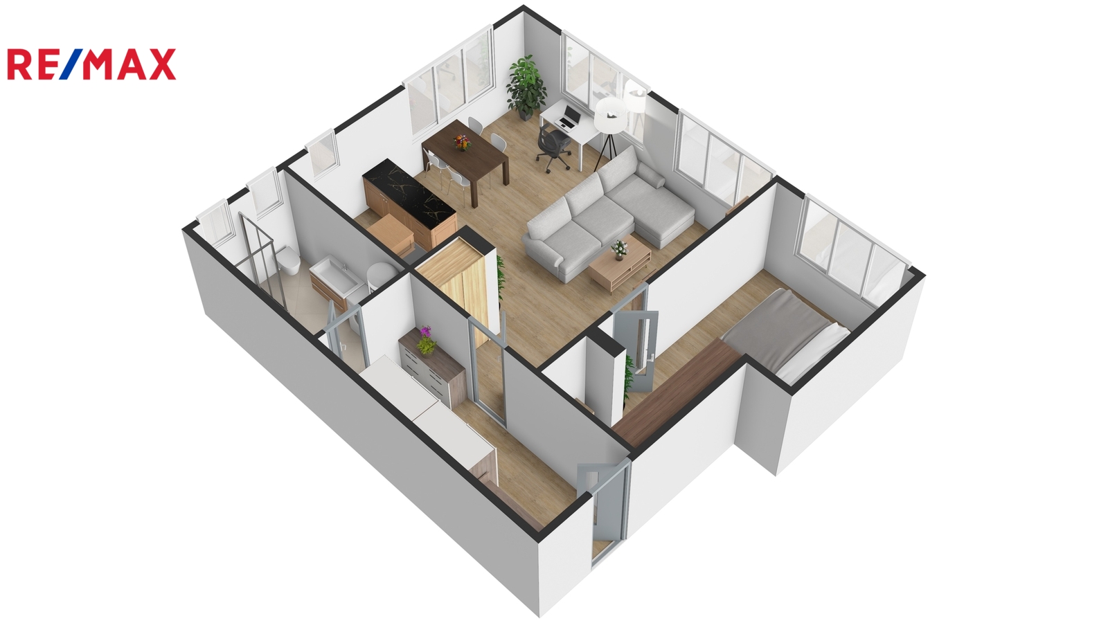 Dispozice bytu nabízí prostornou předsíň, ložnici a multifunkční obývací pokoj, který je zdařile členěn na jednotlivé zóny. Na plně vybavenou kuchyňskou linku plynule navazuje jídelní část, dále zóna pro relaxaci a prostor se najde i pro pracovní koutek. Nechybí samozřejmě koupena se sprchovým koutem, toaletou a místem pro pračku.