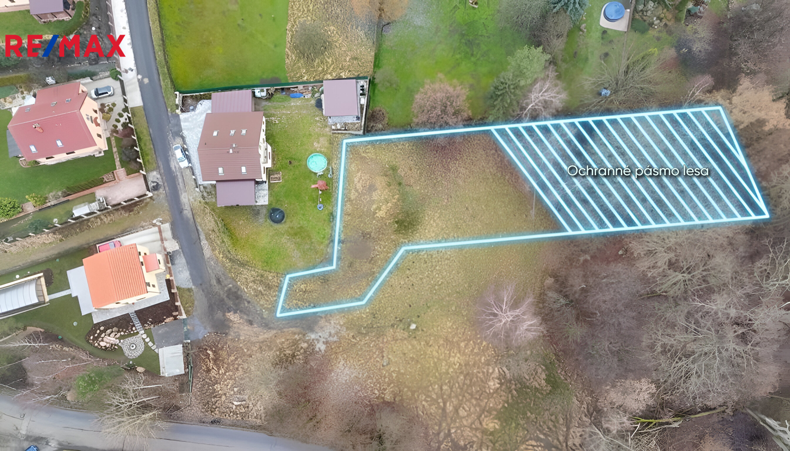 Hlavní pozemek parc. č. 573/18 o rozloze 1 103 m² je dle územního plánu veden jako plocha BI – bydlení individuální, určená pro výstavbu samostatně stojícího rodinného domu venkovského či příměstského charakteru. Na fotografii je označeno ochranné pásmo lesa - v této oblasti není možné vystavět rodinný dům.