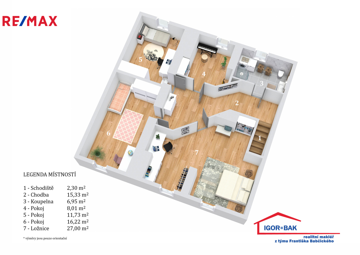 Celé podlaží působí vzdušně a poskytuje dostatek místa pro vícečlennou domácnost, dětské pokoje, pracovny či hosty.