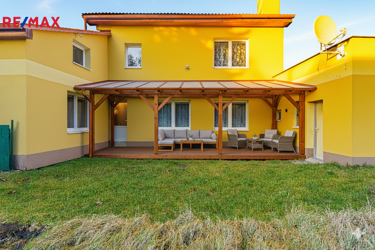 Exkluzivní Venkovní Prostor: Kromě rozlehlé zahrady 1618m2 je k dispozici terasa o velikosti 35m2 s přístupem z 2.NP, ideální pro posezení a relaxaci.
