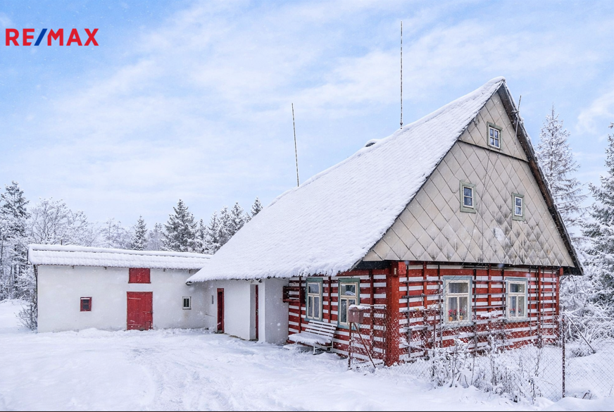 Tradiční červenobílá roubenka působí velmi útulně a zachovává svůj původní venkovský charakter.