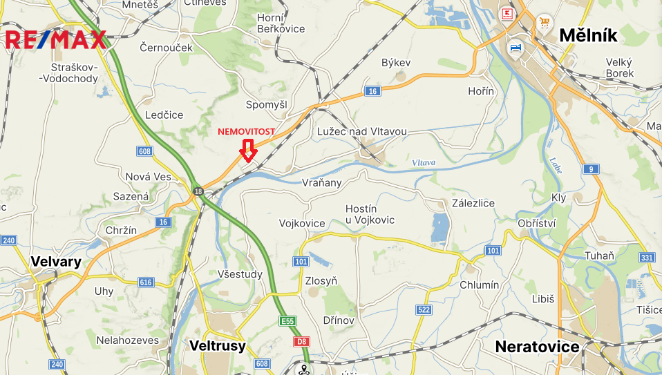 Poloha v blízkosti dálnice, vyhledávané obce Vraňany a údolí řeky Vltavy.