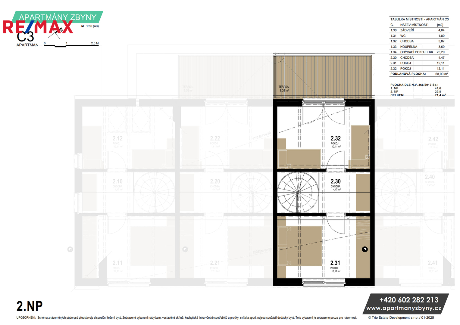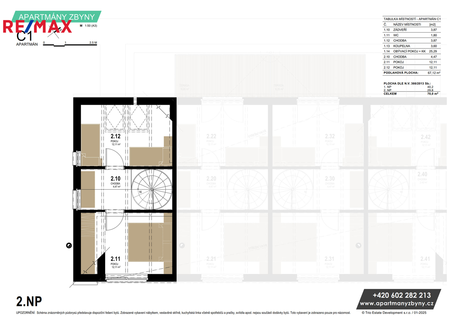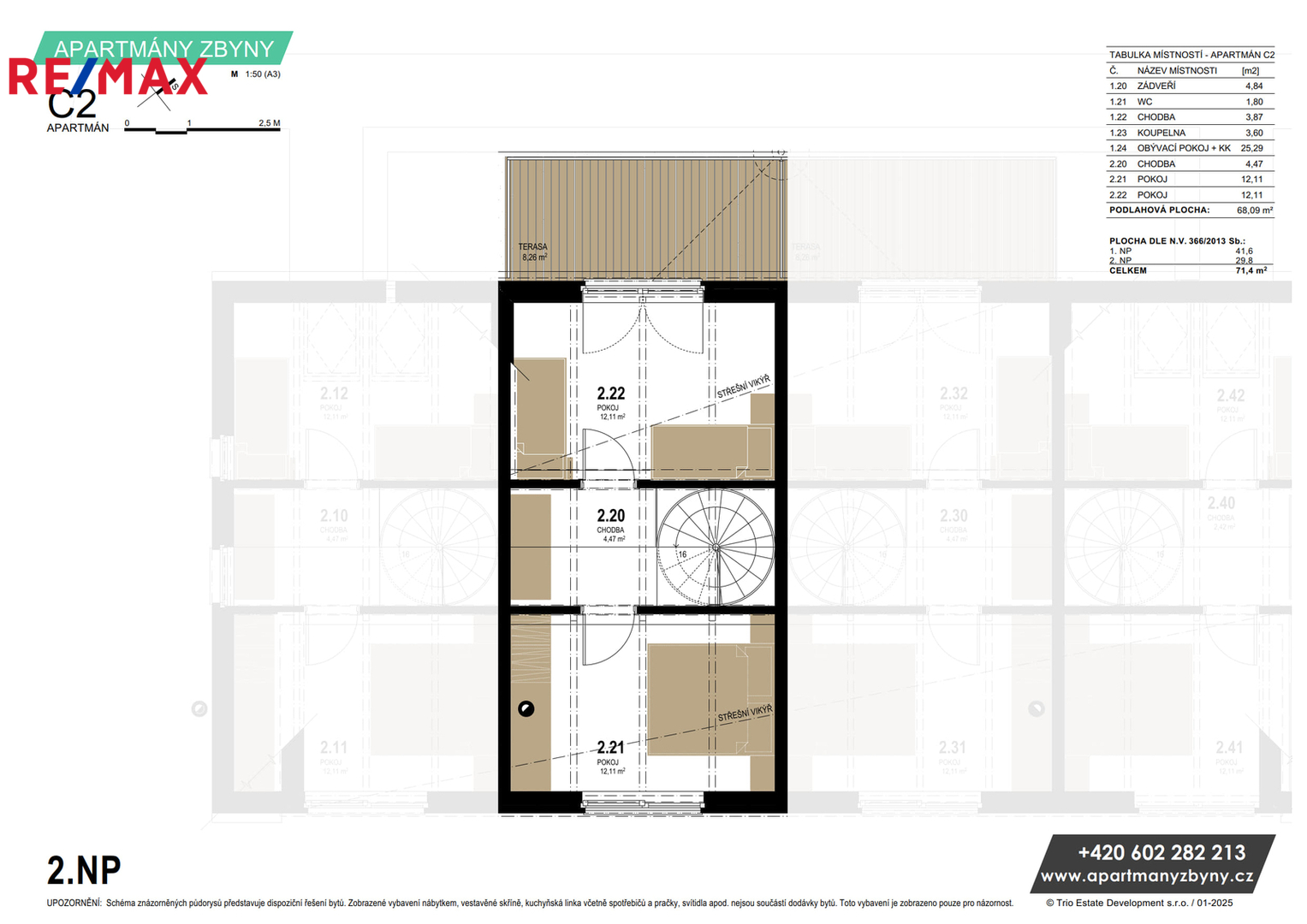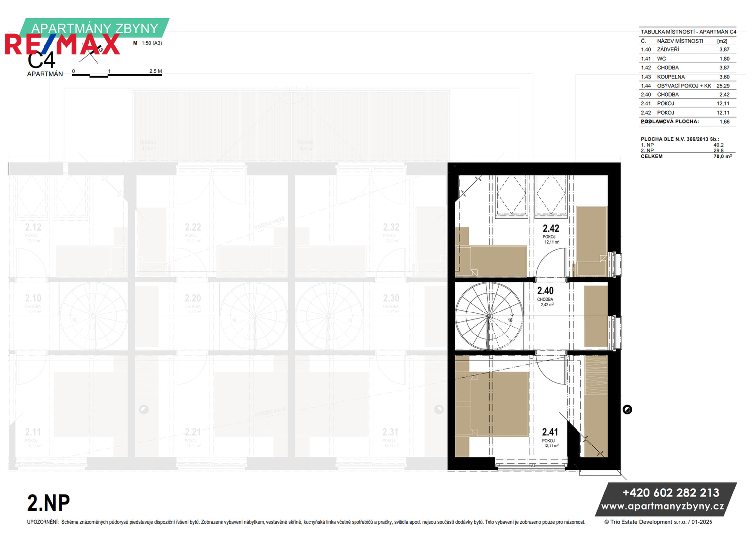 • Všechny bytové jednotky jsou mezonetové; dvě z nich jsou rozšířeny o střešní terasu 8.3 m²