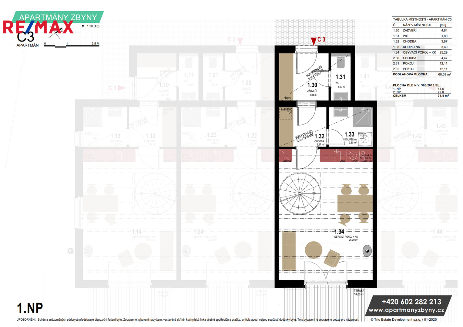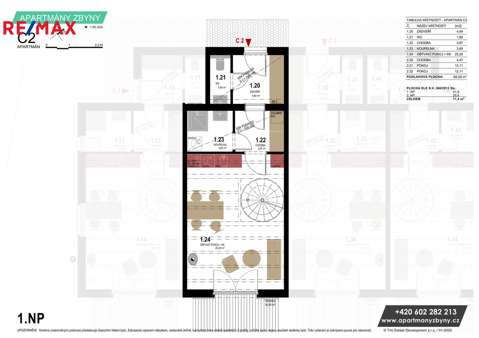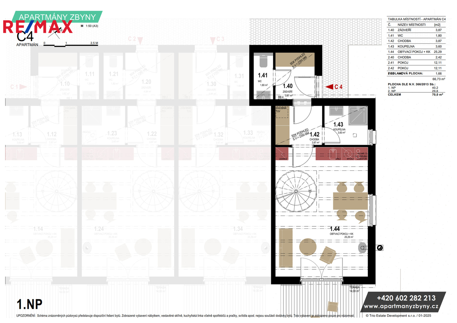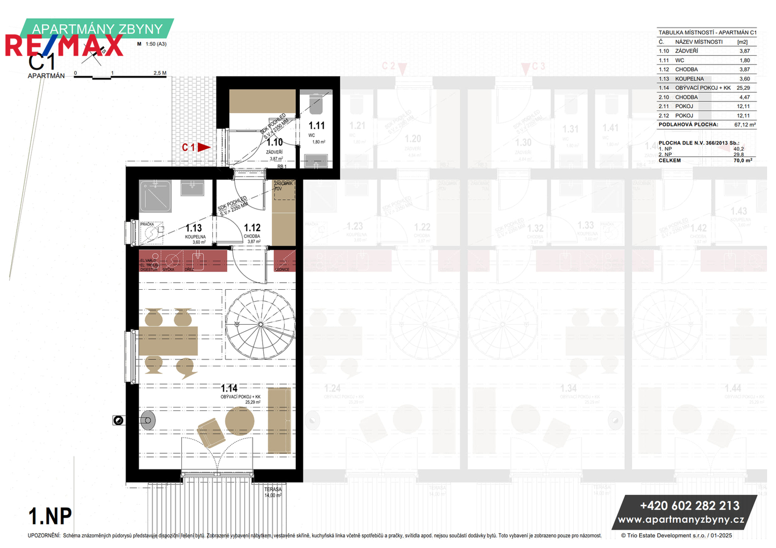 • Všechny bytové jednotky jsou mezonetové; dvě z nich jsou rozšířeny o střešní terasu 8.3 m²
