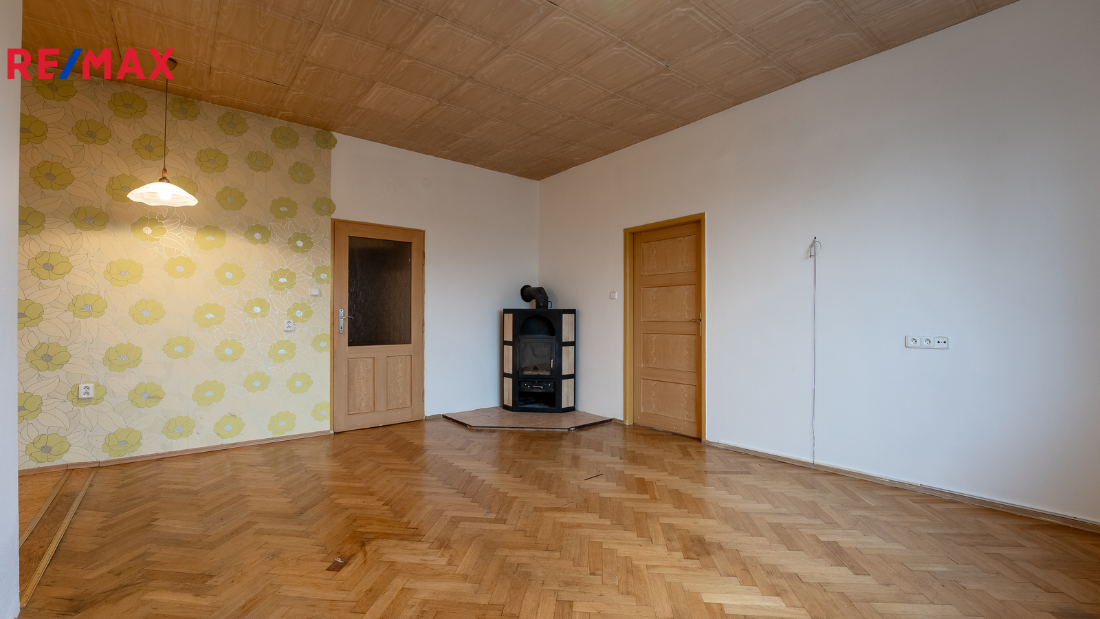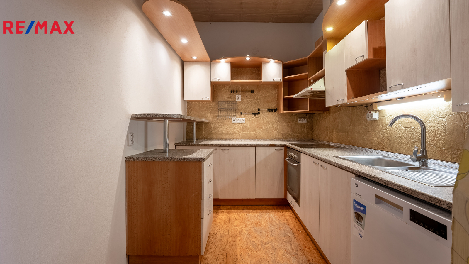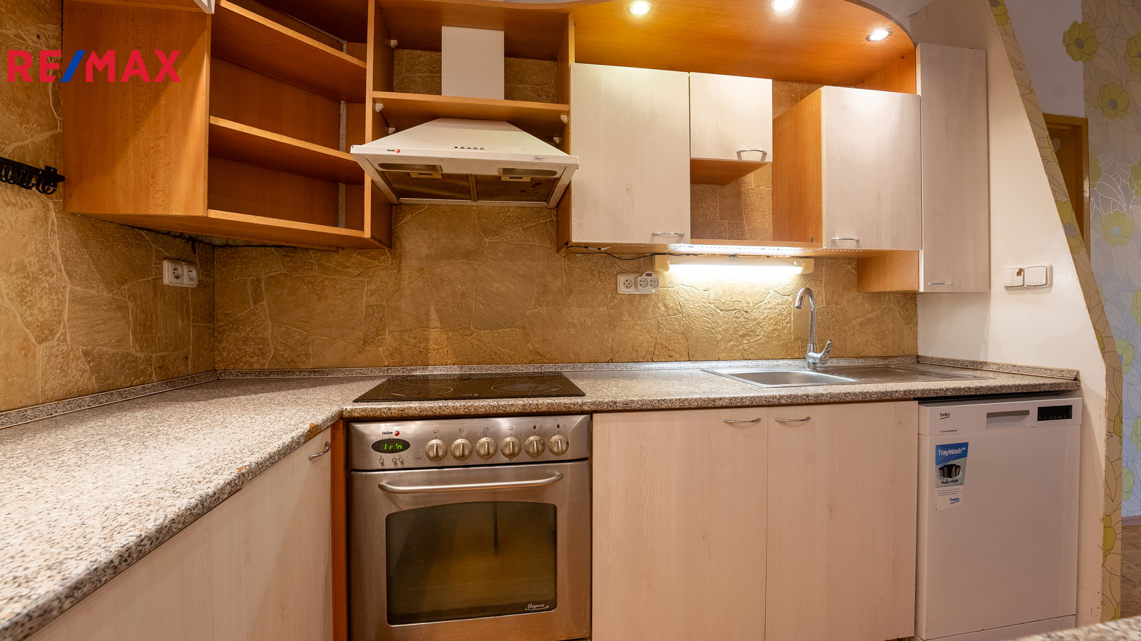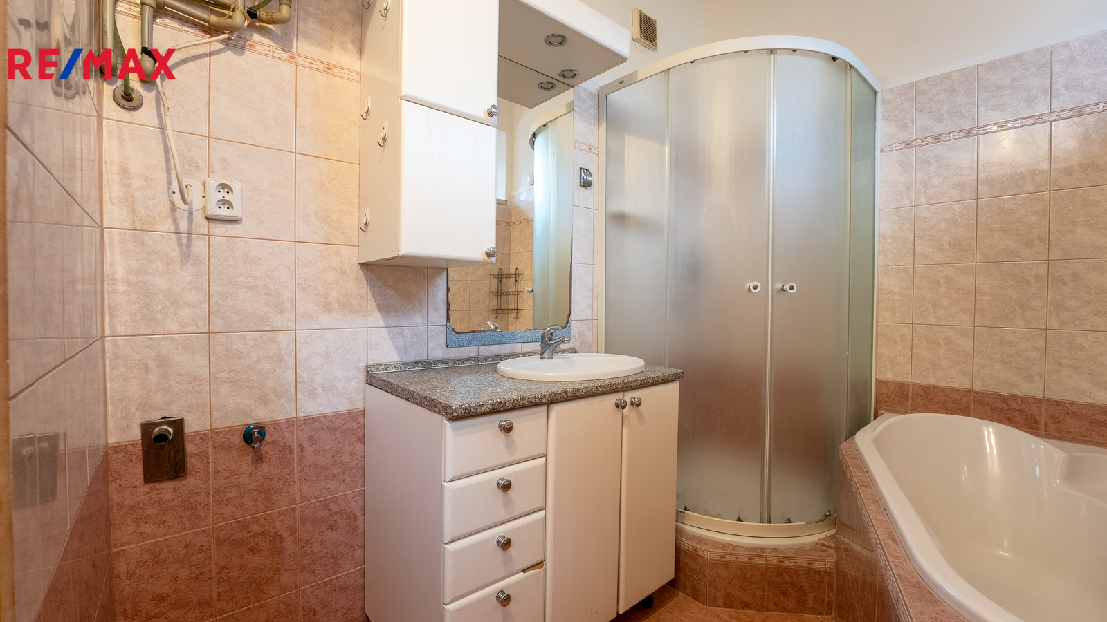 Interiér nabízí moderní koupelnu vybavenou sprchovým koutem i vanou. Na chodbě oceníte praktické vestavné skříně, které poskytují dostatek úložného prostoru. Vytápění je řešeno elektrokotlem a krbovými kamny, které dodávají bytu útulnou atmosféru. Samozřejmostí je také sklep o ploše 10 m².