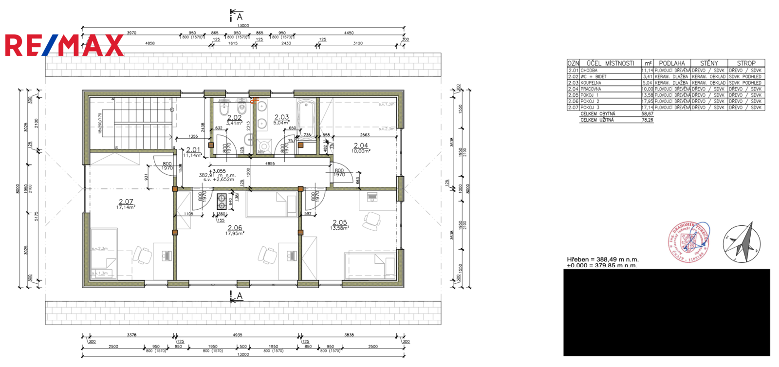Podkroví: Tři samostatné pokoje, pracovna, koupelna, samostatné WC – ideální kombinace klidu a soukromí.