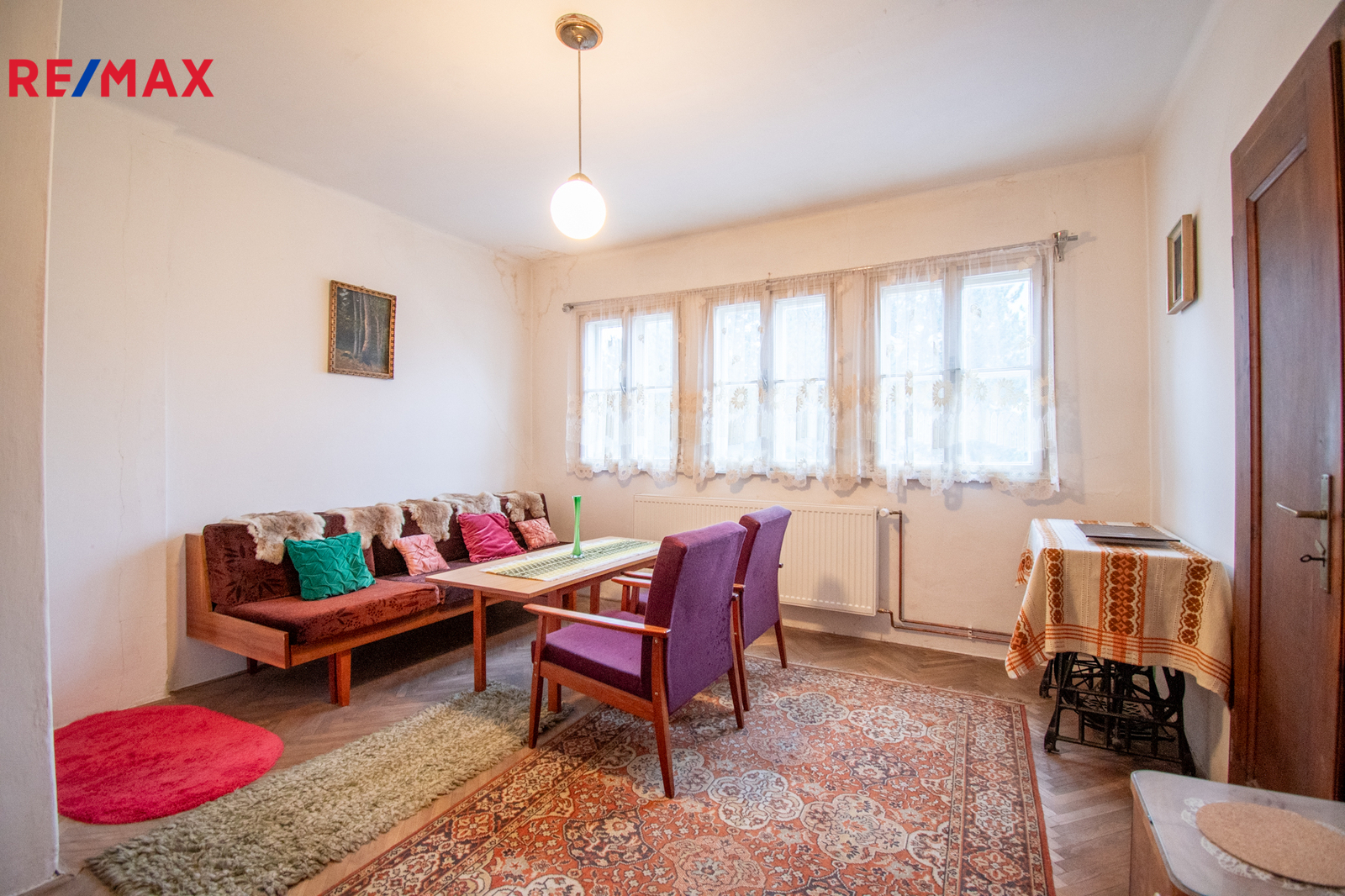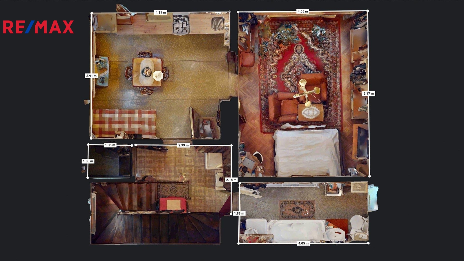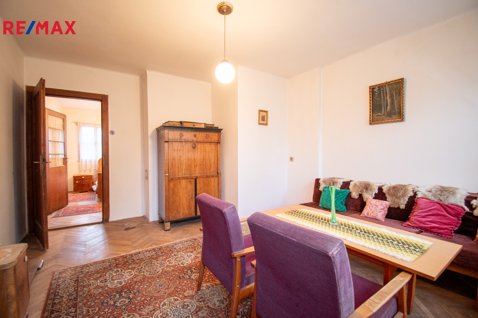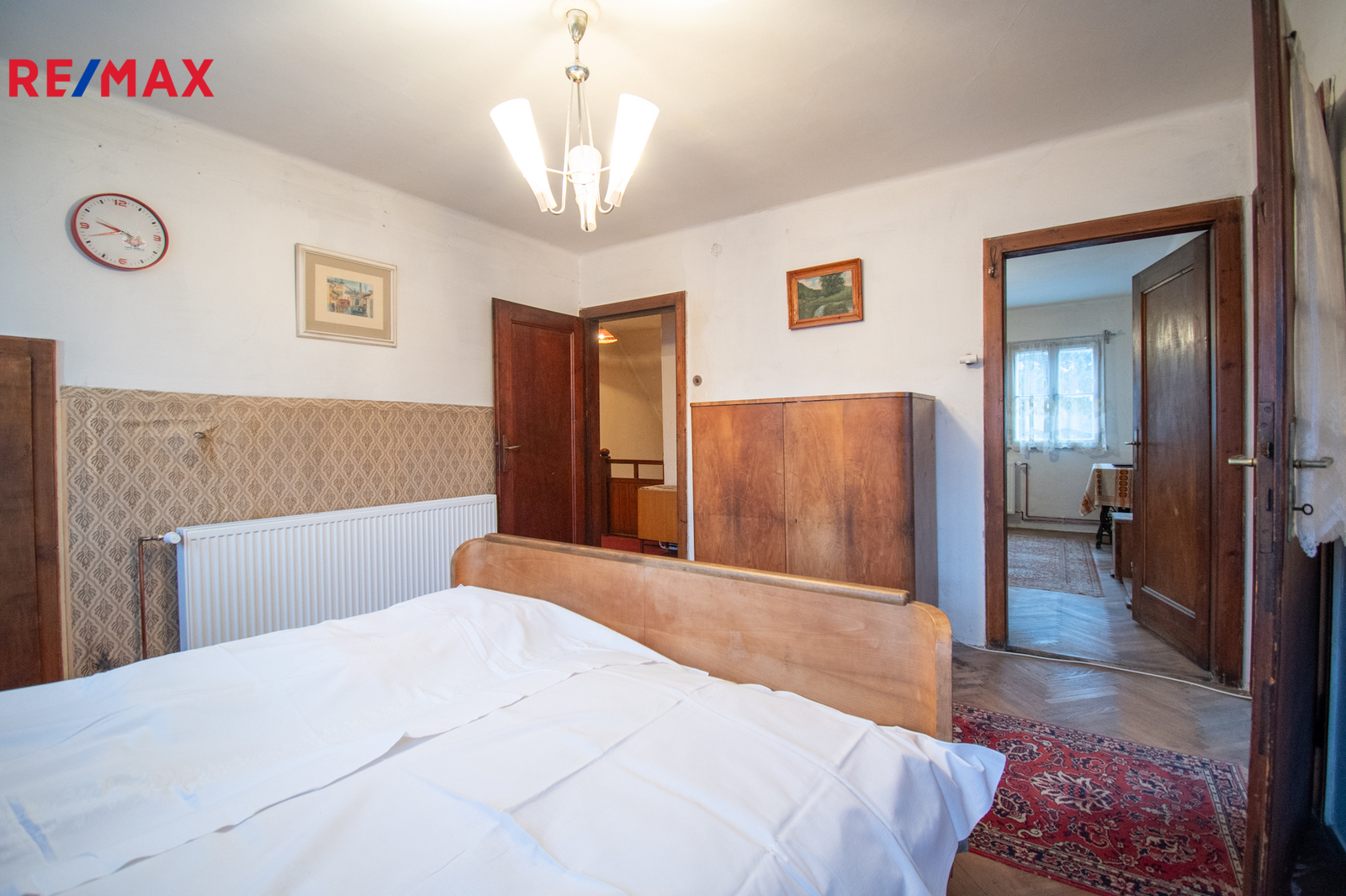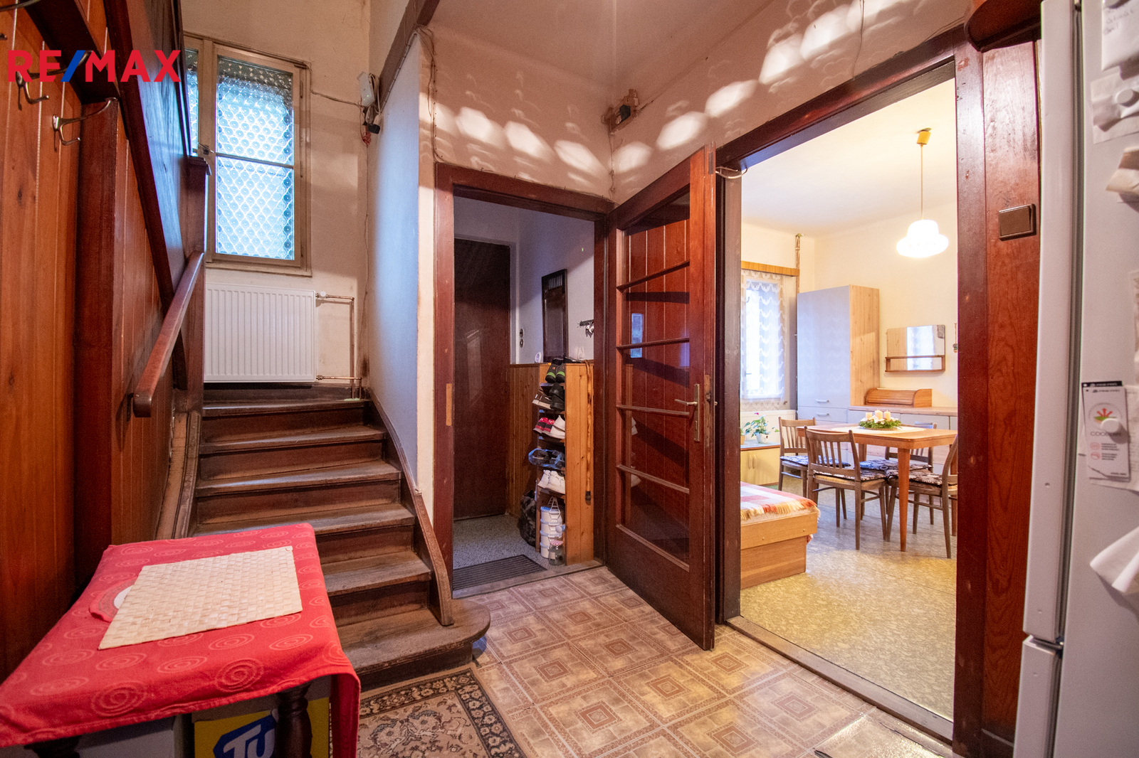 V přízemí se nachází kuchyně, obývací pokoj, koupelna s WC, vstupní hala se zádveřím, přímý vstup do sklepa, který je prostorný pod většinou stavby. Do patra vede původní dřevěné schodiště. V patře jsou dva průchozí pokoje s možností úpravy na neprůchozí, oba s vestavěnými šatnami což umožňuje moderní dispozici. Z jednoho pokoje je vstup na uzavřenou verandu, lze využít jako lodžii nebo další obytný pokoj. Dále se zde nachází místnost se vstupem do neobytného podkroví o výměře necelých dvacet pět metrů čtverečních, kde lze v rámci rekonstrukce vybudovat další koupelnu nebo obytný pokoj.