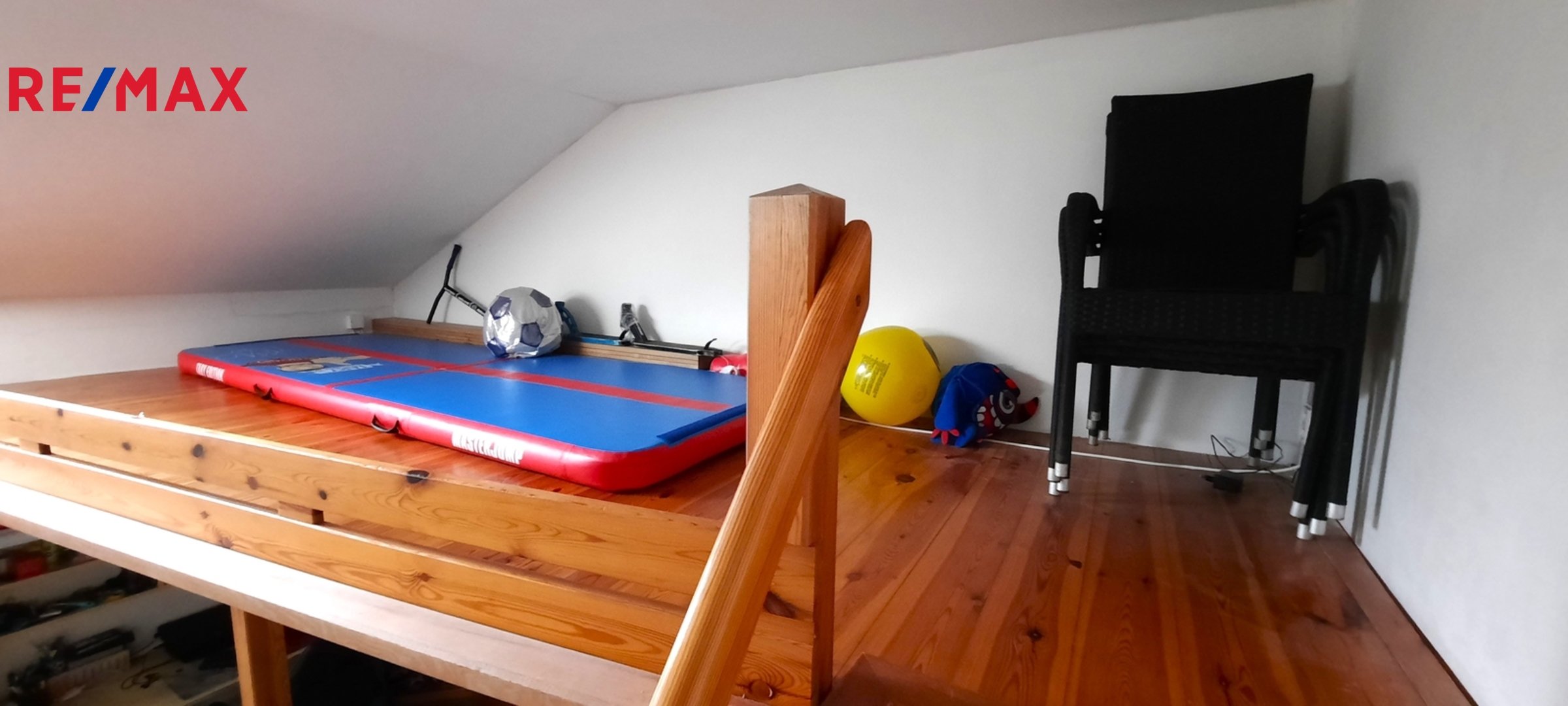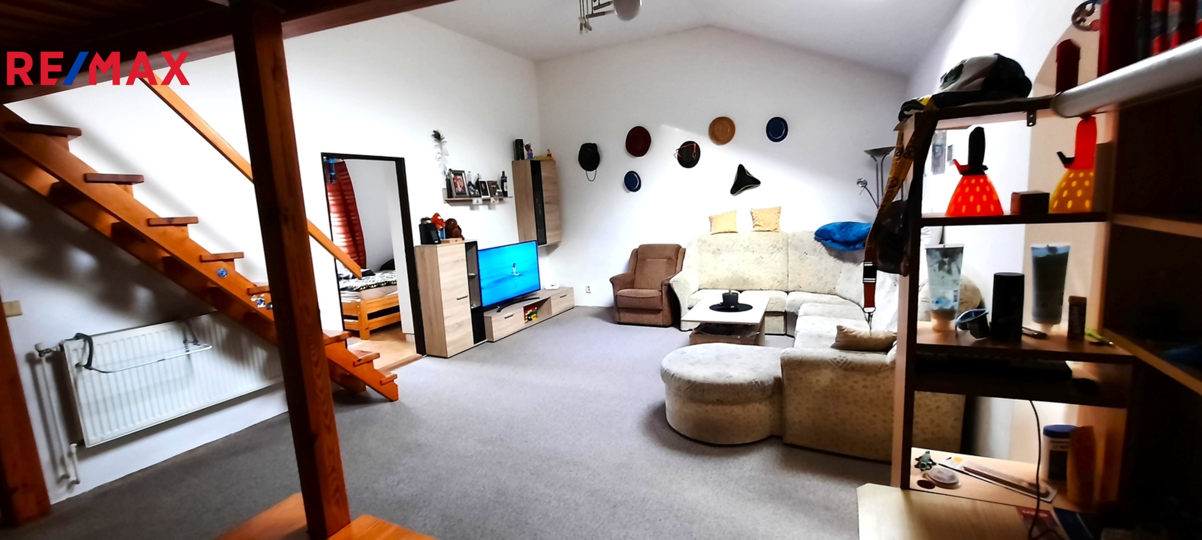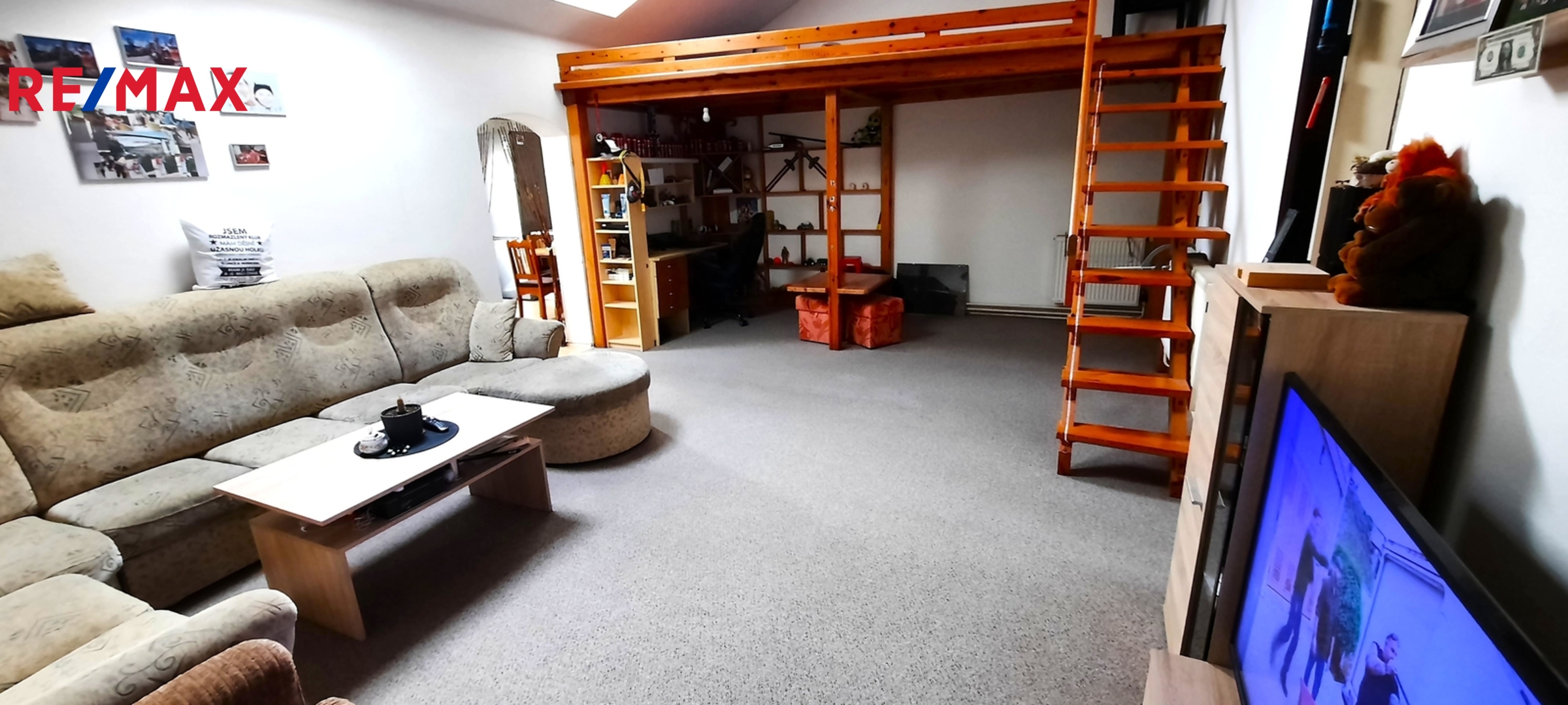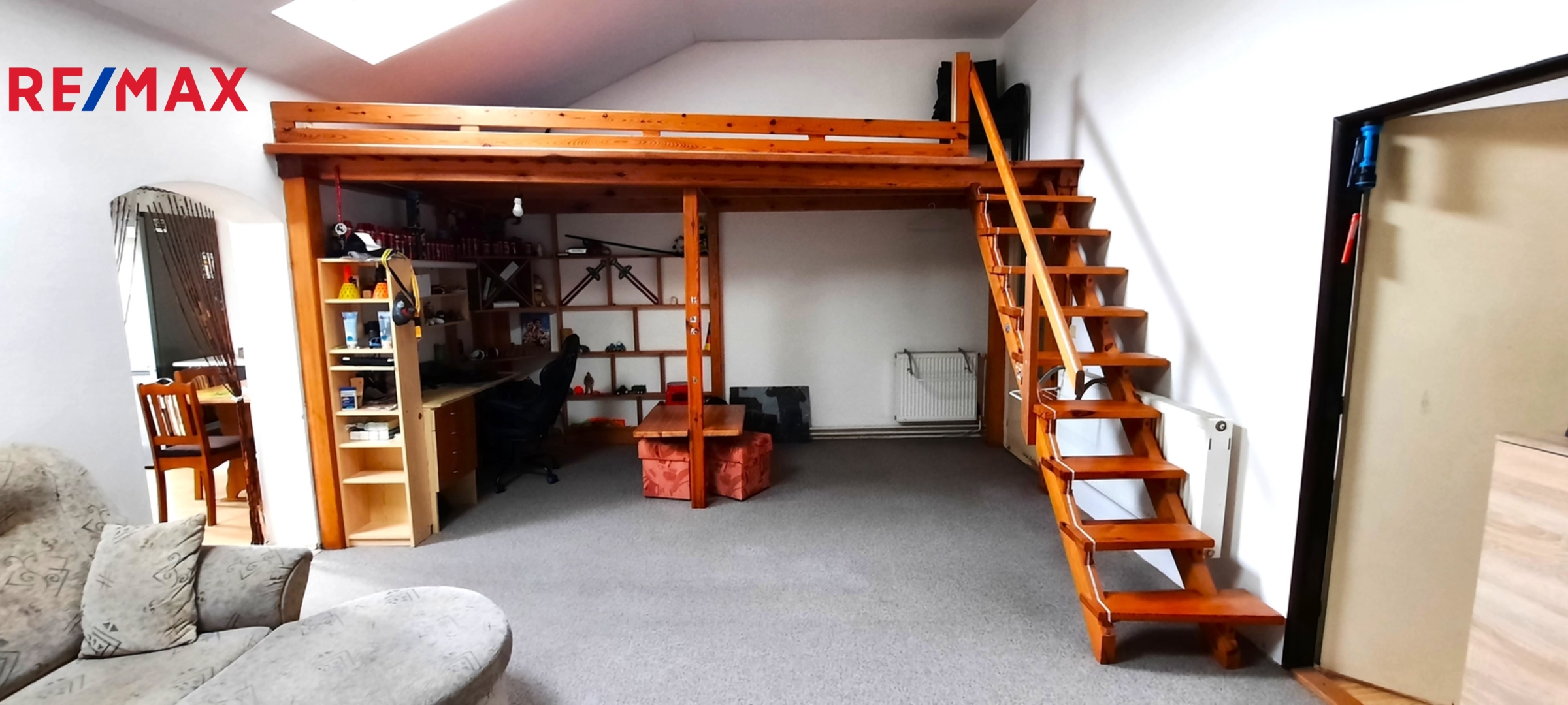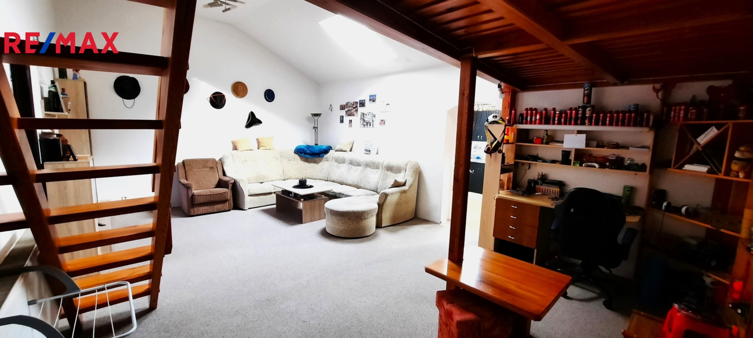 Dispozice domu: do domu se vchází předsíní, vedle které vlevo se nachází vcelku rozměrný úložný prostor. Z předsíně rovně se dostaneme do velikého obývacího pokoje, nad kterým se nachází zvýšené patro určené na spaní či například jako dětská herna. Z obývacího pokoje se dostaneme do další místnosti v současné době užívané jako ložnice. Dále se z obývacího pokoje vchází do kuchyně, z níž vedou prosklené dveře na malou zahrádku za domem. Z kuchyně je též vstup do koupelny s vanou a sprchovým koutem a dále na samostatné WC.