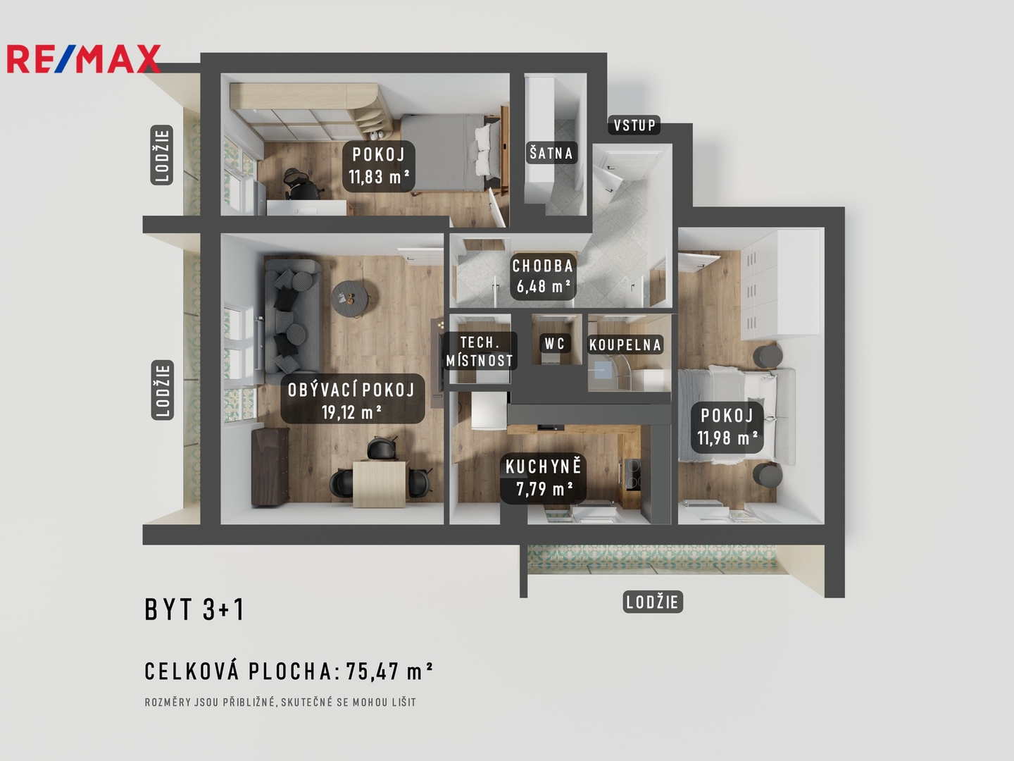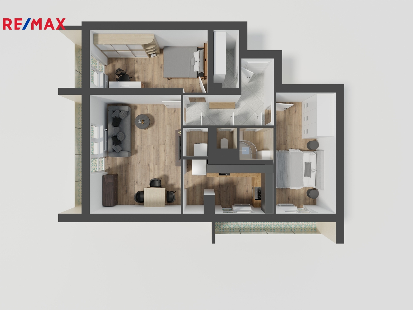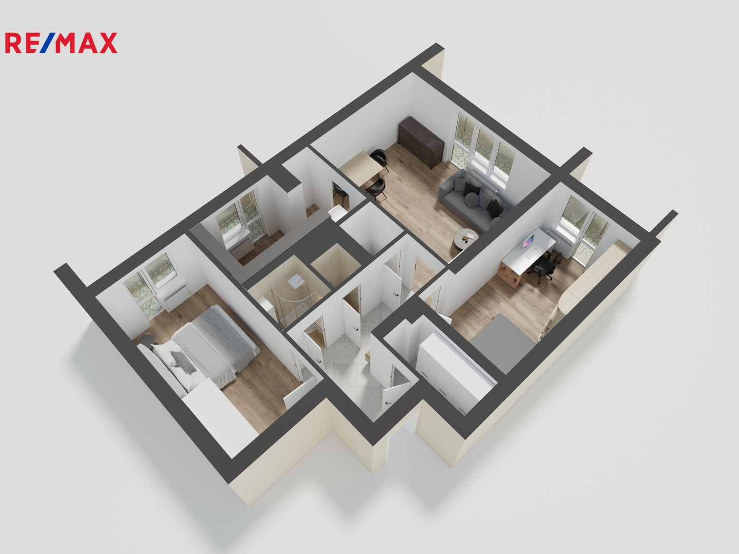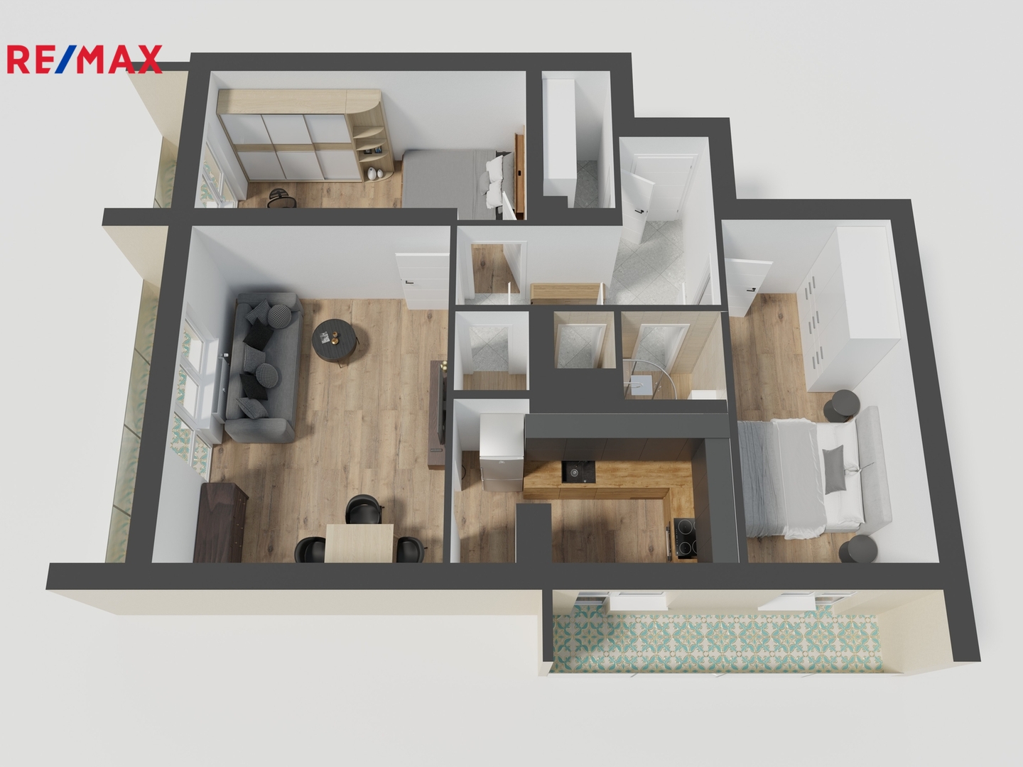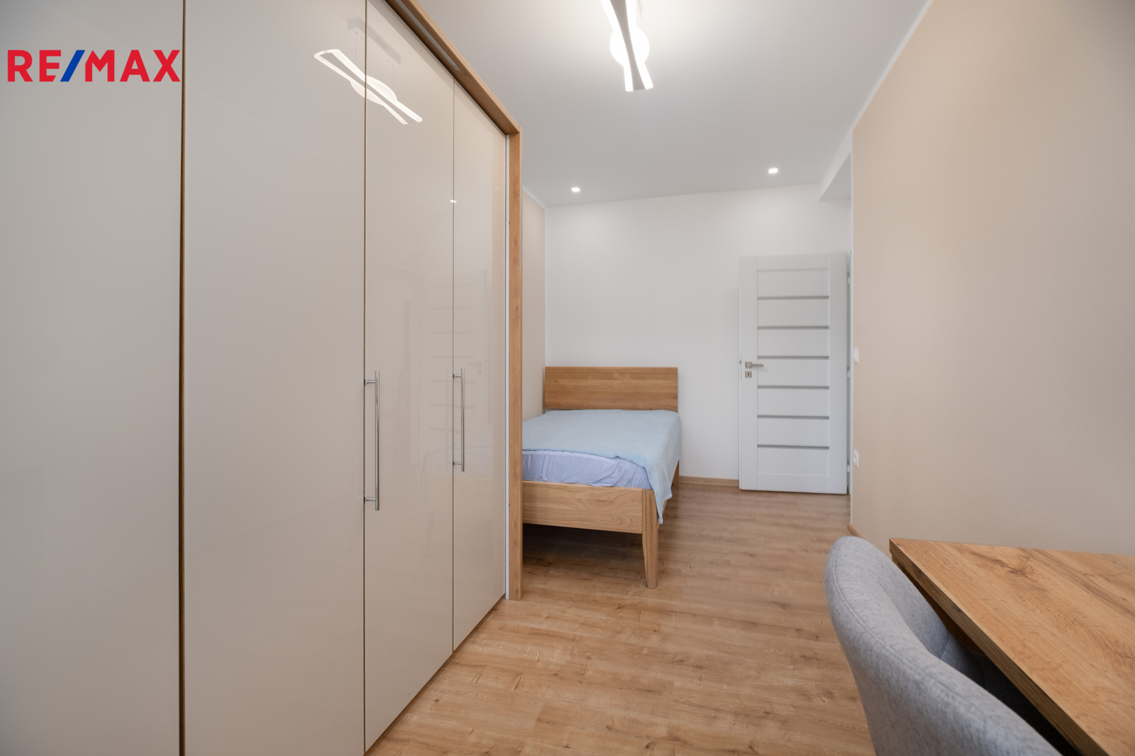 Dispozice bytu je promyšlená do posledního detailu – součástí je samostatná šatna i technická místnost, které výrazně zvyšují komfort bydlení a udržují interiér čistý a přehledný.
