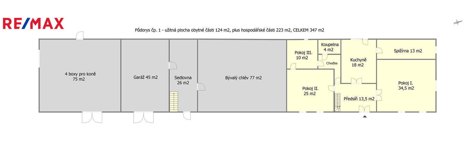 Původní statek čp.1 (dispoziční řešení 3+1, užitná plocha obytné části 124 m2, plus hospodářské části 223 m2) byl rozšířen o výminek čp. 13 (dispoziční řešení 2+1, užitná plocha obytné části 127 m2, plus kotelna 19 m2) a je ideální volbou pro vícegenerační rodinu, nebo zájemce o provozování agroturistiky s ubytováním pro hosty. Pro vytvoření dalších obytných místností, může v čp. 1 posloužit zvýšená půda, nebo bývalý chlév, nyní vytápěný funkčními radiátory. Vytápěná je i garáž.