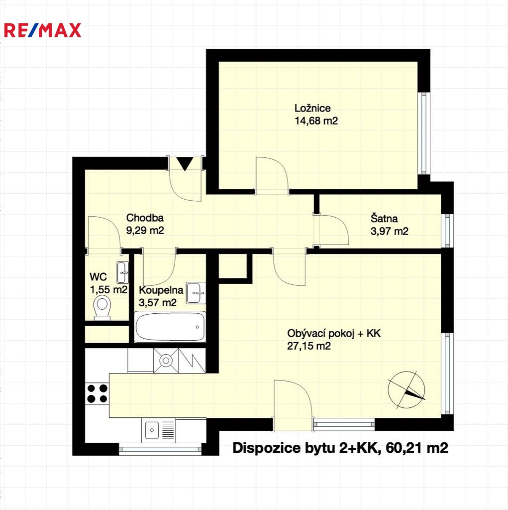 Dispozice bytu: vstupní chodba (9,29 m2), obývací pokoj s kuchyňským koutem (27,15 m2), ložnice (14,68 m2), šatna (3,97 m2), koupelna (3,57 m2), WC (1,55 m2).