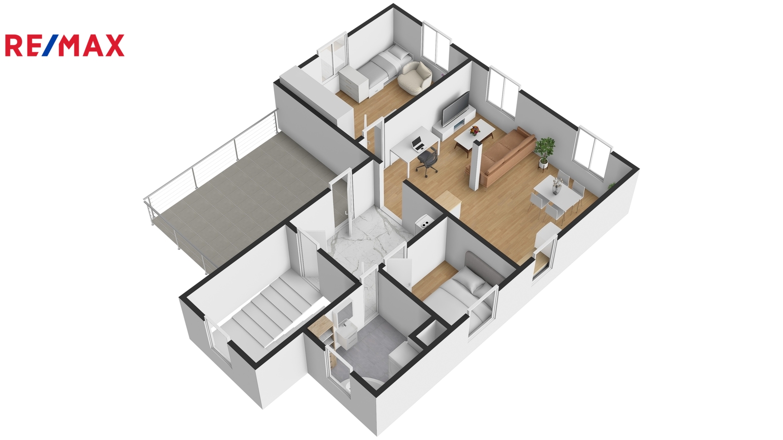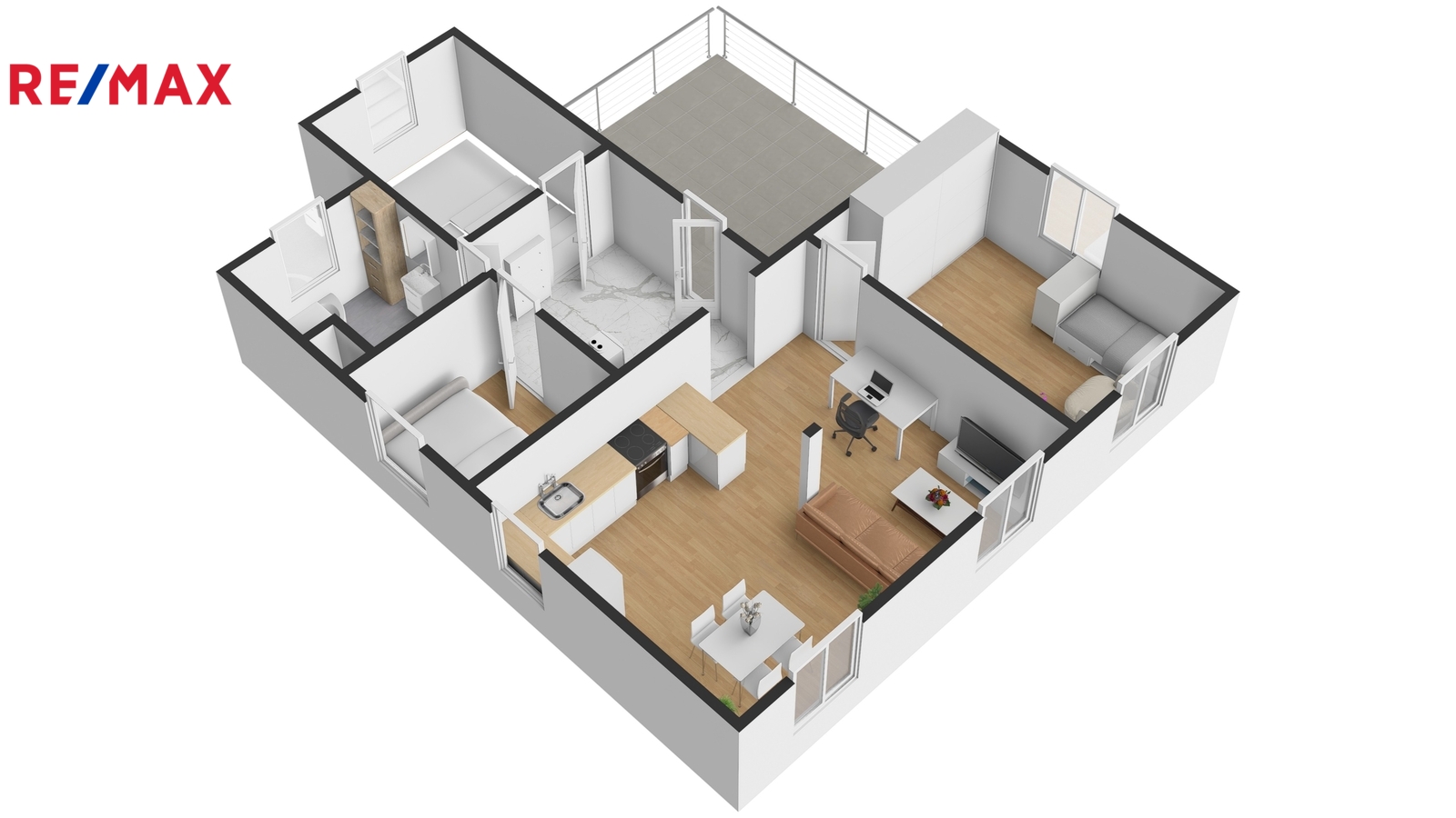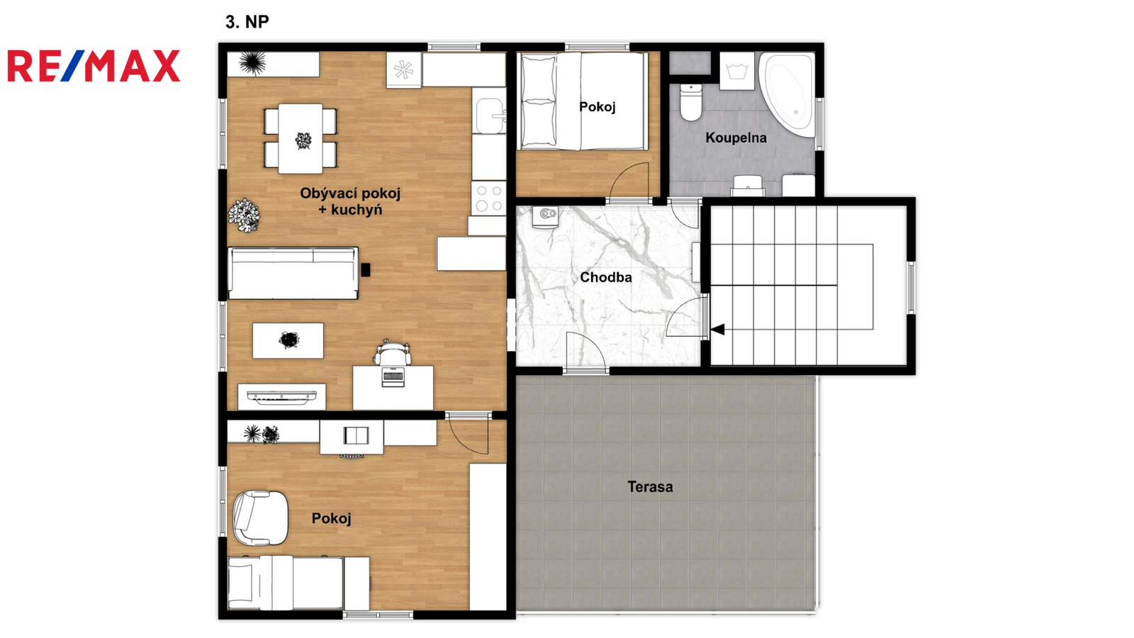 • 3. NP – byt 3+kk s terasou, podlahová plocha cca 60 m², po kompletní rekonstrukci, obsazen do 5–6/2026.